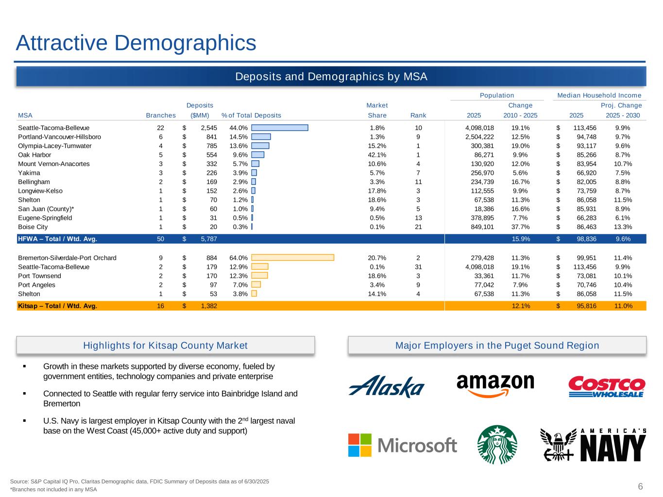 5 Geographic Fit and Strong Market Share ▪ Kitsap Bank is headquartered in Port Orchard, WA and has 17 banking offices (16 branches and 1 LPO in Bellevue) ▪ Extends HFWA footprint into adjacent markets of Kitsap, Jefferson and Clallam counties ▪ Market overlap with HFWA in 2 counties (Pierce and Mason) ▪ Plan to retain dba for “Kitsap Bank” for all offices except for overlapping locations of Tacoma, Gig Harbor and Bellevue Deposits for Kitsap Bank – By City and County Source: S&P Capital IQ Pro, FDIC Summary of Deposits data as of 6/30/2025 Note: All dollars in thousands Kitsap HFWA Kitsap Bank Total Market # of Deposits % of Market Deposits # Market Branches ($000) Total Rank ($000) Cities 1 Port Orchard, WA 3 277,887$ 20.1% 1 862,585$ 2 Bremerton, WA 2 193,689$ 14.0% 1 360,126$ 3 Silverdale, WA 1 141,353$ 10.2% 2 982,802$ 4 Gig Harbor, WA 1 118,725$ 8.6% 7 1,836,867$ 5 Bainbridge Island, WA 1 102,932$ 7.4% 5 1,077,341$ 6 Poulsbo, WA 1 99,806$ 7.2% 4 920,002$ 7 Port Townsend, WA 1 91,627$ 6.6% 4 673,397$ 8 Port Hadlock, WA 1 78,347$ 5.7% 2 172,823$ 9 Kingston, WA 1 68,450$ 5.0% 1 68,450$ 10 Tacoma, WA 1 59,786$ 4.3% 12 6,139,438$ 11 Belfair, WA 1 53,044$ 3.8% 1 138,068$ 12 Sequim, WA 1 50,439$ 3.6% 9 1,343,683$ 13 Port Angeles, WA 1 46,206$ 3.3% 7 1,266,986$ Total – Cities 16 1,382,291$ 100.0% 15,842,568$ Counties 1 Kitsap, WA 9 884,117$ 64.0% 2 4,271,306$ 2 Pierce, WA 2 178,511$ 12.9% 12 15,115,977$ 3 Jefferson, WA 2 169,974$ 12.3% 3 913,503$ 4 Clallam, WA 2 96,645$ 7.0% 9 2,821,339$ 5 Mason, WA 1 53,044$ 3.8% 4 375,932$ Total – Counties 16 1,382,291$ 100.0% 23,498,057$