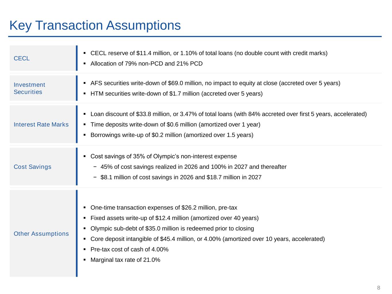 7 Transaction Structure and Overview Structure ▪ Olympic Bancorp, Inc. (“Olympic”) will merge into Heritage Financial Corporation (“HFWA”) ▪ Kitsap Bank (“Kitsap”) will merge into Heritage Bank (“HB”) Consideration ▪ 100% stock consideration ▪ Approximately 7.2 million shares of HFWA issued to Olympic shareholders ▪ Fixed exchange ratio of 45.0x Transaction Value1 ▪ $176.6 million in aggregate consideration for Olympic Transaction Multiples ▪ Price / TBV: 151% ▪ Price / TBV (Excluding AOCI): 103% ▪ Price / 2025E Core EPS2: 20.4x ▪ Price / 2025E Core EPS2 + cost savings3: 7.8x Ownership and Board ▪ Pro forma ownership of 82.6% HFWA / 17.4% Olympic ▪ No changes to HFWA board of directors Approvals ▪ Subject to HFWA and Olympic shareholder approvals and customary regulatory approvals ▪ Voting agreements have been signed by HFWA’s and Olympic’s boards of directors Timing ▪ Anticipated closing in Q1 2026 (1) Based on HFWA’s stock price of $24.64 as of 9/24/2025 (2) Adjusted to exclude employee retention tax credit received in Q2 2025 (3) Assumes cost savings are fully realized for illustrative purposes