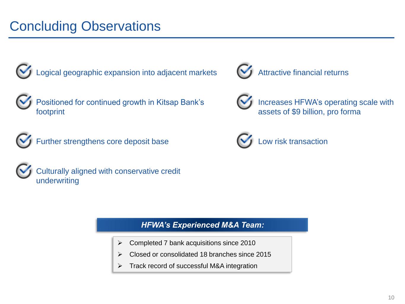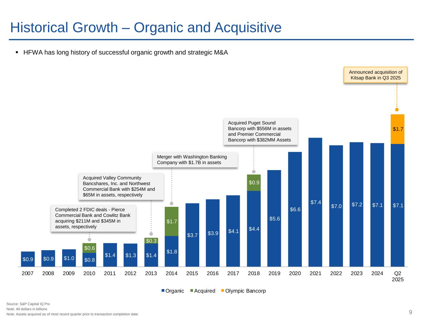 9 $0.9 $0.9 $1.0 $0.8 $1.4 $1.3 $1.4 $1.8 $3.7 $3.9 $4.1 $4.4 $5.6 $6.6 $7.4 $7.0 $7.2 $7.1 $7.1 $0.6 $0.3 $1.7 $0.9 $1.7 2007 2008 2009 2010 2011 2012 2013 2014 2015 2016 2017 2018 2019 2020 2021 2022 2023 2024 Q2 2025 Organic Acquired Olympic Bancorp Source: S&P Capital IQ Pro Note: All dollars in billions Note: Assets acquired as of most recent quarter prior to transaction completion date Historical Growth – Organic and Acquisitive ▪ HFWA has long history of successful organic growth and strategic M&A Completed 2 FDIC deals - Pierce Commercial Bank and Cowlitz Bank acquiring $211M and $345M in assets, respectively Acquired Valley Community Bancshares, Inc. and Northwest Commercial Bank with $254M and $65M in assets, respectively Merger with Washington Banking Company with $1.7B in assets Acquired Puget Sound Bancorp with $556M in assets and Premier Commercial Bancorp with $382MM Assets Announced acquisition of Kitsap Bank in Q3 2025