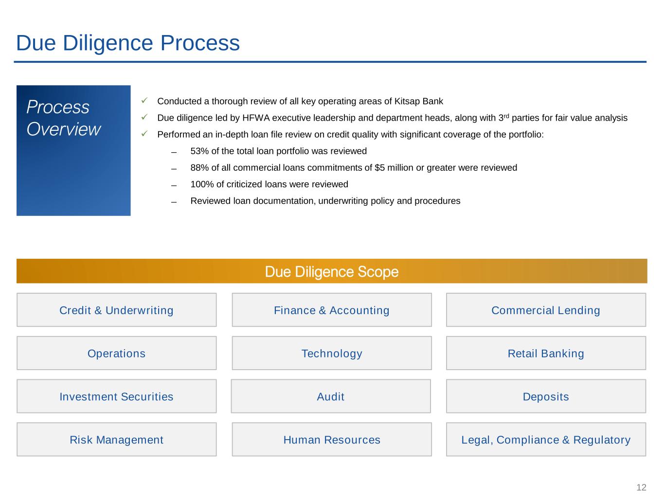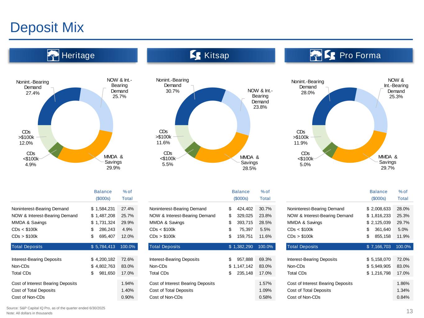 12 Due Diligence Process Process Overview ✓ Conducted a thorough review of all key operating areas of Kitsap Bank ✓ Due diligence led by HFWA executive leadership and department heads, along with 3rd parties for fair value analysis ✓ Performed an in-depth loan file review on credit quality with significant coverage of the portfolio: ̶ 53% of the total loan portfolio was reviewed ̶ 88% of all commercial loans commitments of $5 million or greater were reviewed ̶ 100% of criticized loans were reviewed ̶ Reviewed loan documentation, underwriting policy and procedures Due Diligence Scope Credit & Underwriting Commercial LendingFinance & Accounting Operations Retail BankingTechnology Investment Securities DepositsAudit Risk Management Legal, Compliance & RegulatoryHuman Resources