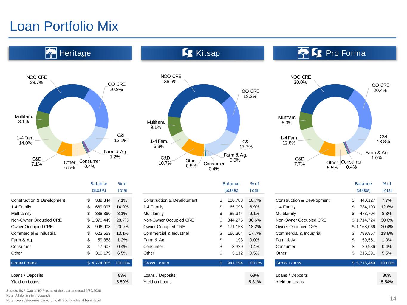 13 Source: S&P Capital IQ Pro, as of the quarter ended 6/30/2025 Note: All dollars in thousands Deposit Mix Heritage Kitsap Pro Forma Balance % of Balance % of Balance % of ($000s) Total ($000s) Total ($000s) Total Noninterest-Bearing Demand 1,584,231$ 27.4% Noninterest-Bearing Demand 424,402$ 30.7% Noninterest-Bearing Demand 2,008,633$ 28.0% NOW & Interest-Bearing Demand 1,487,208$ 25.7% NOW & Interest-Bearing Demand 329,025$ 23.8% NOW & Interest-Bearing Demand 1,816,233$ 25.3% MMDA & Savings 1,731,324$ 29.9% MMDA & Savings 393,715$ 28.5% MMDA & Savings 2,125,039$ 29.7% CDs < $100k 286,243$ 4.9% CDs < $100k 75,397$ 5.5% CDs < $100k 361,640$ 5.0% CDs > $100k 695,407$ 12.0% CDs > $100k 159,751$ 11.6% CDs > $100k 855,158$ 11.9% Total Deposits 5,784,413$ 100.0% Total Deposits 1,382,290$ 100.0% Total Deposits 7,166,703$ 100.0% Interest-Bearing Deposits 4,200,182$ 72.6% Interest-Bearing Deposits 957,888$ 69.3% Interest-Bearing Deposits 5,158,070$ 72.0% Non-CDs 4,802,763$ 83.0% Non-CDs 1,147,142$ 83.0% Non-CDs 5,949,905$ 83.0% Total CDs 981,650$ 17.0% Total CDs 235,148$ 17.0% Total CDs 1,216,798$ 17.0% Cost of Interest Bearing Deposits 1.94% Cost of Interest Bearing Deposits 1.57% Cost of Interest Bearing Deposits 1.86% Cost of Total Deposits 1.40% Cost of Total Deposits 1.09% Cost of Total Deposits 1.34% Cost of Non-CDs 0.90% Cost of Non-CDs 0.58% Cost of Non-CDs 0.84% Nonint.-Bearing Demand 27.4% NOW & Int.- Bearing Demand 25.7% MMDA & Savings 29.9% CDs <$100k 4.9% CDs >$100k 12.0% Nonint.-Bearing Demand 28.0% NOW & Int.-Bearing Demand 25.3% MMDA & Savings 29.7% CDs <$100k 5.0% CDs >$100k 11.9% Nonint.-Bearing Demand 30.7% NOW & Int.- Bearing Demand 23.8% MMDA & Savings 28.5% CDs <$100k 5.5% CDs >$100k 11.6%