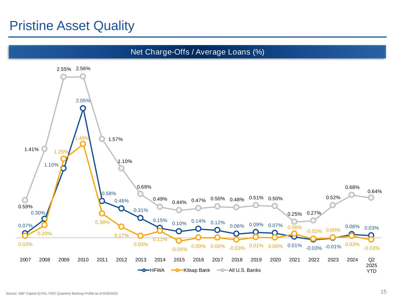 14 C&D 7.1% 1-4 Fam. 14.0% Multifam. 8.1% NOO CRE 28.7% OO CRE 20.9% C&I 13.1% Farm & Ag. 1.2% Consumer 0.4% Other 6.5% C&D 10.7% 1-4 Fam. 6.9% Multifam. 9.1% NOO CRE 36.6% OO CRE 18.2% C&I 17.7% Farm & Ag. 0.0% Consumer 0.4% Other 0.5% C&D 7.7% 1-4 Fam. 12.8% Multifam. 8.3% NOO CRE 30.0% OO CRE 20.4% C&I 13.8% Farm & Ag. 1.0% Consumer 0.4% Other 5.5% Source: S&P Capital IQ Pro, as of the quarter ended 6/30/2025 Note: All dollars in thousands Note: Loan categories based on call report codes at bank-level Loan Portfolio Mix Heritage Kitsap Pro Forma Balance % of Balance % of Balance % of ($000s) Total ($000s) Total ($000s) Total Construction & Development 339,344$ 7.1% Construction & Development 100,783$ 10.7% Construction & Development 440,127$ 7.7% 1-4 Family 669,097$ 14.0% 1-4 Family 65,096$ 6.9% 1-4 Family 734,193$ 12.8% Multifamily 388,360$ 8.1% Multifamily 85,344$ 9.1% Multifamily 473,704$ 8.3% Non-Owner Occupied CRE 1,370,449$ 28.7% Non-Owner Occupied CRE 344,275$ 36.6% Non-Owner Occupied CRE 1,714,724$ 30.0% Owner-Occupied CRE 996,908$ 20.9% Owner-Occupied CRE 171,158$ 18.2% Owner-Occupied CRE 1,168,066$ 20.4% Commercial & Industrial 623,553$ 13.1% Commercial & Industrial 166,304$ 17.7% Commercial & Industrial 789,857$ 13.8% Farm & Ag. 59,358$ 1.2% Farm & Ag. 193$ 0.0% Farm & Ag. 59,551$ 1.0% Consumer 17,607$ 0.4% Consumer 3,329$ 0.4% Consumer 20,936$ 0.4% Other 310,179$ 6.5% Other 5,112$ 0.5% Other 315,291$ 5.5% Gross Loans 4,774,855$ 100.0% Gross Loans 941,594$ 100.0% Gross Loans 5,716,449$ 100.0% Loans / Deposits 83% Loans / Deposits 68% Loans / Deposits 80% Yield on Loans 5.50% Yield on Loans 5.81% Yield on Loans 5.54%
