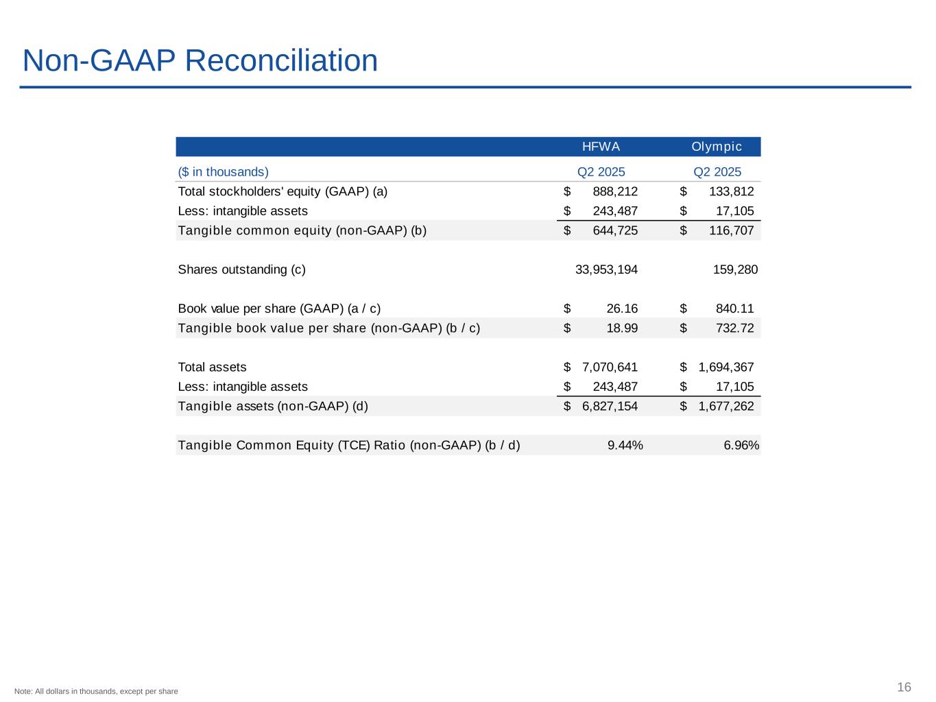 16Note: All dollars in thousands, except per share Non-GAAP Reconciliation HFWA Olympic ($ in thousands) Q2 2025 Q2 2025 Total stockholders' equity (GAAP) (a) 888,212$ 133,812$ Less: intangible assets 243,487$ 17,105$ Tangible common equity (non-GAAP) (b) 644,725$ 116,707$ Shares outstanding (c) 33,953,194 159,280 Book value per share (GAAP) (a / c) 26.16$ 840.11$ Tangible book value per share (non-GAAP) (b / c) 18.99$ 732.72$ Total assets 7,070,641$ 1,694,367$ Less: intangible assets 243,487$ 17,105$ Tangible assets (non-GAAP) (d) 6,827,154$ 1,677,262$ Tangible Common Equity (TCE) Ratio (non-GAAP) (b / d) 9.44% 6.96%