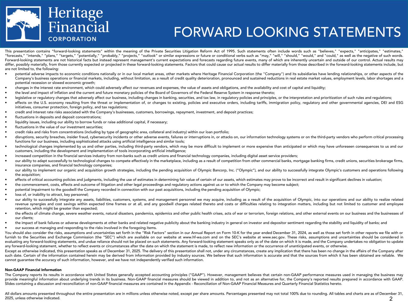 2 This presentation contains “forward-looking statements” within the meaning of the Private Securities Litigation Reform Act of 1995. Such statements often include words such as "believes," "expects," "anticipates," "estimates," “forecasts,” "intends," “plans,” “targets,” “potentially,” “probably,” “projects,” “outlook” or similar expressions or future or conditional verbs such as “may,” "will," “should,” "would," and "could," as well as the negative of such words. Forward-looking statements are not historical facts but instead represent management's current expectations and forecasts regarding future events, many of which are inherently uncertain and outside of our control. Actual results may differ, possibly materially, from those currently expected or projected in these forward-looking statements. Factors that could cause our actual results to differ materially from those described in the forward-looking statements include, but are not limited to, the following: • potential adverse impacts to economic conditions nationally or in our local market areas, other markets where Heritage Financial Corporation (the "Company") and its subsidiaries have lending relationships, or other aspects of the Company’s business operations or financial markets, including, without limitation, as a result of credit quality deterioration, pronounced and sustained reductions in real estate market values, employment levels, labor shortages and a potential recession or slowed economic growth; • changes in the interest rate environment, which could adversely affect our revenues and expenses, the value of assets and obligations, and the availability and cost of capital and liquidity; • the level and impact of inflation and the current and future monetary policies of the Board of Governors of the Federal Reserve System in response thereto; • legislative or regulatory changes that adversely affect our business, including changes in banking, securities, and tax law, in regulatory policies and principles, or the interpretation and prioritization of such rules and regulations; • effects on the U.S. economy resulting from the threat or implementation of, or changes to existing, policies and executive orders, including tariffs, immigration policy, regulatory and other governmental agencies, DEI and ESG initiatives, consumer protection, foreign policy, and tax regulations; • credit and interest rate risks associated with the Company’s businesses, customers, borrowings, repayment, investment, and deposit practices; • fluctuations in deposits and deposit concentrations; • liquidity issues, including our ability to borrow funds or raise additional capital, if necessary; • fluctuations in the value of our investment securities; • credit risks and risks from concentrations (including by type of geographic area, collateral and industry) within our loan portfolio; • disruptions, security breaches, insider fraud, cybersecurity incidents or other adverse events, failures or interruptions in, or attacks on, our information technology systems or on the third-party vendors who perform critical processing functions for our business, including sophisticated attacks using artificial intelligence and similar tools; • technological changes implemented by us and other parties, including third-party vendors, which may be more difficult to implement or more expensive than anticipated or which may have unforeseen consequences to us and our customers, including the development and implementation of tools incorporating artificial intelligence; • increased competition in the financial services industry from non-banks such as credit unions and financial technology companies, including digital asset service providers; • our ability to adapt successfully to technological changes to compete effectively in the marketplace, including as a result of competition from other commercial banks, mortgage banking firms, credit unions, securities brokerage firms, insurance companies, and financial technology companies; • our ability to implement our organic and acquisition growth strategies, including the pending acquisition of Olympic Bancorp, Inc. (“Olympic”), and our ability to successfully integrate Olympic's customers and operations following the acquisition; • effects of critical accounting policies and judgments, including the use of estimates in determining fair value of certain of our assets, which estimates may prove to be incorrect and result in significant declines in valuation; • the commencement, costs, effects and outcome of litigation and other legal proceedings and regulatory actions against us or to which the Company may become subject; • potential impairment to the goodwill the Company recorded in connection with our past acquisitions, including the pending acquisition of Olympic; • loss of, or inability to attract, key personnel; • our ability to successfully integrate any assets, liabilities, customers, systems, and management personnel we may acquire, including as a result of the acquisition of Olympic, into our operations and our ability to realize related revenue synergies and cost savings within expected time frames or at all, and any goodwill charges related thereto and costs or difficulties relating to integration matters, including but not limited to customer and employee retention, which might be greater than expected; • the effects of climate change, severe weather events, natural disasters, pandemics, epidemics and other public health crises, acts of war or terrorism, foreign relations, and other external events on our business and the businesses of our clients; • the impact of bank failures or adverse developments at other banks and related negative publicity about the banking industry in general on investor and depositor sentiment regarding the stability and liquidity of banks; and • our success at managing and responding to the risks