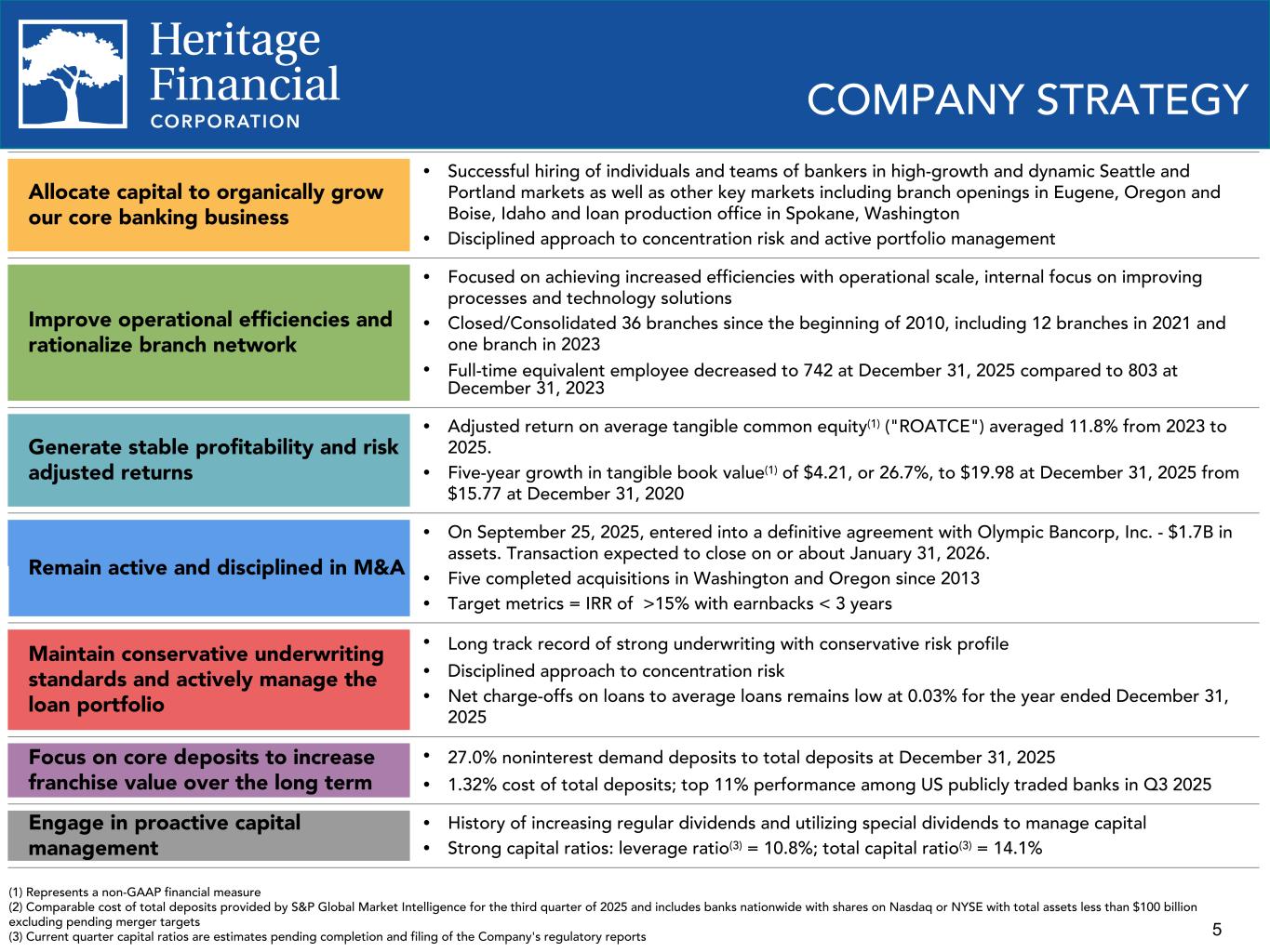 2 This presentation contains “forward-looking statements” within the meaning of the Private Securities Litigation Reform Act of 1995. Such statements often include words such as "believes," "expects," "anticipates," "estimates," “forecasts,” "intends," “plans,” “targets,” “potentially,” “probably,” “projects,” “outlook” or similar expressions or future or conditional verbs such as “may,” "will," “should,” "would," and "could," as well as the negative of such words. Forward-looking statements are not historical facts but instead represent management's current expectations and forecasts regarding future events, many of which are inherently uncertain and outside of our control. Actual results may differ, possibly materially, from those currently expected or projected in these forward-looking statements. Factors that could cause our actual results to differ materially from those described in the forward-looking statements include, but are not limited to, the following: • potential adverse impacts to economic conditions nationally or in our local market areas, other markets where Heritage Financial Corporation (the "Company") and its subsidiaries have lending relationships, or other aspects of the Company’s business operations or financial markets, including, without limitation, as a result of credit quality deterioration, pronounced and sustained reductions in real estate market values, employment levels, labor shortages and a potential recession or slowed economic growth; • changes in the interest rate environment, which could adversely affect our revenues and expenses, the value of assets and obligations, and the availability and cost of capital and liquidity; • the level and impact of inflation and the current and future monetary policies of the Board of Governors of the Federal Reserve System in response thereto; • legislative or regulatory changes that adversely affect our business, including changes in banking, securities, and tax law, in regulatory policies and principles, or the interpretation and prioritization of such rules and regulations; • effects on the U.S. economy resulting from the threat or implementation of, or changes to existing, policies and executive orders, including tariffs, immigration policy, regulatory and other governmental agencies, DEI and ESG initiatives, consumer protection, foreign policy, and tax regulations; • credit and interest rate risks associated with the Company’s businesses, customers, borrowings, repayment, investment, and deposit practices; • fluctuations in deposits and deposit concentrations; • liquidity issues, including our ability to borrow funds or raise additional capital, if necessary; • fluctuations in the value of our investment securities; • credit risks and risks from concentrations (including by type of geographic area, collateral and industry) within our loan portfolio; • disruptions, security breaches, insider fraud, cybersecurity incidents or other adverse events, failures or interruptions in, or attacks on, our information technology systems or on the third-party vendors who perform critical processing functions for our business, including sophisticated attacks using artificial intelligence and similar tools; • technological changes implemented by us and other parties, including third-party vendors, which may be more difficult to implement or more expensive than anticipated or which may have unforeseen consequences to us and our customers, including the development and implementation of tools incorporating artificial intelligence; • increased competition in the financial services industry from non-banks such as credit unions and financial technology companies, including digital asset service providers; • our ability to adapt successfully to technological changes to compete effectively in the marketplace, including as a result of competition from other commercial banks, mortgage banking firms, credit unions, securities brokerage firms, insurance companies, and financial technology companies; • our ability to implement our organic and acquisition growth strategies, including the pending acquisition of Olympic Bancorp, Inc. (“Olympic”), and our ability to successfully integrate Olympic's customers and operations following the acquisition; • effects of critical accounting policies and judgments, including the use of estimates in determining fair value of certain of our assets, which estimates may prove to be incorrect and result in significant declines in valuation; • the commencement, costs, effects and outcome of litigation and other legal proceedings and regulatory actions against us or to which the Company may become subject; • potential impairment to the goodwill the Company recorded in connection with our past acquisitions, including the pending acquisition of Olympic; • loss of, or inability to attract, key personnel; • our ability to successfully integrate any assets, liabilities, customers, systems, and management personnel we may acquire, including as a result of the acquisition of Olympic, into our operations and our ability to realize related revenue synergies and cost savings within expected time frames or at all, and any goodwill charges related thereto and costs or difficulties relating to integration matters, including but not limited to customer and employee retention, which might be greater than expected; • the effects of climate change, severe weather events, natural disasters, pandemics, epidemics and other public health crises, acts of war or terrorism, foreign relations, and other external events on our business and the businesses of our clients; • the impact of bank failures or adverse developments at other banks and related negative publicity about the banking industry in general on investor and depositor sentiment regarding the stability and liquidity of banks; and • our success at managing and responding to the risks