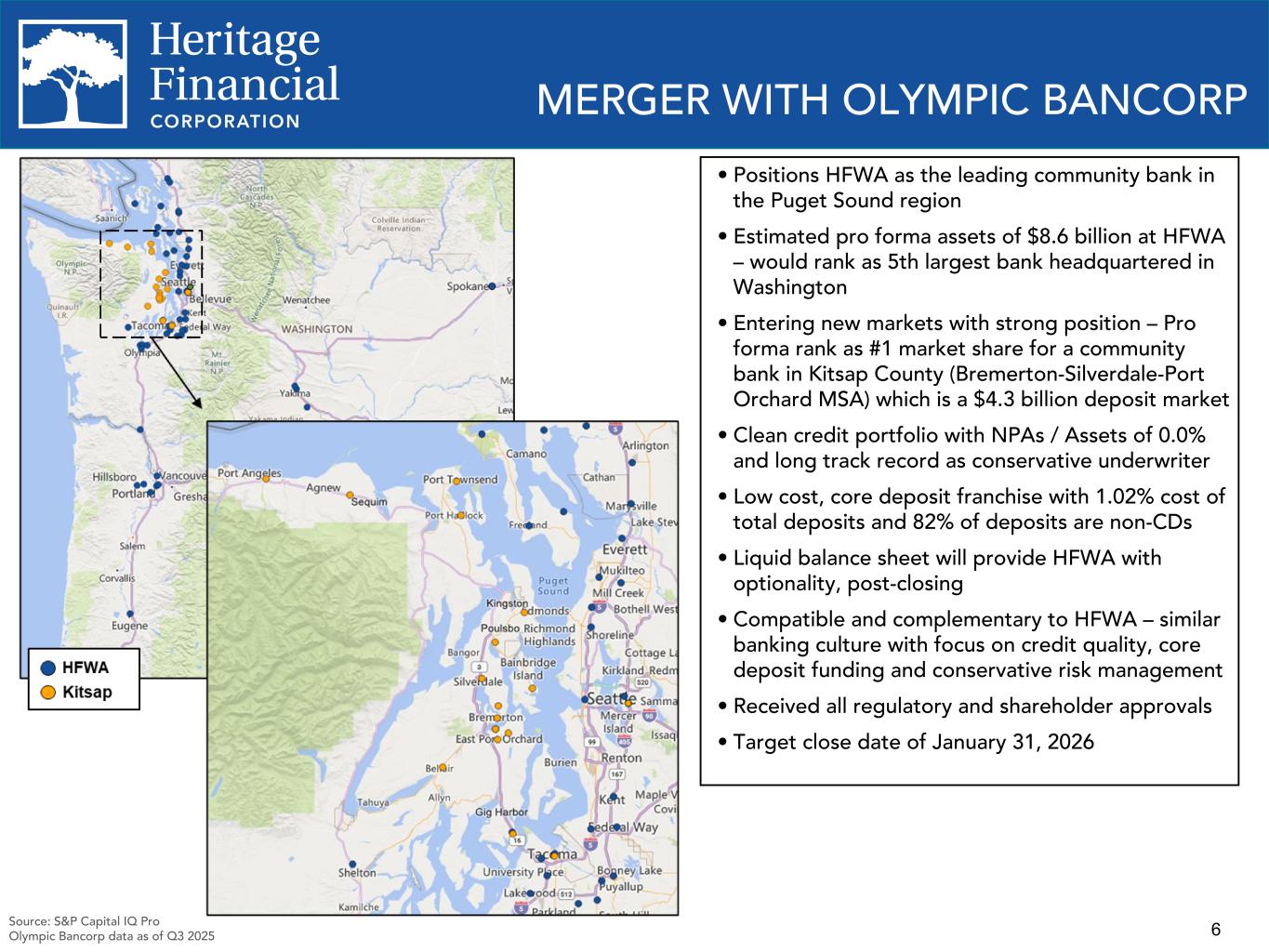 2 This presentation contains “forward-looking statements” within the meaning of the Private Securities Litigation Reform Act of 1995. Such statements often include words such as "believes," "expects," "anticipates," "estimates," “forecasts,” "intends," “plans,” “targets,” “potentially,” “probably,” “projects,” “outlook” or similar expressions or future or conditional verbs such as “may,” "will," “should,” "would," and "could," as well as the negative of such words. Forward-looking statements are not historical facts but instead represent management's current expectations and forecasts regarding future events, many of which are inherently uncertain and outside of our control. Actual results may differ, possibly materially, from those currently expected or projected in these forward-looking statements. Factors that could cause our actual results to differ materially from those described in the forward-looking statements include, but are not limited to, the following: • potential adverse impacts to economic conditions nationally or in our local market areas, other markets where Heritage Financial Corporation (the "Company") and its subsidiaries have lending relationships, or other aspects of the Company’s business operations or financial markets, including, without limitation, as a result of credit quality deterioration, pronounced and sustained reductions in real estate market values, employment levels, labor shortages and a potential recession or slowed economic growth; • changes in the interest rate environment, which could adversely affect our revenues and expenses, the value of assets and obligations, and the availability and cost of capital and liquidity; • the level and impact of inflation and the current and future monetary policies of the Board of Governors of the Federal Reserve System in response thereto; • legislative or regulatory changes that adversely affect our business, including changes in banking, securities, and tax law, in regulatory policies and principles, or the interpretation and prioritization of such rules and regulations; • effects on the U.S. economy resulting from the threat or implementation of, or changes to existing, policies and executive orders, including tariffs, immigration policy, regulatory and other governmental agencies, DEI and ESG initiatives, consumer protection, foreign policy, and tax regulations; • credit and interest rate risks associated with the Company’s businesses, customers, borrowings, repayment, investment, and deposit practices; • fluctuations in deposits and deposit concentrations; • liquidity issues, including our ability to borrow funds or raise additional capital, if necessary; • fluctuations in the value of our investment securities; • credit risks and risks from concentrations (including by type of geographic area, collateral and industry) within our loan portfolio; • disruptions, security breaches, insider fraud, cybersecurity incidents or other adverse events, failures or interruptions in, or attacks on, our information technology systems or on the third-party vendors who perform critical processing functions for our business, including sophisticated attacks using artificial intelligence and similar tools; • technological changes implemented by us and other parties, including third-party vendors, which may be more difficult to implement or more expensive than anticipated or which may have unforeseen consequences to us and our customers, including the development and implementation of tools incorporating artificial intelligence; • increased competition in the financial services industry from non-banks such as credit unions and financial technology companies, including digital asset service providers; • our ability to adapt successfully to technological changes to compete effectively in the marketplace, including as a result of competition from other commercial banks, mortgage banking firms, credit unions, securities brokerage firms, insurance companies, and financial technology companies; • our ability to implement our organic and acquisition growth strategies, including the pending acquisition of Olympic Bancorp, Inc. (“Olympic”), and our ability to successfully integrate Olympic's customers and operations following the acquisition; • effects of critical accounting policies and judgments, including the use of estimates in determining fair value of certain of our assets, which estimates may prove to be incorrect and result in significant declines in valuation; • the commencement, costs, effects and outcome of litigation and other legal proceedings and regulatory actions against us or to which the Company may become subject; • potential impairment to the goodwill the Company recorded in connection with our past acquisitions, including the pending acquisition of Olympic; • loss of, or inability to attract, key personnel; • our ability to successfully integrate any assets, liabilities, customers, systems, and management personnel we may acquire, including as a result of the acquisition of Olympic, into our operations and our ability to realize related revenue synergies and cost savings within expected time frames or at all, and any goodwill charges related thereto and costs or difficulties relating to integration matters, including but not limited to customer and employee retention, which might be greater than expected; • the effects of climate change, severe weather events, natural disasters, pandemics, epidemics and other public health crises, acts of war or terrorism, foreign relations, and other external events on our business and the businesses of our clients; • the impact of bank failures or adverse developments at other banks and related negative publicity about the banking industry in general on investor and depositor sentiment regarding the stability and liquidity of banks; and • our success at managing and responding to the risks
