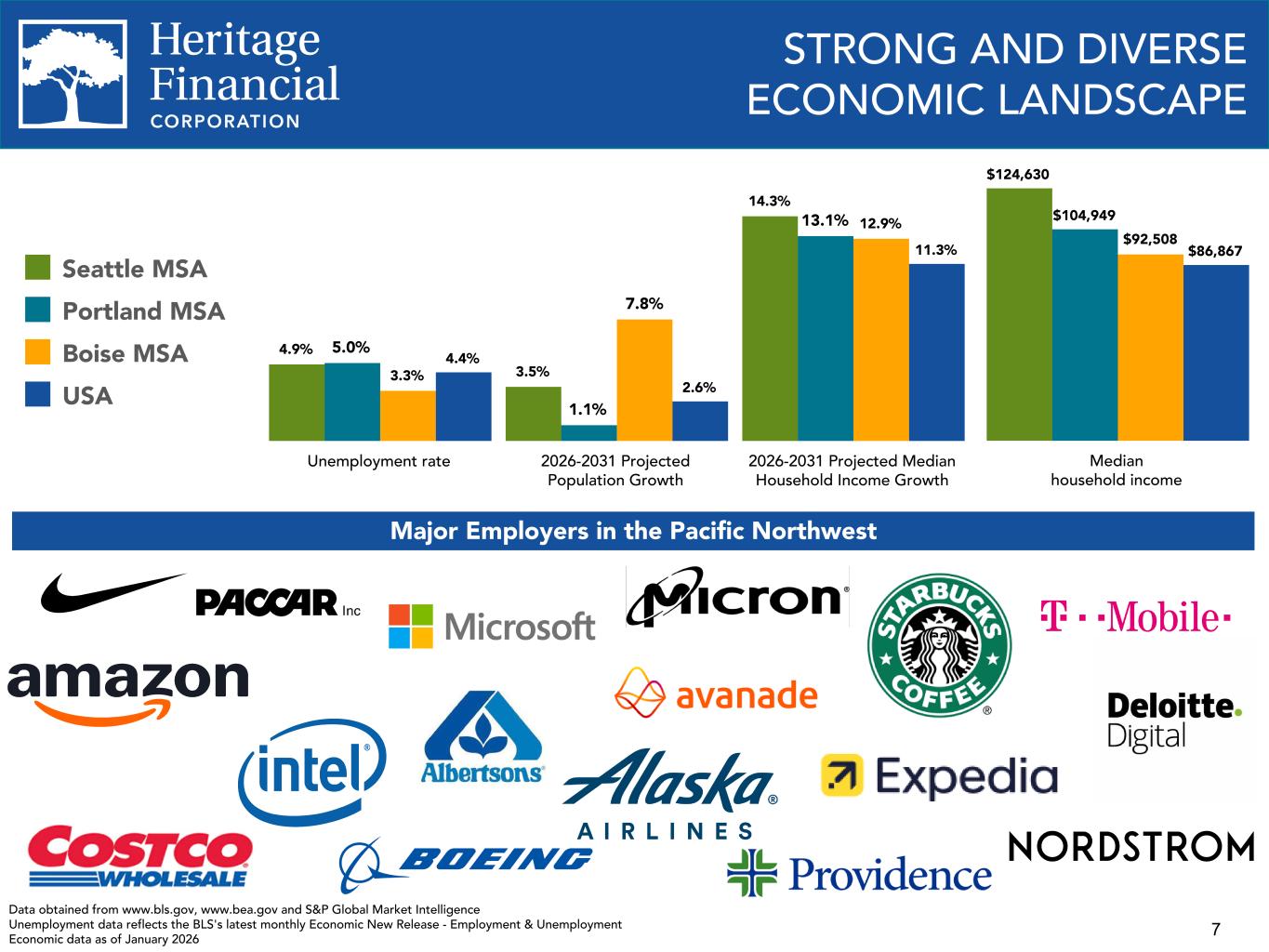 6 MERGER WITH OLYMPIC BANCORP Source: S&P Capital IQ Pro Olympic Bancorp data as of Q3 2025 • Positions HFWA as the leading community bank in the Puget Sound region • Estimated pro forma assets of $8.6 billion at HFWA – would rank as 5th largest bank headquartered in Washington • Entering new markets with strong position – Pro forma rank as #1 market share for a community bank in Kitsap County (Bremerton-Silverdale-Port Orchard MSA) which is a $4.3 billion deposit market • Clean credit portfolio with NPAs / Assets of 0.0% and long track record as conservative underwriter • Low cost, core deposit franchise with 1.02% cost of total deposits and 82% of deposits are non-CDs • Liquid balance sheet will provide HFWA with optionality, post-closing • Compatible and complementary to HFWA – similar banking culture with focus on credit quality, core deposit funding and conservative risk management • Received all regulatory and shareholder approvals • Target close date of January 31, 2026