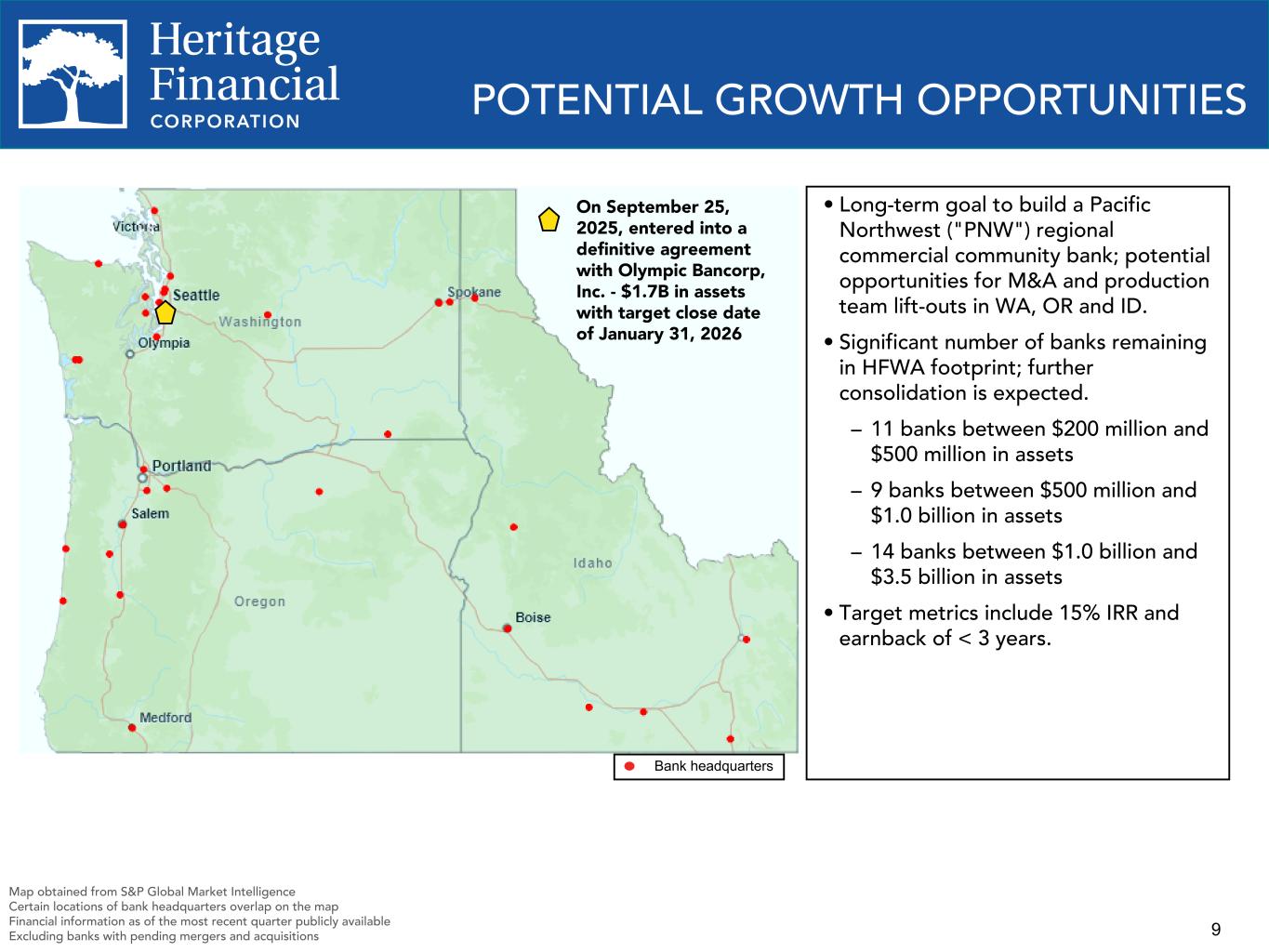 2 This presentation contains “forward-looking statements” within the meaning of the Private Securities Litigation Reform Act of 1995. Such statements often include words such as "believes," "expects," "anticipates," "estimates," “forecasts,” "intends," “plans,” “targets,” “potentially,” “probably,” “projects,” “outlook” or similar expressions or future or conditional verbs such as “may,” "will," “should,” "would," and "could," as well as the negative of such words. Forward-looking statements are not historical facts but instead represent management's current expectations and forecasts regarding future events, many of which are inherently uncertain and outside of our control. Actual results may differ, possibly materially, from those currently expected or projected in these forward-looking statements. Factors that could cause our actual results to differ materially from those described in the forward-looking statements include, but are not limited to, the following: • potential adverse impacts to economic conditions nationally or in our local market areas, other markets where Heritage Financial Corporation (the "Company") and its subsidiaries have lending relationships, or other aspects of the Company’s business operations or financial markets, including, without limitation, as a result of credit quality deterioration, pronounced and sustained reductions in real estate market values, employment levels, labor shortages and a potential recession or slowed economic growth; • changes in the interest rate environment, which could adversely affect our revenues and expenses, the value of assets and obligations, and the availability and cost of capital and liquidity; • the level and impact of inflation and the current and future monetary policies of the Board of Governors of the Federal Reserve System in response thereto; • legislative or regulatory changes that adversely affect our business, including changes in banking, securities, and tax law, in regulatory policies and principles, or the interpretation and prioritization of such rules and regulations; • effects on the U.S. economy resulting from the threat or implementation of, or changes to existing, policies and executive orders, including tariffs, immigration policy, regulatory and other governmental agencies, DEI and ESG initiatives, consumer protection, foreign policy, and tax regulations; • credit and interest rate risks associated with the Company’s businesses, customers, borrowings, repayment, investment, and deposit practices; • fluctuations in deposits and deposit concentrations; • liquidity issues, including our ability to borrow funds or raise additional capital, if necessary; • fluctuations in the value of our investment securities; • credit risks and risks from concentrations (including by type of geographic area, collateral and industry) within our loan portfolio; • disruptions, security breaches, insider fraud, cybersecurity incidents or other adverse events, failures or interruptions in, or attacks on, our information technology systems or on the third-party vendors who perform critical processing functions for our business, including sophisticated attacks using artificial intelligence and similar tools; • technological changes implemented by us and other parties, including third-party vendors, which may be more difficult to implement or more expensive than anticipated or which may have unforeseen consequences to us and our customers, including the development and implementation of tools incorporating artificial intelligence; • increased competition in the financial services industry from non-banks such as credit unions and financial technology companies, including digital asset service providers; • our ability to adapt successfully to technological changes to compete effectively in the marketplace, including as a result of competition from other commercial banks, mortgage banking firms, credit unions, securities brokerage firms, insurance companies, and financial technology companies; • our ability to implement our organic and acquisition growth strategies, including the pending acquisition of Olympic Bancorp, Inc. (“Olympic”), and our ability to successfully integrate Olympic's customers and operations following the acquisition; • effects of critical accounting policies and judgments, including the use of estimates in determining fair value of certain of our assets, which estimates may prove to be incorrect and result in significant declines in valuation; • the commencement, costs, effects and outcome of litigation and other legal proceedings and regulatory actions against us or to which the Company may become subject; • potential impairment to the goodwill the Company recorded in connection with our past acquisitions, including the pending acquisition of Olympic; • loss of, or inability to attract, key personnel; • our ability to successfully integrate any assets, liabilities, customers, systems, and management personnel we may acquire, including as a result of the acquisition of Olympic, into our operations and our ability to realize related revenue synergies and cost savings within expected time frames or at all, and any goodwill charges related thereto and costs or difficulties relating to integration matters, including but not limited to customer and employee retention, which might be greater than expected; • the effects of climate change, severe weather events, natural disasters, pandemics, epidemics and other public health crises, acts of war or terrorism, foreign relations, and other external events on our business and the businesses of our clients; • the impact of bank failures or adverse developments at other banks and related negative publicity about the banking industry in general on investor and depositor sentiment regarding the stability and liquidity of banks; and • our success at managing and responding to the risks
