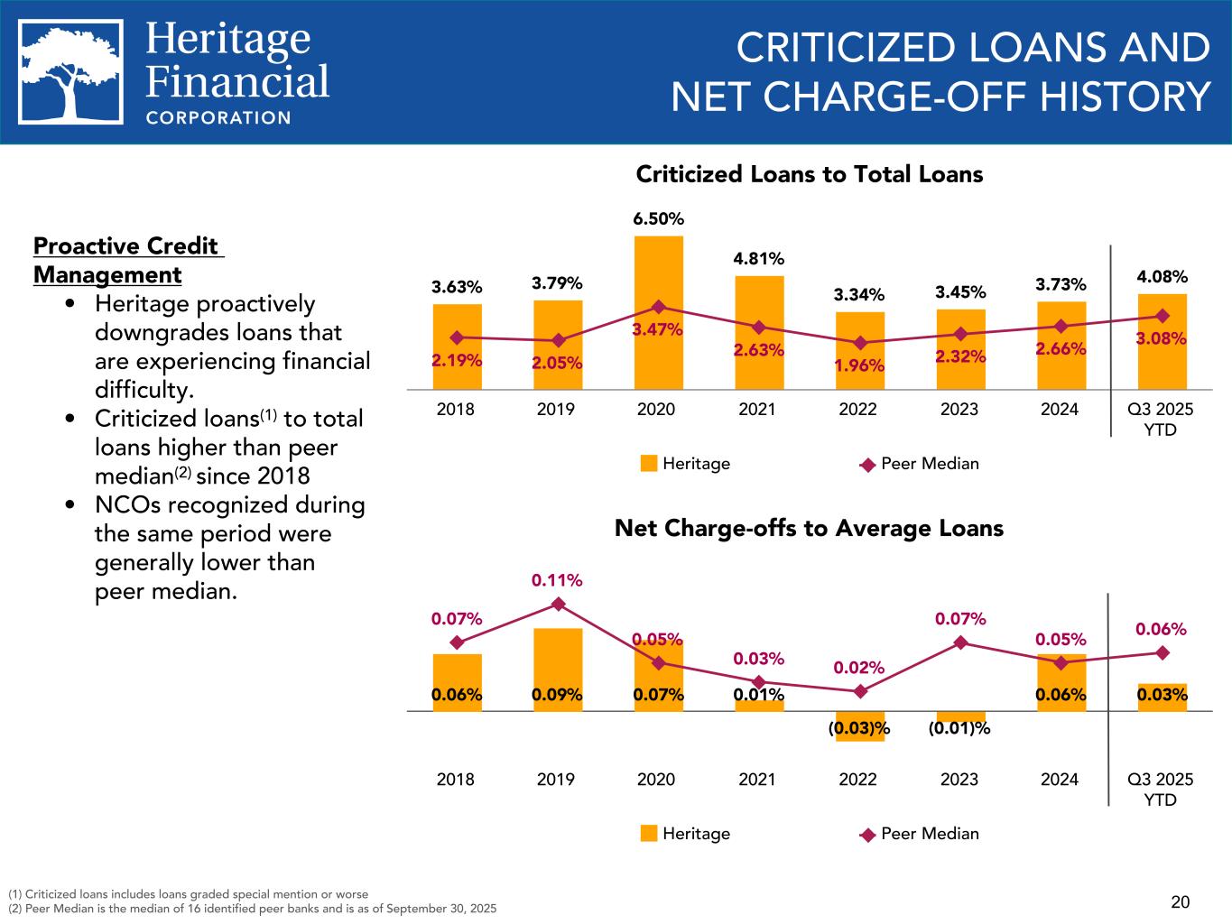 2 This presentation contains “forward-looking statements” within the meaning of the Private Securities Litigation Reform Act of 1995. Such statements often include words such as "believes," "expects," "anticipates," "estimates," “forecasts,” "intends," “plans,” “targets,” “potentially,” “probably,” “projects,” “outlook” or similar expressions or future or conditional verbs such as “may,” "will," “should,” "would," and "could," as well as the negative of such words. Forward-looking statements are not historical facts but instead represent management's current expectations and forecasts regarding future events, many of which are inherently uncertain and outside of our control. Actual results may differ, possibly materially, from those currently expected or projected in these forward-looking statements. Factors that could cause our actual results to differ materially from those described in the forward-looking statements include, but are not limited to, the following: • potential adverse impacts to economic conditions nationally or in our local market areas, other markets where Heritage Financial Corporation (the "Company") and its subsidiaries have lending relationships, or other aspects of the Company’s business operations or financial markets, including, without limitation, as a result of credit quality deterioration, pronounced and sustained reductions in real estate market values, employment levels, labor shortages and a potential recession or slowed economic growth; • changes in the interest rate environment, which could adversely affect our revenues and expenses, the value of assets and obligations, and the availability and cost of capital and liquidity; • the level and impact of inflation and the current and future monetary policies of the Board of Governors of the Federal Reserve System in response thereto; • legislative or regulatory changes that adversely affect our business, including changes in banking, securities, and tax law, in regulatory policies and principles, or the interpretation and prioritization of such rules and regulations; • effects on the U.S. economy resulting from the threat or implementation of, or changes to existing, policies and executive orders, including tariffs, immigration policy, regulatory and other governmental agencies, DEI and ESG initiatives, consumer protection, foreign policy, and tax regulations; • credit and interest rate risks associated with the Company’s businesses, customers, borrowings, repayment, investment, and deposit practices; • fluctuations in deposits and deposit concentrations; • liquidity issues, including our ability to borrow funds or raise additional capital, if necessary; • fluctuations in the value of our investment securities; • credit risks and risks from concentrations (including by type of geographic area, collateral and industry) within our loan portfolio; • disruptions, security breaches, insider fraud, cybersecurity incidents or other adverse events, failures or interruptions in, or attacks on, our information technology systems or on the third-party vendors who perform critical processing functions for our business, including sophisticated attacks using artificial intelligence and similar tools; • technological changes implemented by us and other parties, including third-party vendors, which may be more difficult to implement or more expensive than anticipated or which may have unforeseen consequences to us and our customers, including the development and implementation of tools incorporating artificial intelligence; • increased competition in the financial services industry from non-banks such as credit unions and financial technology companies, including digital asset service providers; • our ability to adapt successfully to technological changes to compete effectively in the marketplace, including as a result of competition from other commercial banks, mortgage banking firms, credit unions, securities brokerage firms, insurance companies, and financial technology companies; • our ability to implement our organic and acquisition growth strategies, including the pending acquisition of Olympic Bancorp, Inc. (“Olympic”), and our ability to successfully integrate Olympic's customers and operations following the acquisition; • effects of critical accounting policies and judgments, including the use of estimates in determining fair value of certain of our assets, which estimates may prove to be incorrect and result in significant declines in valuation; • the commencement, costs, effects and outcome of litigation and other legal proceedings and regulatory actions against us or to which the Company may become subject; • potential impairment to the goodwill the Company recorded in connection with our past acquisitions, including the pending acquisition of Olympic; • loss of, or inability to attract, key personnel; • our ability to successfully integrate any assets, liabilities, customers, systems, and management personnel we may acquire, including as a result of the acquisition of Olympic, into our operations and our ability to realize related revenue synergies and cost savings within expected time frames or at all, and any goodwill charges related thereto and costs or difficulties relating to integration matters, including but not limited to customer and employee retention, which might be greater than expected; • the effects of climate change, severe weather events, natural disasters, pandemics, epidemics and other public health crises, acts of war or terrorism, foreign relations, and other external events on our business and the businesses of our clients; • the impact of bank failures or adverse developments at other banks and related negative publicity about the banking industry in general on investor and depositor sentiment regarding the stability and liquidity of banks; and • our success at managing and responding to the risks