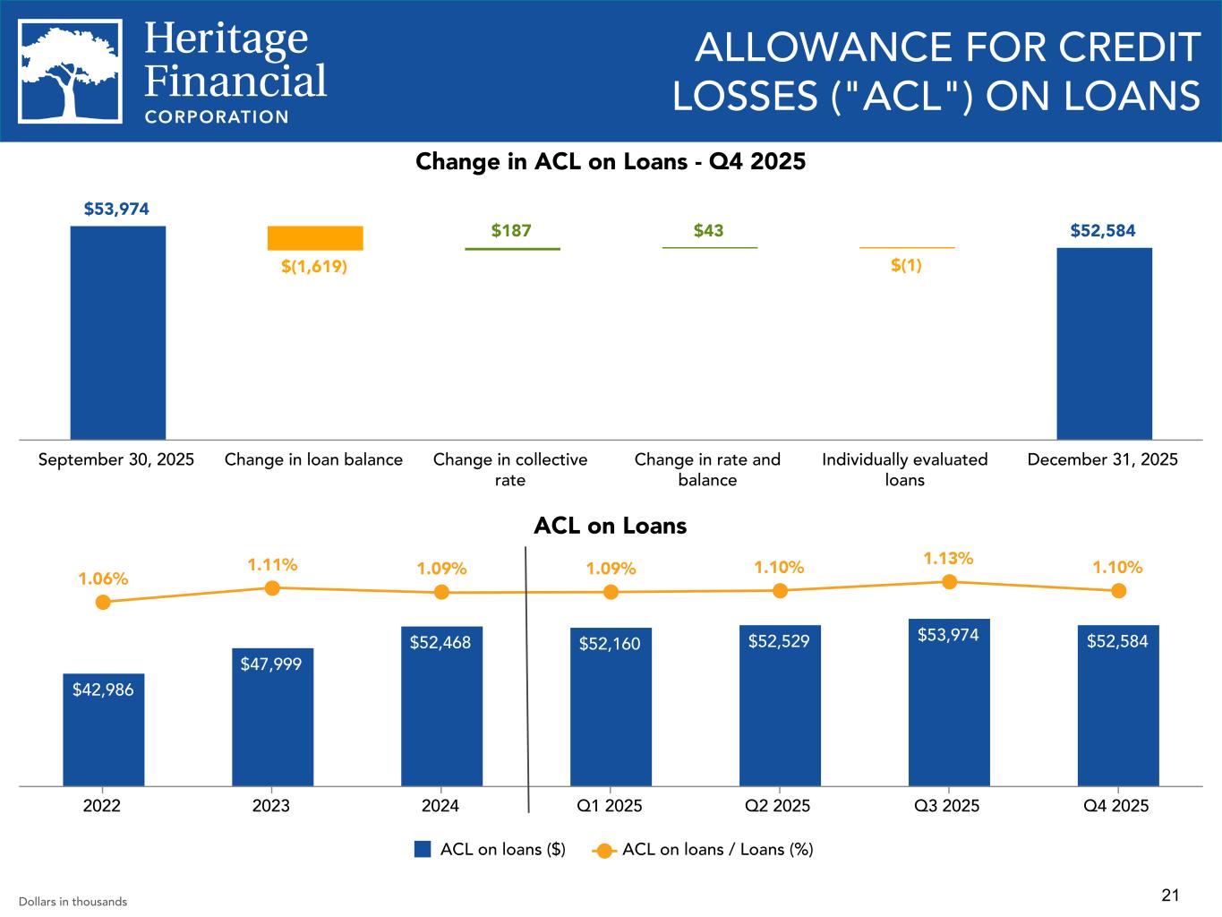 20 CRITICIZED LOANS AND NET CHARGE-OFF HISTORY Criticized Loans to Total Loans 3.63% 3.79% 6.50% 4.81% 3.34% 3.45% 3.73% 4.08% 2.19% 2.05% 3.47% 2.63% 1.96% 2.32% 2.66% 3.08% Heritage Peer Median 2018 2019 2020 2021 2022 2023 2024 Q3 2025 YTD Net Charge-offs to Average Loans 0.06% 0.09% 0.07% 0.01% (0.03)% (0.01)% 0.06% 0.03% 0.07% 0.11% 0.05% 0.03% 0.02% 0.07% 0.05% 0.06% Heritage Peer Median 2018 2019 2020 2021 2022 2023 2024 Q3 2025 YTD (1) Criticized loans includes loans graded special mention or worse (2) Peer Median is the median of 16 identified peer banks and is as of September 30, 2025 Proactive Credit Management • Heritage proactively downgrades loans that are experiencing financial difficulty. • Criticized loans(1) to total loans higher than peer median(2) since 2018 • NCOs recognized during the same period were generally lower than peer median.