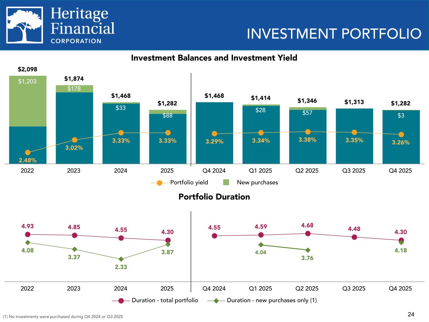2 This presentation contains “forward-looking statements” within the meaning of the Private Securities Litigation Reform Act of 1995. Such statements often include words such as "believes," "expects," "anticipates," "estimates," “forecasts,” "intends," “plans,” “targets,” “potentially,” “probably,” “projects,” “outlook” or similar expressions or future or conditional verbs such as “may,” "will," “should,” "would," and "could," as well as the negative of such words. Forward-looking statements are not historical facts but instead represent management's current expectations and forecasts regarding future events, many of which are inherently uncertain and outside of our control. Actual results may differ, possibly materially, from those currently expected or projected in these forward-looking statements. Factors that could cause our actual results to differ materially from those described in the forward-looking statements include, but are not limited to, the following: • potential adverse impacts to economic conditions nationally or in our local market areas, other markets where Heritage Financial Corporation (the "Company") and its subsidiaries have lending relationships, or other aspects of the Company’s business operations or financial markets, including, without limitation, as a result of credit quality deterioration, pronounced and sustained reductions in real estate market values, employment levels, labor shortages and a potential recession or slowed economic growth; • changes in the interest rate environment, which could adversely affect our revenues and expenses, the value of assets and obligations, and the availability and cost of capital and liquidity; • the level and impact of inflation and the current and future monetary policies of the Board of Governors of the Federal Reserve System in response thereto; • legislative or regulatory changes that adversely affect our business, including changes in banking, securities, and tax law, in regulatory policies and principles, or the interpretation and prioritization of such rules and regulations; • effects on the U.S. economy resulting from the threat or implementation of, or changes to existing, policies and executive orders, including tariffs, immigration policy, regulatory and other governmental agencies, DEI and ESG initiatives, consumer protection, foreign policy, and tax regulations; • credit and interest rate risks associated with the Company’s businesses, customers, borrowings, repayment, investment, and deposit practices; • fluctuations in deposits and deposit concentrations; • liquidity issues, including our ability to borrow funds or raise additional capital, if necessary; • fluctuations in the value of our investment securities; • credit risks and risks from concentrations (including by type of geographic area, collateral and industry) within our loan portfolio; • disruptions, security breaches, insider fraud, cybersecurity incidents or other adverse events, failures or interruptions in, or attacks on, our information technology systems or on the third-party vendors who perform critical processing functions for our business, including sophisticated attacks using artificial intelligence and similar tools; • technological changes implemented by us and other parties, including third-party vendors, which may be more difficult to implement or more expensive than anticipated or which may have unforeseen consequences to us and our customers, including the development and implementation of tools incorporating artificial intelligence; • increased competition in the financial services industry from non-banks such as credit unions and financial technology companies, including digital asset service providers; • our ability to adapt successfully to technological changes to compete effectively in the marketplace, including as a result of competition from other commercial banks, mortgage banking firms, credit unions, securities brokerage firms, insurance companies, and financial technology companies; • our ability to implement our organic and acquisition growth strategies, including the pending acquisition of Olympic Bancorp, Inc. (“Olympic”), and our ability to successfully integrate Olympic's customers and operations following the acquisition; • effects of critical accounting policies and judgments, including the use of estimates in determining fair value of certain of our assets, which estimates may prove to be incorrect and result in significant declines in valuation; • the commencement, costs, effects and outcome of litigation and other legal proceedings and regulatory actions against us or to which the Company may become subject; • potential impairment to the goodwill the Company recorded in connection with our past acquisitions, including the pending acquisition of Olympic; • loss of, or inability to attract, key personnel; • our ability to successfully integrate any assets, liabilities, customers, systems, and management personnel we may acquire, including as a result of the acquisition of Olympic, into our operations and our ability to realize related revenue synergies and cost savings within expected time frames or at all, and any goodwill charges related thereto and costs or difficulties relating to integration matters, including but not limited to customer and employee retention, which might be greater than expected; • the effects of climate change, severe weather events, natural disasters, pandemics, epidemics and other public health crises, acts of war or terrorism, foreign relations, and other external events on our business and the businesses of our clients; • the impact of bank failures or adverse developments at other banks and related negative publicity about the banking industry in general on investor and depositor sentiment regarding the stability and liquidity of banks; and • our success at managing and responding to the risks