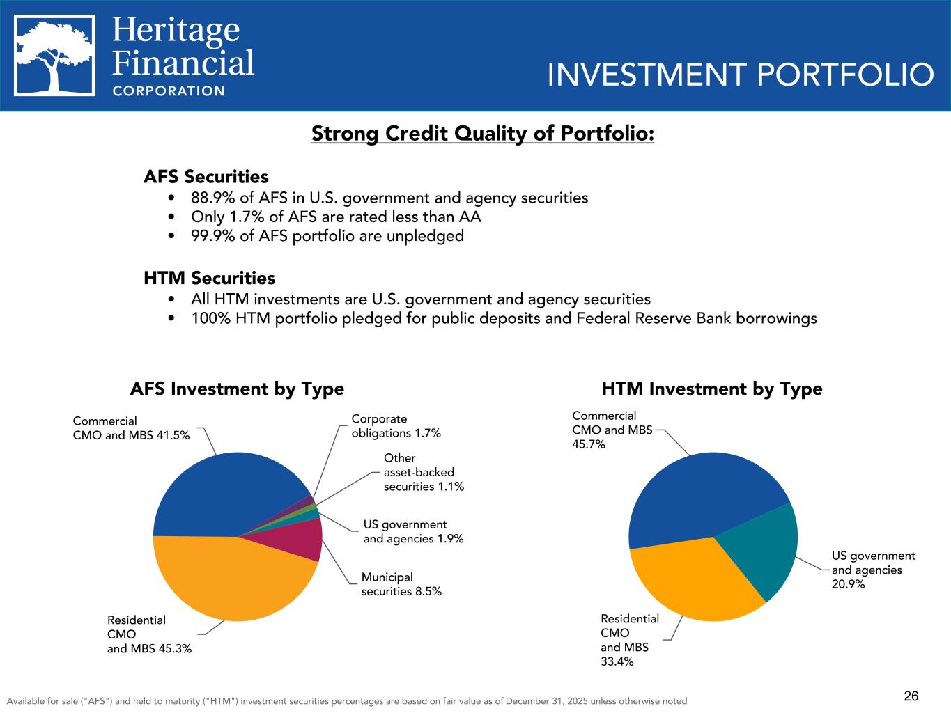 2 This presentation contains “forward-looking statements” within the meaning of the Private Securities Litigation Reform Act of 1995. Such statements often include words such as "believes," "expects," "anticipates," "estimates," “forecasts,” "intends," “plans,” “targets,” “potentially,” “probably,” “projects,” “outlook” or similar expressions or future or conditional verbs such as “may,” "will," “should,” "would," and "could," as well as the negative of such words. Forward-looking statements are not historical facts but instead represent management's current expectations and forecasts regarding future events, many of which are inherently uncertain and outside of our control. Actual results may differ, possibly materially, from those currently expected or projected in these forward-looking statements. Factors that could cause our actual results to differ materially from those described in the forward-looking statements include, but are not limited to, the following: • potential adverse impacts to economic conditions nationally or in our local market areas, other markets where Heritage Financial Corporation (the "Company") and its subsidiaries have lending relationships, or other aspects of the Company’s business operations or financial markets, including, without limitation, as a result of credit quality deterioration, pronounced and sustained reductions in real estate market values, employment levels, labor shortages and a potential recession or slowed economic growth; • changes in the interest rate environment, which could adversely affect our revenues and expenses, the value of assets and obligations, and the availability and cost of capital and liquidity; • the level and impact of inflation and the current and future monetary policies of the Board of Governors of the Federal Reserve System in response thereto; • legislative or regulatory changes that adversely affect our business, including changes in banking, securities, and tax law, in regulatory policies and principles, or the interpretation and prioritization of such rules and regulations; • effects on the U.S. economy resulting from the threat or implementation of, or changes to existing, policies and executive orders, including tariffs, immigration policy, regulatory and other governmental agencies, DEI and ESG initiatives, consumer protection, foreign policy, and tax regulations; • credit and interest rate risks associated with the Company’s businesses, customers, borrowings, repayment, investment, and deposit practices; • fluctuations in deposits and deposit concentrations; • liquidity issues, including our ability to borrow funds or raise additional capital, if necessary; • fluctuations in the value of our investment securities; • credit risks and risks from concentrations (including by type of geographic area, collateral and industry) within our loan portfolio; • disruptions, security breaches, insider fraud, cybersecurity incidents or other adverse events, failures or interruptions in, or attacks on, our information technology systems or on the third-party vendors who perform critical processing functions for our business, including sophisticated attacks using artificial intelligence and similar tools; • technological changes implemented by us and other parties, including third-party vendors, which may be more difficult to implement or more expensive than anticipated or which may have unforeseen consequences to us and our customers, including the development and implementation of tools incorporating artificial intelligence; • increased competition in the financial services industry from non-banks such as credit unions and financial technology companies, including digital asset service providers; • our ability to adapt successfully to technological changes to compete effectively in the marketplace, including as a result of competition from other commercial banks, mortgage banking firms, credit unions, securities brokerage firms, insurance companies, and financial technology companies; • our ability to implement our organic and acquisition growth strategies, including the pending acquisition of Olympic Bancorp, Inc. (“Olympic”), and our ability to successfully integrate Olympic's customers and operations following the acquisition; • effects of critical accounting policies and judgments, including the use of estimates in determining fair value of certain of our assets, which estimates may prove to be incorrect and result in significant declines in valuation; • the commencement, costs, effects and outcome of litigation and other legal proceedings and regulatory actions against us or to which the Company may become subject; • potential impairment to the goodwill the Company recorded in connection with our past acquisitions, including the pending acquisition of Olympic; • loss of, or inability to attract, key personnel; • our ability to successfully integrate any assets, liabilities, customers, systems, and management personnel we may acquire, including as a result of the acquisition of Olympic, into our operations and our ability to realize related revenue synergies and cost savings within expected time frames or at all, and any goodwill charges related thereto and costs or difficulties relating to integration matters, including but not limited to customer and employee retention, which might be greater than expected; • the effects of climate change, severe weather events, natural disasters, pandemics, epidemics and other public health crises, acts of war or terrorism, foreign relations, and other external events on our business and the businesses of our clients; • the impact of bank failures or adverse developments at other banks and related negative publicity about the banking industry in general on investor and depositor sentiment regarding the stability and liquidity of banks; and • our success at managing and responding to the risks