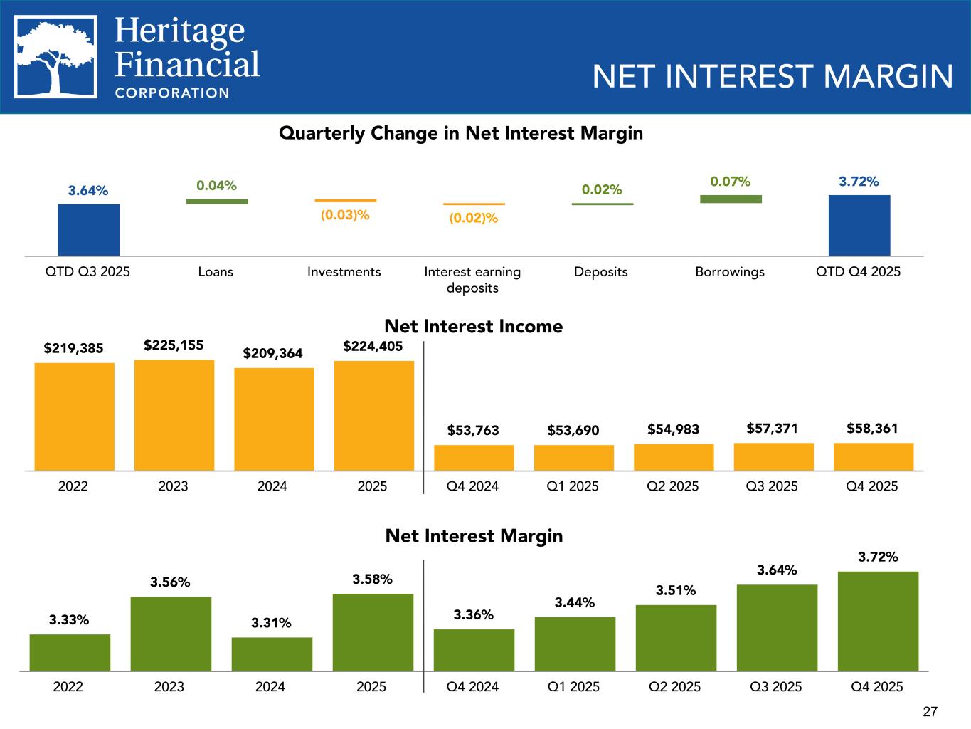 2 This presentation contains “forward-looking statements” within the meaning of the Private Securities Litigation Reform Act of 1995. Such statements often include words such as "believes," "expects," "anticipates," "estimates," “forecasts,” "intends," “plans,” “targets,” “potentially,” “probably,” “projects,” “outlook” or similar expressions or future or conditional verbs such as “may,” "will," “should,” "would," and "could," as well as the negative of such words. Forward-looking statements are not historical facts but instead represent management's current expectations and forecasts regarding future events, many of which are inherently uncertain and outside of our control. Actual results may differ, possibly materially, from those currently expected or projected in these forward-looking statements. Factors that could cause our actual results to differ materially from those described in the forward-looking statements include, but are not limited to, the following: • potential adverse impacts to economic conditions nationally or in our local market areas, other markets where Heritage Financial Corporation (the "Company") and its subsidiaries have lending relationships, or other aspects of the Company’s business operations or financial markets, including, without limitation, as a result of credit quality deterioration, pronounced and sustained reductions in real estate market values, employment levels, labor shortages and a potential recession or slowed economic growth; • changes in the interest rate environment, which could adversely affect our revenues and expenses, the value of assets and obligations, and the availability and cost of capital and liquidity; • the level and impact of inflation and the current and future monetary policies of the Board of Governors of the Federal Reserve System in response thereto; • legislative or regulatory changes that adversely affect our business, including changes in banking, securities, and tax law, in regulatory policies and principles, or the interpretation and prioritization of such rules and regulations; • effects on the U.S. economy resulting from the threat or implementation of, or changes to existing, policies and executive orders, including tariffs, immigration policy, regulatory and other governmental agencies, DEI and ESG initiatives, consumer protection, foreign policy, and tax regulations; • credit and interest rate risks associated with the Company’s businesses, customers, borrowings, repayment, investment, and deposit practices; • fluctuations in deposits and deposit concentrations; • liquidity issues, including our ability to borrow funds or raise additional capital, if necessary; • fluctuations in the value of our investment securities; • credit risks and risks from concentrations (including by type of geographic area, collateral and industry) within our loan portfolio; • disruptions, security breaches, insider fraud, cybersecurity incidents or other adverse events, failures or interruptions in, or attacks on, our information technology systems or on the third-party vendors who perform critical processing functions for our business, including sophisticated attacks using artificial intelligence and similar tools; • technological changes implemented by us and other parties, including third-party vendors, which may be more difficult to implement or more expensive than anticipated or which may have unforeseen consequences to us and our customers, including the development and implementation of tools incorporating artificial intelligence; • increased competition in the financial services industry from non-banks such as credit unions and financial technology companies, including digital asset service providers; • our ability to adapt successfully to technological changes to compete effectively in the marketplace, including as a result of competition from other commercial banks, mortgage banking firms, credit unions, securities brokerage firms, insurance companies, and financial technology companies; • our ability to implement our organic and acquisition growth strategies, including the pending acquisition of Olympic Bancorp, Inc. (“Olympic”), and our ability to successfully integrate Olympic's customers and operations following the acquisition; • effects of critical accounting policies and judgments, including the use of estimates in determining fair value of certain of our assets, which estimates may prove to be incorrect and result in significant declines in valuation; • the commencement, costs, effects and outcome of litigation and other legal proceedings and regulatory actions against us or to which the Company may become subject; • potential impairment to the goodwill the Company recorded in connection with our past acquisitions, including the pending acquisition of Olympic; • loss of, or inability to attract, key personnel; • our ability to successfully integrate any assets, liabilities, customers, systems, and management personnel we may acquire, including as a result of the acquisition of Olympic, into our operations and our ability to realize related revenue synergies and cost savings within expected time frames or at all, and any goodwill charges related thereto and costs or difficulties relating to integration matters, including but not limited to customer and employee retention, which might be greater than expected; • the effects of climate change, severe weather events, natural disasters, pandemics, epidemics and other public health crises, acts of war or terrorism, foreign relations, and other external events on our business and the businesses of our clients; • the impact of bank failures or adverse developments at other banks and related negative publicity about the banking industry in general on investor and depositor sentiment regarding the stability and liquidity of banks; and • our success at managing and responding to the risks