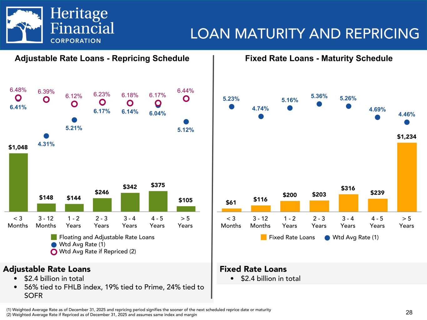 2 This presentation contains “forward-looking statements” within the meaning of the Private Securities Litigation Reform Act of 1995. Such statements often include words such as "believes," "expects," "anticipates," "estimates," “forecasts,” "intends," “plans,” “targets,” “potentially,” “probably,” “projects,” “outlook” or similar expressions or future or conditional verbs such as “may,” "will," “should,” "would," and "could," as well as the negative of such words. Forward-looking statements are not historical facts but instead represent management's current expectations and forecasts regarding future events, many of which are inherently uncertain and outside of our control. Actual results may differ, possibly materially, from those currently expected or projected in these forward-looking statements. Factors that could cause our actual results to differ materially from those described in the forward-looking statements include, but are not limited to, the following: • potential adverse impacts to economic conditions nationally or in our local market areas, other markets where Heritage Financial Corporation (the "Company") and its subsidiaries have lending relationships, or other aspects of the Company’s business operations or financial markets, including, without limitation, as a result of credit quality deterioration, pronounced and sustained reductions in real estate market values, employment levels, labor shortages and a potential recession or slowed economic growth; • changes in the interest rate environment, which could adversely affect our revenues and expenses, the value of assets and obligations, and the availability and cost of capital and liquidity; • the level and impact of inflation and the current and future monetary policies of the Board of Governors of the Federal Reserve System in response thereto; • legislative or regulatory changes that adversely affect our business, including changes in banking, securities, and tax law, in regulatory policies and principles, or the interpretation and prioritization of such rules and regulations; • effects on the U.S. economy resulting from the threat or implementation of, or changes to existing, policies and executive orders, including tariffs, immigration policy, regulatory and other governmental agencies, DEI and ESG initiatives, consumer protection, foreign policy, and tax regulations; • credit and interest rate risks associated with the Company’s businesses, customers, borrowings, repayment, investment, and deposit practices; • fluctuations in deposits and deposit concentrations; • liquidity issues, including our ability to borrow funds or raise additional capital, if necessary; • fluctuations in the value of our investment securities; • credit risks and risks from concentrations (including by type of geographic area, collateral and industry) within our loan portfolio; • disruptions, security breaches, insider fraud, cybersecurity incidents or other adverse events, failures or interruptions in, or attacks on, our information technology systems or on the third-party vendors who perform critical processing functions for our business, including sophisticated attacks using artificial intelligence and similar tools; • technological changes implemented by us and other parties, including third-party vendors, which may be more difficult to implement or more expensive than anticipated or which may have unforeseen consequences to us and our customers, including the development and implementation of tools incorporating artificial intelligence; • increased competition in the financial services industry from non-banks such as credit unions and financial technology companies, including digital asset service providers; • our ability to adapt successfully to technological changes to compete effectively in the marketplace, including as a result of competition from other commercial banks, mortgage banking firms, credit unions, securities brokerage firms, insurance companies, and financial technology companies; • our ability to implement our organic and acquisition growth strategies, including the pending acquisition of Olympic Bancorp, Inc. (“Olympic”), and our ability to successfully integrate Olympic's customers and operations following the acquisition; • effects of critical accounting policies and judgments, including the use of estimates in determining fair value of certain of our assets, which estimates may prove to be incorrect and result in significant declines in valuation; • the commencement, costs, effects and outcome of litigation and other legal proceedings and regulatory actions against us or to which the Company may become subject; • potential impairment to the goodwill the Company recorded in connection with our past acquisitions, including the pending acquisition of Olympic; • loss of, or inability to attract, key personnel; • our ability to successfully integrate any assets, liabilities, customers, systems, and management personnel we may acquire, including as a result of the acquisition of Olympic, into our operations and our ability to realize related revenue synergies and cost savings within expected time frames or at all, and any goodwill charges related thereto and costs or difficulties relating to integration matters, including but not limited to customer and employee retention, which might be greater than expected; • the effects of climate change, severe weather events, natural disasters, pandemics, epidemics and other public health crises, acts of war or terrorism, foreign relations, and other external events on our business and the businesses of our clients; • the impact of bank failures or adverse developments at other banks and related negative publicity about the banking industry in general on investor and depositor sentiment regarding the stability and liquidity of banks; and • our success at managing and responding to the risks