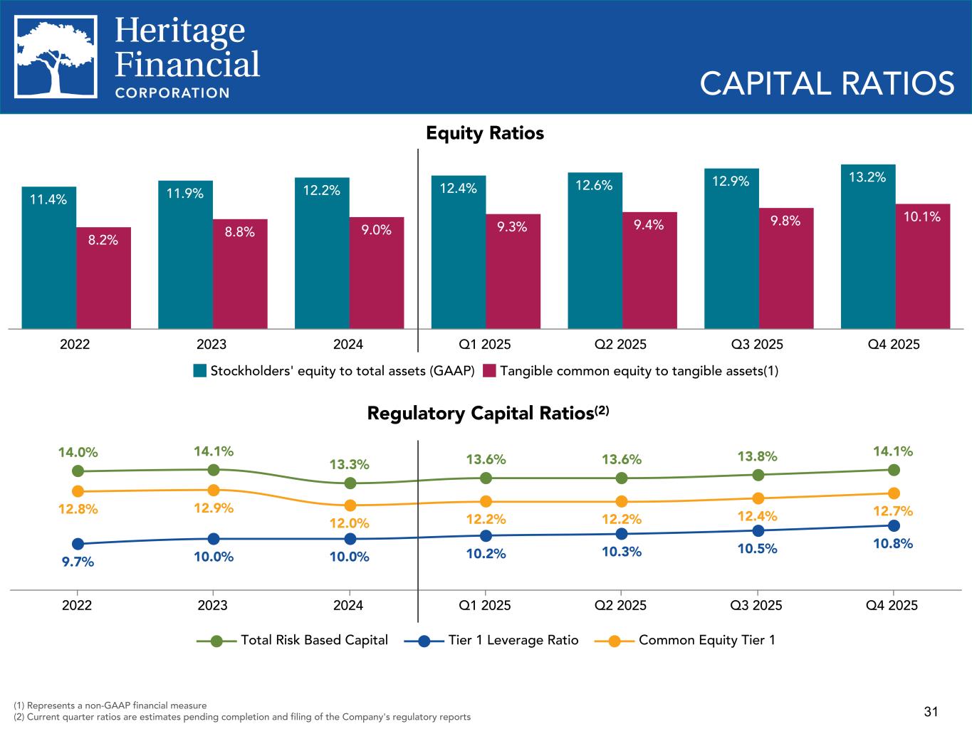 2 This presentation contains “forward-looking statements” within the meaning of the Private Securities Litigation Reform Act of 1995. Such statements often include words such as "believes," "expects," "anticipates," "estimates," “forecasts,” "intends," “plans,” “targets,” “potentially,” “probably,” “projects,” “outlook” or similar expressions or future or conditional verbs such as “may,” "will," “should,” "would," and "could," as well as the negative of such words. Forward-looking statements are not historical facts but instead represent management's current expectations and forecasts regarding future events, many of which are inherently uncertain and outside of our control. Actual results may differ, possibly materially, from those currently expected or projected in these forward-looking statements. Factors that could cause our actual results to differ materially from those described in the forward-looking statements include, but are not limited to, the following: • potential adverse impacts to economic conditions nationally or in our local market areas, other markets where Heritage Financial Corporation (the "Company") and its subsidiaries have lending relationships, or other aspects of the Company’s business operations or financial markets, including, without limitation, as a result of credit quality deterioration, pronounced and sustained reductions in real estate market values, employment levels, labor shortages and a potential recession or slowed economic growth; • changes in the interest rate environment, which could adversely affect our revenues and expenses, the value of assets and obligations, and the availability and cost of capital and liquidity; • the level and impact of inflation and the current and future monetary policies of the Board of Governors of the Federal Reserve System in response thereto; • legislative or regulatory changes that adversely affect our business, including changes in banking, securities, and tax law, in regulatory policies and principles, or the interpretation and prioritization of such rules and regulations; • effects on the U.S. economy resulting from the threat or implementation of, or changes to existing, policies and executive orders, including tariffs, immigration policy, regulatory and other governmental agencies, DEI and ESG initiatives, consumer protection, foreign policy, and tax regulations; • credit and interest rate risks associated with the Company’s businesses, customers, borrowings, repayment, investment, and deposit practices; • fluctuations in deposits and deposit concentrations; • liquidity issues, including our ability to borrow funds or raise additional capital, if necessary; • fluctuations in the value of our investment securities; • credit risks and risks from concentrations (including by type of geographic area, collateral and industry) within our loan portfolio; • disruptions, security breaches, insider fraud, cybersecurity incidents or other adverse events, failures or interruptions in, or attacks on, our information technology systems or on the third-party vendors who perform critical processing functions for our business, including sophisticated attacks using artificial intelligence and similar tools; • technological changes implemented by us and other parties, including third-party vendors, which may be more difficult to implement or more expensive than anticipated or which may have unforeseen consequences to us and our customers, including the development and implementation of tools incorporating artificial intelligence; • increased competition in the financial services industry from non-banks such as credit unions and financial technology companies, including digital asset service providers; • our ability to adapt successfully to technological changes to compete effectively in the marketplace, including as a result of competition from other commercial banks, mortgage banking firms, credit unions, securities brokerage firms, insurance companies, and financial technology companies; • our ability to implement our organic and acquisition growth strategies, including the pending acquisition of Olympic Bancorp, Inc. (“Olympic”), and our ability to successfully integrate Olympic's customers and operations following the acquisition; • effects of critical accounting policies and judgments, including the use of estimates in determining fair value of certain of our assets, which estimates may prove to be incorrect and result in significant declines in valuation; • the commencement, costs, effects and outcome of litigation and other legal proceedings and regulatory actions against us or to which the Company may become subject; • potential impairment to the goodwill the Company recorded in connection with our past acquisitions, including the pending acquisition of Olympic; • loss of, or inability to attract, key personnel; • our ability to successfully integrate any assets, liabilities, customers, systems, and management personnel we may acquire, including as a result of the acquisition of Olympic, into our operations and our ability to realize related revenue synergies and cost savings within expected time frames or at all, and any goodwill charges related thereto and costs or difficulties relating to integration matters, including but not limited to customer and employee retention, which might be greater than expected; • the effects of climate change, severe weather events, natural disasters, pandemics, epidemics and other public health crises, acts of war or terrorism, foreign relations, and other external events on our business and the businesses of our clients; • the impact of bank failures or adverse developments at other banks and related negative publicity about the banking industry in general on investor and depositor sentiment regarding the stability and liquidity of banks; and • our success at managing and responding to the risks