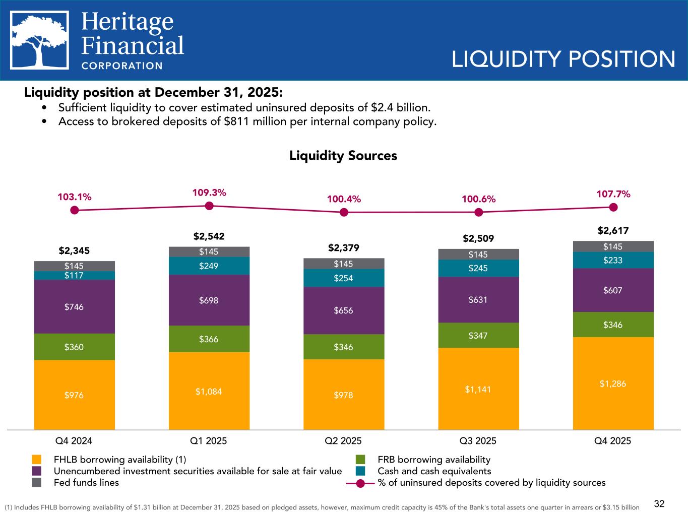 31(1) Represents a non-GAAP financial measure (2) Current quarter ratios are estimates pending completion and filing of the Company's regulatory reports CAPITAL RATIOS Equity Ratios 11.4% 11.9% 12.2% 12.4% 12.6% 12.9% 13.2% 8.2% 8.8% 9.0% 9.3% 9.4% 9.8% 10.1% Stockholders' equity to total assets (GAAP) Tangible common equity to tangible assets(1) 2022 2023 2024 Q1 2025 Q2 2025 Q3 2025 Q4 2025 12.8% 12.9% 12.0% 12.2% 12.2% 12.4% 12.7% 9.7% 10.0% 10.0% 10.2% 10.3% 10.5% 10.8% 14.0% 14.1% 13.3% 13.6% 13.6% 13.8% 14.1% Total Risk Based Capital Tier 1 Leverage Ratio Common Equity Tier 1 2022 2023 2024 Q1 2025 Q2 2025 Q3 2025 Q4 2025 Regulatory Capital Ratios(2)