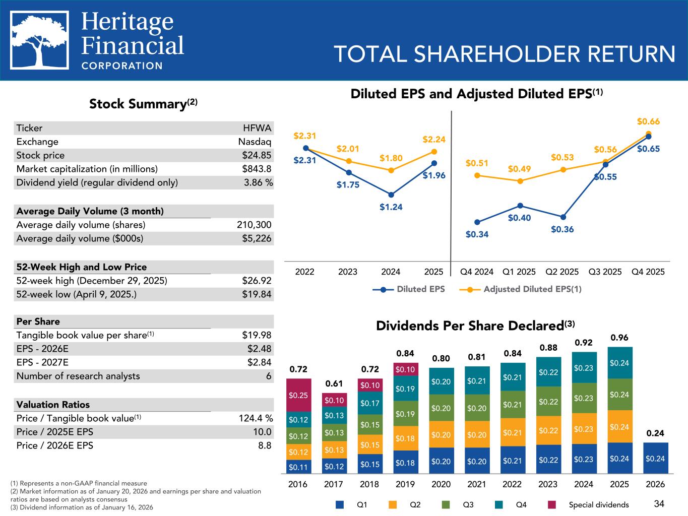 34 TOTAL SHAREHOLDER RETURN Stock Summary(2) Ticker HFWA Exchange Nasdaq Stock price $24.85 Market capitalization (in millions) $843.8 Dividend yield (regular dividend only) 3.86 % Average Daily Volume (3 month) Average daily volume (shares) 210,300 Average daily volume ($000s) $5,226 52-Week High and Low Price 52-week high (December 29, 2025) $26.92 52-week low (April 9, 2025.) $19.84 Per Share Tangible book value per share(1) $19.98 EPS - 2026E $2.48 EPS - 2027E $2.84 Number of research analysts 6 Valuation Ratios Price / Tangible book value(1) 124.4 % Price / 2025E EPS 10.0 Price / 2026E EPS 8.8 Dividends Per Share Declared(3) 0.72 0.61 0.72 0.84 0.80 0.81 0.84 0.88 0.92 0.96 0.24 $0.11 $0.12 $0.15 $0.18 $0.20 $0.20 $0.21 $0.22 $0.23 $0.24 $0.24 $0.12 $0.13 $0.15 $0.18 $0.20 $0.20 $0.21 $0.22 $0.23 $0.24 $0.12 $0.13 $0.15 $0.19 $0.20 $0.20 $0.21 $0.22 $0.23 $0.24 $0.12 $0.13 $0.17 $0.19 $0.20 $0.21 $0.21 $0.22 $0.23 $0.24 $0.25 $0.10 $0.10 $0.10 Q1 Q2 Q3 Q4 Special dividends 2016 2017 2018 2019 2020 2021 2022 2023 2024 2025 2026(1) Represents a non-GAAP financial measure (2) Market information as of January 20, 2026 and earnings per share and valuation ratios are based on analysts consensus (3) Dividend information as of January 16, 2026 $2.31 $2.01 $1.80 $2.24 $2.31 $1.75 $1.24 $1.96 $0.51 $0.49 $0.53 $0.56 $0.66 $0.34 $0.40 $0.36 $0.55 $0.65 Diluted EPS Adjusted Diluted EPS(1) 2022 2023 2024 2025 Q4 2024 Q1 2025 Q2 2025 Q3 2025 Q4 2025 Diluted EPS and Adjusted Diluted EPS(1)