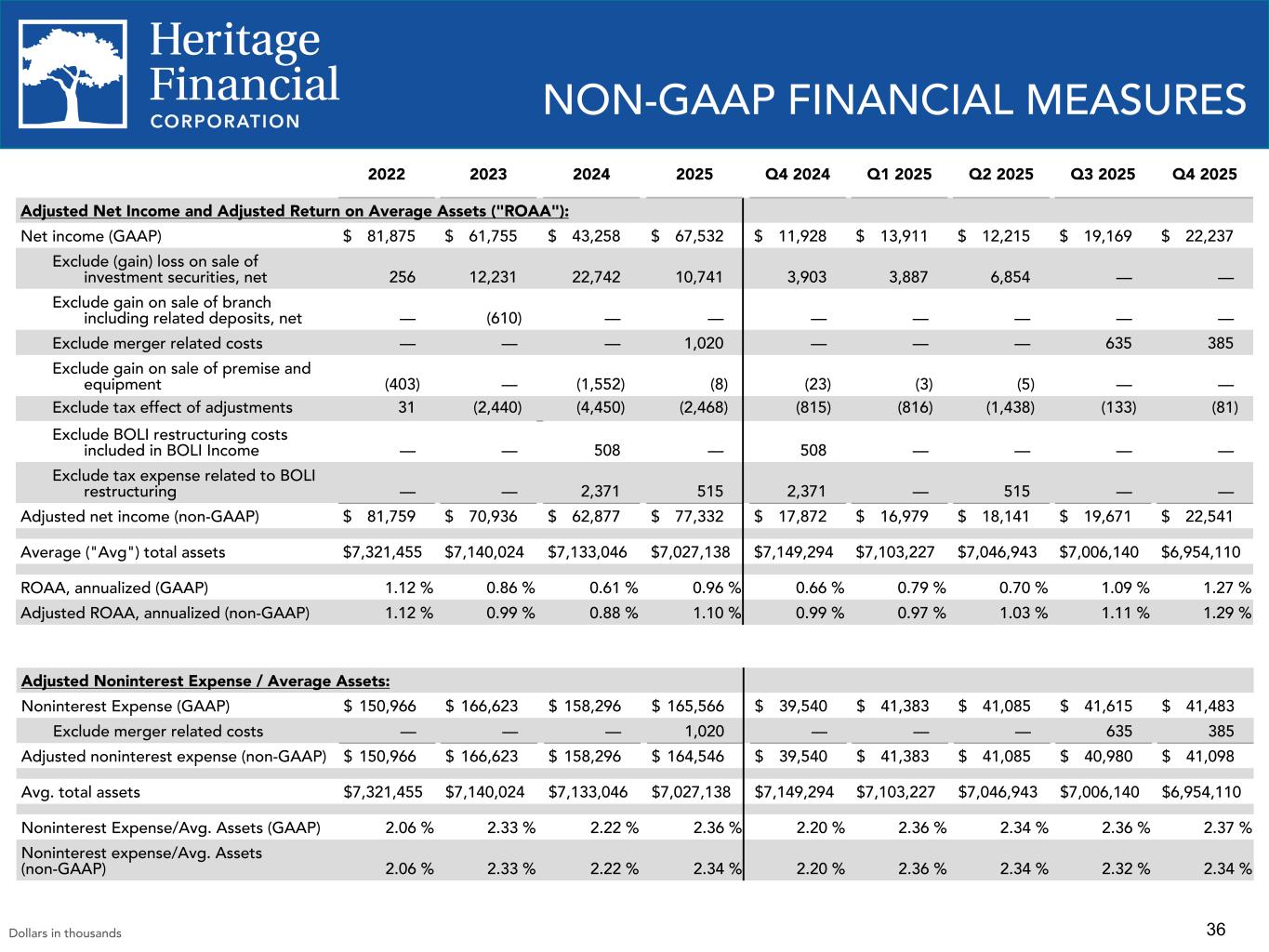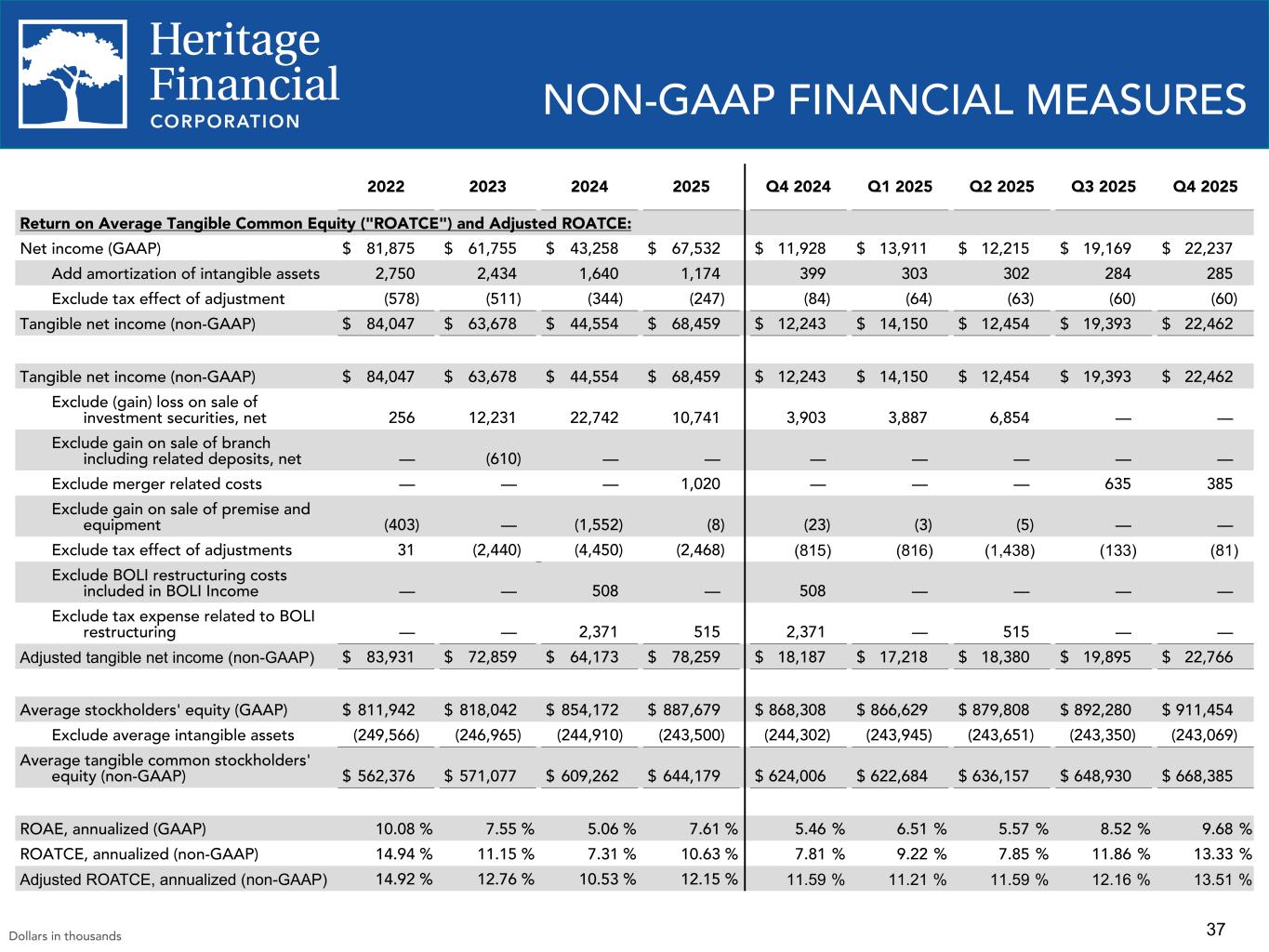 36 NON-GAAP FINANCIAL MEASURES Dollars in thousands 2022 2023 2024 2025 Q4 2024 Q1 2025 Q2 2025 Q3 2025 Q4 2025 Adjusted Net Income and Adjusted Return on Average Assets ("ROAA"): Net income (GAAP) $ 81,875 $ 61,755 $ 43,258 $ 67,532 $ 11,928 $ 13,911 $ 12,215 $ 19,169 $ 22,237 Exclude (gain) loss on sale of investment securities, net 256 12,231 22,742 10,741 3,903 3,887 6,854 — — Exclude gain on sale of branch including related deposits, net — (610) — — — — — — — Exclude merger related costs — — — 1,020 — — — 635 385 Exclude gain on sale of premise and equipment (403) — (1,552) (8) (23) (3) (5) — — Exclude tax effect of adjustments 31 (2,440) (4,450) (2,468) (815) (816) (1,438) (133) (81) Exclude BOLI restructuring costs included in BOLI Income — — 508 — 508 — — — — Exclude tax expense related to BOLI restructuring — — 2,371 515 2,371 — 515 — — Adjusted net income (non-GAAP) $ 81,759 $ 70,936 $ 62,877 $ 77,332 $ 17,872 $ 16,979 $ 18,141 $ 19,671 $ 22,541 Average ("Avg") total assets $ 7,321,455 $ 7,140,024 $ 7,133,046 $ 7,027,138 $7,149,294 $7,103,227 $7,046,943 $7,006,140 $6,954,110 ROAA, annualized (GAAP) 1.12 % 0.86 % 0.61 % 0.96 % 0.66 % 0.79 % 0.70 % 1.09 % 1.27 % Adjusted ROAA, annualized (non-GAAP) 1.12 % 0.99 % 0.88 % 1.10 % 0.99 % 0.97 % 1.03 % 1.11 % 1.29 % Adjusted Noninterest Expense / Average Assets: Noninterest Expense (GAAP) $ 150,966 $ 166,623 $ 158,296 $ 165,566 $ 39,540 $ 41,383 $ 41,085 $ 41,615 $ 41,483 Exclude merger related costs — — — 1,020 — — — 635 385 Adjusted noninterest expense (non-GAAP) $ 150,966 $ 166,623 $ 158,296 $ 164,546 $ 39,540 $ 41,383 $ 41,085 $ 40,980 $ 41,098 Avg. total assets $ 7,321,455 $ 7,140,024 $ 7,133,046 $ 7,027,138 $7,149,294 $7,103,227 $7,046,943 $7,006,140 $6,954,110 Noninterest Expense/Avg. Assets (GAAP) 2.06 % 2.33 % 2.22 % 2.36 % 2.20 % 2.36 % 2.34 % 2.36 % 2.37 % Noninterest expense/Avg. Assets (non-GAAP) 2.06 % 2.33 % 2.22 % 2.34 % 2.20 % 2.36 % 2.34 % 2.32 % 2.34 %
