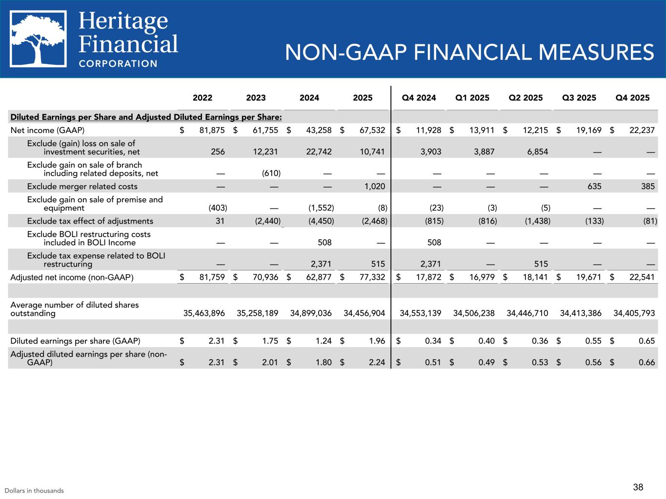 37 NON-GAAP FINANCIAL MEASURES 2022 2023 2024 2025 Q4 2024 Q1 2025 Q2 2025 Q3 2025 Q4 2025 Return on Average Tangible Common Equity ("ROATCE") and Adjusted ROATCE: Net income (GAAP) $ 81,875 $ 61,755 $ 43,258 $ 67,532 $ 11,928 $ 13,911 $ 12,215 $ 19,169 $ 22,237 Add amortization of intangible assets 2,750 2,434 1,640 1,174 399 303 302 284 285 Exclude tax effect of adjustment (578) (511) (344) (247) (84) (64) (63) (60) (60) Tangible net income (non-GAAP) $ 84,047 $ 63,678 $ 44,554 $ 68,459 $ 12,243 $ 14,150 $ 12,454 $ 19,393 $ 22,462 Tangible net income (non-GAAP) $ 84,047 $ 63,678 $ 44,554 $ 68,459 $ 12,243 $ 14,150 $ 12,454 $ 19,393 $ 22,462 Exclude (gain) loss on sale of investment securities, net 256 12,231 22,742 10,741 3,903 3,887 6,854 — — Exclude gain on sale of branch including related deposits, net — (610) — — — — — — — Exclude merger related costs — — — 1,020 — — — 635 385 Exclude gain on sale of premise and equipment (403) — (1,552) (8) (23) (3) (5) — — Exclude tax effect of adjustments 31 (2,440) (4,450) (2,468) (815) (816) (1,438) (133) (81) Exclude BOLI restructuring costs included in BOLI Income — — 508 — 508 — — — — Exclude tax expense related to BOLI restructuring — — 2,371 515 2,371 — 515 — — Adjusted tangible net income (non-GAAP) $ 83,931 $ 72,859 $ 64,173 $ 78,259 $ 18,187 $ 17,218 $ 18,380 $ 19,895 $ 22,766 Average stockholders' equity (GAAP) $ 811,942 $ 818,042 $ 854,172 $ 887,679 $ 868,308 $ 866,629 $ 879,808 $ 892,280 $ 911,454 Exclude average intangible assets (249,566) (246,965) (244,910) (243,500) (244,302) (243,945) (243,651) (243,350) (243,069) Average tangible common stockholders' equity (non-GAAP) $ 562,376 $ 571,077 $ 609,262 $ 644,179 $ 624,006 $ 622,684 $ 636,157 $ 648,930 $ 668,385 ROAE, annualized (GAAP) 10.08 % 7.55 % 5.06 % 7.61 % 5.46 % 6.51 % 5.57 % 8.52 % 9.68 % ROATCE, annualized (non-GAAP) 14.94 % 11.15 % 7.31 % 10.63 % 7.81 % 9.22 % 7.85 % 11.86 % 13.33 % Adjusted ROATCE, annualized (non-GAAP) 14.92 % 12.76 % 10.53 % 12.15 % 11.59 % 11.21 % 11.59 % 12.16 % 13.51 % Dollars in thousands