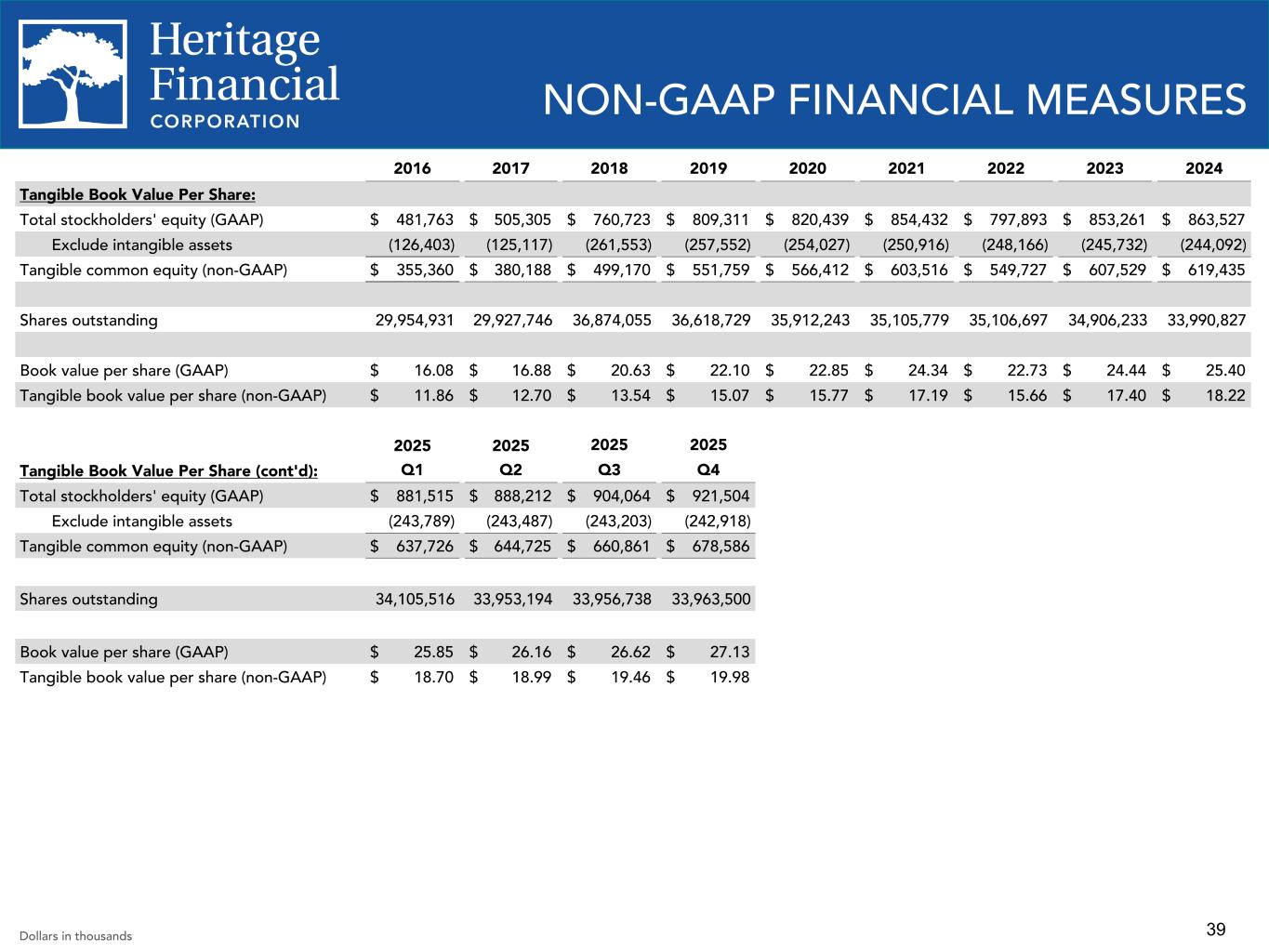 38 NON-GAAP FINANCIAL MEASURES 2022 2023 2024 2025 Q4 2024 Q1 2025 Q2 2025 Q3 2025 Q4 2025 Diluted Earnings per Share and Adjusted Diluted Earnings per Share: Net income (GAAP) $ 81,875 $ 61,755 $ 43,258 $ 67,532 $ 11,928 $ 13,911 $ 12,215 $ 19,169 $ 22,237 Exclude (gain) loss on sale of investment securities, net 256 12,231 22,742 10,741 3,903 3,887 6,854 — — Exclude gain on sale of branch including related deposits, net — (610) — — — — — — — Exclude merger related costs — — — 1,020 — — — 635 385 Exclude gain on sale of premise and equipment (403) — (1,552) (8) (23) (3) (5) — — Exclude tax effect of adjustments 31 (2,440) (4,450) (2,468) (815) (816) (1,438) (133) (81) Exclude BOLI restructuring costs included in BOLI Income — — 508 — 508 — — — — Exclude tax expense related to BOLI restructuring — — 2,371 515 2,371 — 515 — — Adjusted net income (non-GAAP) $ 81,759 $ 70,936 $ 62,877 $ 77,332 $ 17,872 $ 16,979 $ 18,141 $ 19,671 $ 22,541 Average number of diluted shares outstanding 35,463,896 35,258,189 34,899,036 34,456,904 34,553,139 34,506,238 34,446,710 34,413,386 34,405,793 Diluted earnings per share (GAAP) $ 2.31 $ 1.75 $ 1.24 $ 1.96 $ 0.34 $ 0.40 $ 0.36 $ 0.55 $ 0.65 Adjusted diluted earnings per share (non- GAAP) $ 2.31 $ 2.01 $ 1.80 $ 2.24 $ 0.51 $ 0.49 $ 0.53 $ 0.56 $ 0.66 Dollars in thousands