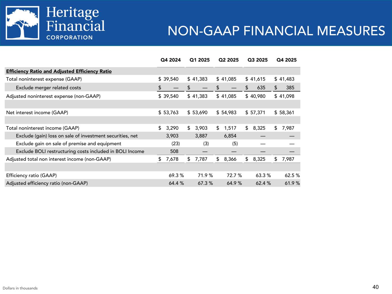 39 2016 2017 2018 2019 2020 2021 2022 2023 2024 Tangible Book Value Per Share: Total stockholders' equity (GAAP) $ 481,763 $ 505,305 $ 760,723 $ 809,311 $ 820,439 $ 854,432 $ 797,893 $ 853,261 $ 863,527 Exclude intangible assets (126,403) (125,117) (261,553) (257,552) (254,027) (250,916) (248,166) (245,732) (244,092) Tangible common equity (non-GAAP) $ 355,360 $ 380,188 $ 499,170 $ 551,759 $ 566,412 $ 603,516 $ 549,727 $ 607,529 $ 619,435 Shares outstanding 29,954,931 29,927,746 36,874,055 36,618,729 35,912,243 35,105,779 35,106,697 34,906,233 33,990,827 Book value per share (GAAP) $ 16.08 $ 16.88 $ 20.63 $ 22.10 $ 22.85 $ 24.34 $ 22.73 $ 24.44 $ 25.40 Tangible book value per share (non-GAAP) $ 11.86 $ 12.70 $ 13.54 $ 15.07 $ 15.77 $ 17.19 $ 15.66 $ 17.40 $ 18.22 Moved to 2nd slide Tangible Book Value Per Share (cont'd): 2025 2025 2025 2025 Q1 Q2 Q3 Q4 Total stockholders' equity (GAAP) $ 881,515 $ 888,212 $ 904,064 $ 921,504 Exclude intangible assets (243,789) (243,487) (243,203) (242,918) Tangible common equity (non-GAAP) $ 637,726 $ 644,725 $ 660,861 $ 678,586 Shares outstanding 34,105,516 33,953,194 33,956,738 33,963,500 Book value per share (GAAP) $ 25.85 $ 26.16 $ 26.62 $ 27.13 Tangible book value per share (non-GAAP) $ 18.70 $ 18.99 $ 19.46 $ 19.98 NON-GAAP FINANCIAL MEASURES Dollars in thousands