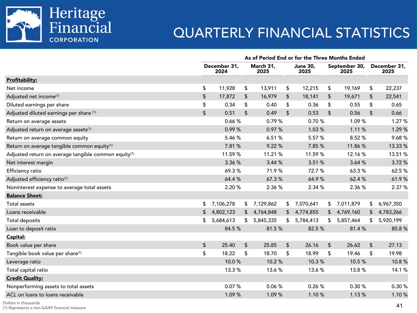 2 This presentation contains “forward-looking statements” within the meaning of the Private Securities Litigation Reform Act of 1995. Such statements often include words such as "believes," "expects," "anticipates," "estimates," “forecasts,” "intends," “plans,” “targets,” “potentially,” “probably,” “projects,” “outlook” or similar expressions or future or conditional verbs such as “may,” "will," “should,” "would," and "could," as well as the negative of such words. Forward-looking statements are not historical facts but instead represent management's current expectations and forecasts regarding future events, many of which are inherently uncertain and outside of our control. Actual results may differ, possibly materially, from those currently expected or projected in these forward-looking statements. Factors that could cause our actual results to differ materially from those described in the forward-looking statements include, but are not limited to, the following: • potential adverse impacts to economic conditions nationally or in our local market areas, other markets where Heritage Financial Corporation (the "Company") and its subsidiaries have lending relationships, or other aspects of the Company’s business operations or financial markets, including, without limitation, as a result of credit quality deterioration, pronounced and sustained reductions in real estate market values, employment levels, labor shortages and a potential recession or slowed economic growth; • changes in the interest rate environment, which could adversely affect our revenues and expenses, the value of assets and obligations, and the availability and cost of capital and liquidity; • the level and impact of inflation and the current and future monetary policies of the Board of Governors of the Federal Reserve System in response thereto; • legislative or regulatory changes that adversely affect our business, including changes in banking, securities, and tax law, in regulatory policies and principles, or the interpretation and prioritization of such rules and regulations; • effects on the U.S. economy resulting from the threat or implementation of, or changes to existing, policies and executive orders, including tariffs, immigration policy, regulatory and other governmental agencies, DEI and ESG initiatives, consumer protection, foreign policy, and tax regulations; • credit and interest rate risks associated with the Company’s businesses, customers, borrowings, repayment, investment, and deposit practices; • fluctuations in deposits and deposit concentrations; • liquidity issues, including our ability to borrow funds or raise additional capital, if necessary; • fluctuations in the value of our investment securities; • credit risks and risks from concentrations (including by type of geographic area, collateral and industry) within our loan portfolio; • disruptions, security breaches, insider fraud, cybersecurity incidents or other adverse events, failures or interruptions in, or attacks on, our information technology systems or on the third-party vendors who perform critical processing functions for our business, including sophisticated attacks using artificial intelligence and similar tools; • technological changes implemented by us and other parties, including third-party vendors, which may be more difficult to implement or more expensive than anticipated or which may have unforeseen consequences to us and our customers, including the development and implementation of tools incorporating artificial intelligence; • increased competition in the financial services industry from non-banks such as credit unions and financial technology companies, including digital asset service providers; • our ability to adapt successfully to technological changes to compete effectively in the marketplace, including as a result of competition from other commercial banks, mortgage banking firms, credit unions, securities brokerage firms, insurance companies, and financial technology companies; • our ability to implement our organic and acquisition growth strategies, including the pending acquisition of Olympic Bancorp, Inc. (“Olympic”), and our ability to successfully integrate Olympic's customers and operations following the acquisition; • effects of critical accounting policies and judgments, including the use of estimates in determining fair value of certain of our assets, which estimates may prove to be incorrect and result in significant declines in valuation; • the commencement, costs, effects and outcome of litigation and other legal proceedings and regulatory actions against us or to which the Company may become subject; • potential impairment to the goodwill the Company recorded in connection with our past acquisitions, including the pending acquisition of Olympic; • loss of, or inability to attract, key personnel; • our ability to successfully integrate any assets, liabilities, customers, systems, and management personnel we may acquire, including as a result of the acquisition of Olympic, into our operations and our ability to realize related revenue synergies and cost savings within expected time frames or at all, and any goodwill charges related thereto and costs or difficulties relating to integration matters, including but not limited to customer and employee retention, which might be greater than expected; • the effects of climate change, severe weather events, natural disasters, pandemics, epidemics and other public health crises, acts of war or terrorism, foreign relations, and other external events on our business and the businesses of our clients; • the impact of bank failures or adverse developments at other banks and related negative publicity about the banking industry in general on investor and depositor sentiment regarding the stability and liquidity of banks; and • our success at managing and responding to the risks