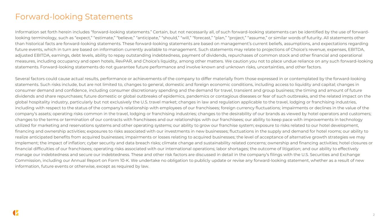 Forward-looking Statements Information set forth herein includes “forward-looking statements.” Certain, but not necessarily all, of such forward-looking statements can be identified by the use of forward- looking terminology, such as “expect,” “estimate,” “believe,” “anticipate,” “should,” “will,” “forecast,” “plan,” “project,” “assume,” or similar words of futurity. All statements other than historical facts are forward-looking statements. These forward-looking statements are based on management’s current beliefs, assumptions, and expectations regarding future events, which in turn are based on information currently available to management. Such statements may relate to projections of Choice’s revenue, expenses, EBITDA, adjusted EBITDA, earnings, debt levels, ability to repay outstanding indebtedness, payment of dividends, repurchases of common stock and other financial and operational measures, including occupancy and open hotels, RevPAR, and Choice’s liquidity, among other matters. We caution you not to place undue reliance on any such forward-looking statements. Forward-looking statements do not guarantee future performance and involve known and unknown risks, uncertainties, and other factors. Several factors could cause actual results, performance or achievements of the company to differ materially from those expressed in or contemplated by the forward-looking statements. Such risks include, but are not limited to, changes to general, domestic and foreign economic conditions, including access to liquidity and capital; changes in consumer demand and confidence, including consumer discretionary spending and the demand for travel, transient and group business; the timing and amount of future dividends and share repurchases; future domestic or global outbreaks of epidemics, pandemics or contagious diseases or fear of such outbreaks, and the related impact on the global hospitality industry, particularly but not exclusively the U.S. travel market; changes in law and regulation applicable to the travel, lodging or franchising industries, including with respect to the status of the company’s relationship with employees of our franchisees; foreign currency fluctuations; impairments or declines in the value of the company’s assets; operating risks common in the travel, lodging or franchising industries; changes to the desirability of our brands as viewed by hotel operators and customers; changes to the terms or termination of our contracts with franchisees and our relationships with our franchisees; our ability to keep pace with improvements in technology utilized for marketing and reservations systems and other operating systems; our ability to grow our franchise system; exposure to risks related to our hotel development, financing and ownership activities; exposures to risks associated with our investments in new businesses; fluctuations in the supply and demand for hotel rooms; our ability to realize anticipated benefits from acquired businesses; impairments or losses relating to acquired businesses; the level of acceptance of alternative growth strategies we may implement; the impact of inflation; cyber security and data breach risks; climate change and sustainability related concerns; ownership and financing activities; hotel closures or financial difficulties of our franchisees; operating risks associated with our international operations; labor shortages; the outcome of litigation; and our ability to effectively manage our indebtedness and secure our indebtedness. These and other risk factors are discussed in detail in the company’s filings with the U.S. Securities and Exchange Commission, including our Annual Report on Form 10-K. We undertake no obligation to publicly update or revise any forward-looking statement, whether as a result of new information, future events or otherwise, except as required by law. 2
