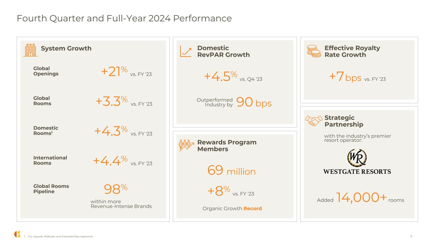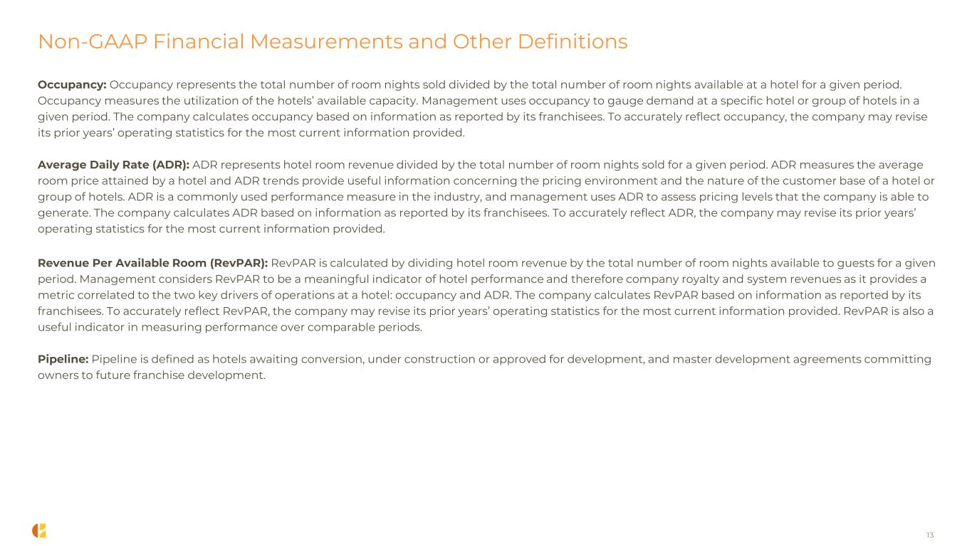 Non-GAAP Financial Measurements and Other Definitions Occupancy: Occupancy represents the total number of room nights sold divided by the total number of room nights available at a hotel for a given period. Occupancy measures the utilization of the hotels’ available capacity. Management uses occupancy to gauge demand at a specific hotel or group of hotels in a given period. The company calculates occupancy based on information as reported by its franchisees. To accurately reflect occupancy, the company may revise its prior years’ operating statistics for the most current information provided. Average Daily Rate (ADR): ADR represents hotel room revenue divided by the total number of room nights sold for a given period. ADR measures the average room price attained by a hotel and ADR trends provide useful information concerning the pricing environment and the nature of the customer base of a hotel or group of hotels. ADR is a commonly used performance measure in the industry, and management uses ADR to assess pricing levels that the company is able to generate. The company calculates ADR based on information as reported by its franchisees. To accurately reflect ADR, the company may revise its prior years’ operating statistics for the most current information provided. Revenue Per Available Room (RevPAR): RevPAR is calculated by dividing hotel room revenue by the total number of room nights available to guests for a given period. Management considers RevPAR to be a meaningful indicator of hotel performance and therefore company royalty and system revenues as it provides a metric correlated to the two key drivers of operations at a hotel: occupancy and ADR. The company calculates RevPAR based on information as reported by its franchisees. To accurately reflect RevPAR, the company may revise its prior years’ operating statistics for the most current information provided. RevPAR is also a useful indicator in measuring performance over comparable periods. Pipeline: Pipeline is defined as hotels awaiting conversion, under construction or approved for development, and master development agreements committing owners to future franchise development. 13