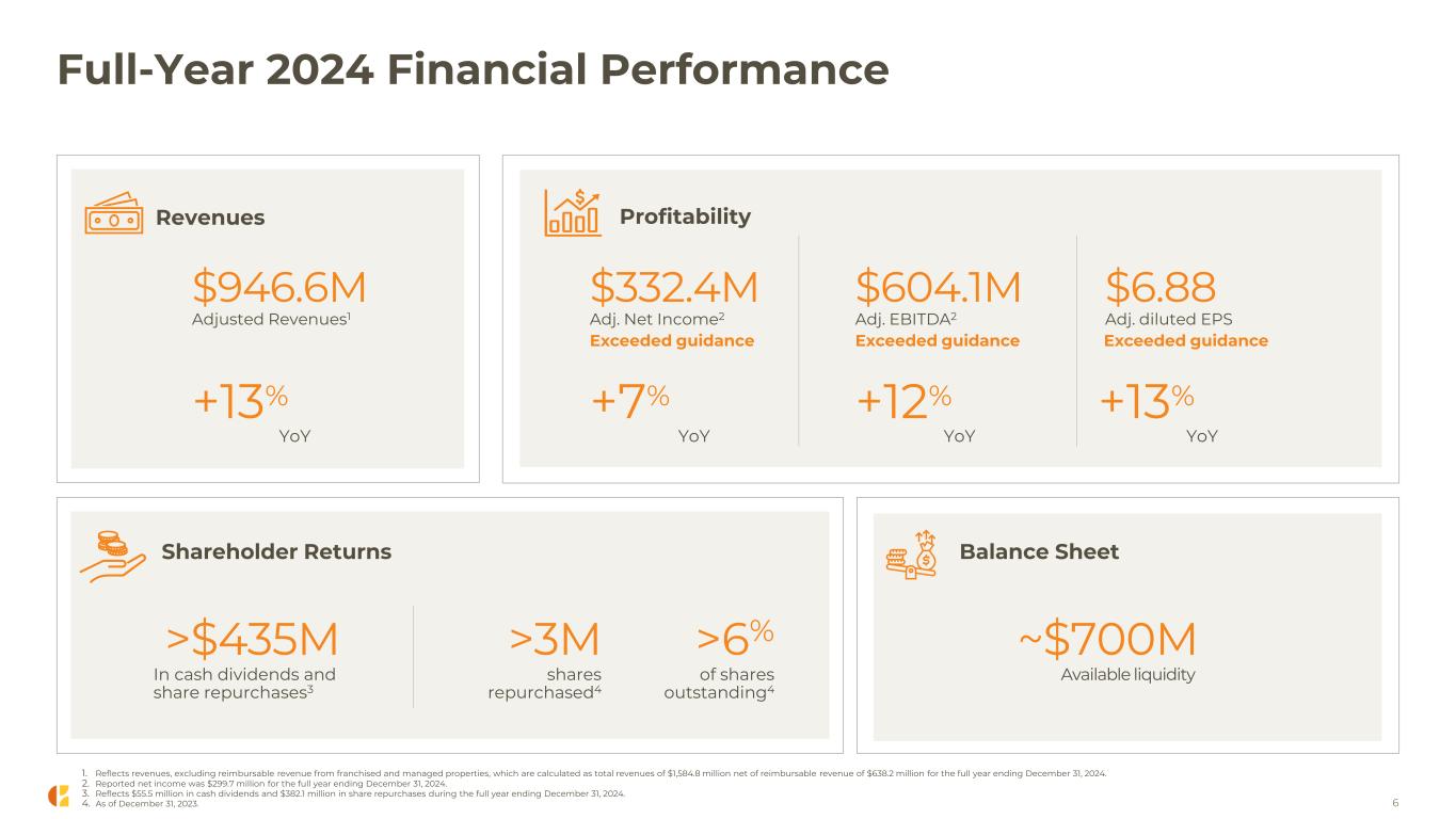 Full-Year 2024 Financial Performance Revenues Profitability $6.88 Adj. diluted EPS $604.1M Adj. EBITDA2 +12% YoY +13% YoY Balance SheetShareholder Returns ~$700M>$435M $946.6M Adjusted Revenues1 >6%>3M In cash dividends and share repurchases3 shares repurchased4 of shares outstanding4 Available liquidity 6 1. Reflects revenues, excluding reimbursable revenue from franchised and managed properties, which are calculated as total revenues of $1,584.8 million net of reimbursable revenue of $638.2 million for the full year ending December 31, 2024. 2. Reported net income was $299.7 million for the full year ending December 31, 2024. 3. Reflects $55.5 million in cash dividends and $382.1 million in share repurchases during the full year ending December 31, 2024. 4. As of December 31, 2023. +13% YoY Exceeded guidance Exceeded guidance $332.4M Adj. Net Income2 +7% YoY Exceeded guidance