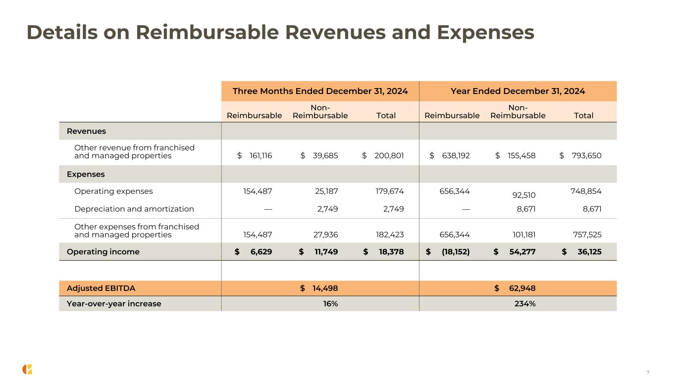 Three Months Ended December 31, 2024 Year Ended December 31, 2024 Reimbursable Non- Reimbursable Total Reimbursable Non- Reimbursable Total Revenues Other revenue from franchised and managed properties $ 161,116 $ 39,685 $ 200,801 $ 638,192 $ 155,458 $ 793,650 Expenses Operating expenses 154,487 25,187 179,674 656,344 92,510 748,854 Depreciation and amortization — 2,749 2,749 — 8,671 8,671 Other expenses from franchised and managed properties 154,487 27,936 182,423 656,344 101,181 757,525 Operating income $ 6,629 $ 11,749 $ 18,378 $ (18,152) $ 54,277 $ 36,125 Adjusted EBITDA $ 14,498 $ 62,948 Year-over-year increase 16% 234% Details on Reimbursable Revenues and Expenses 7