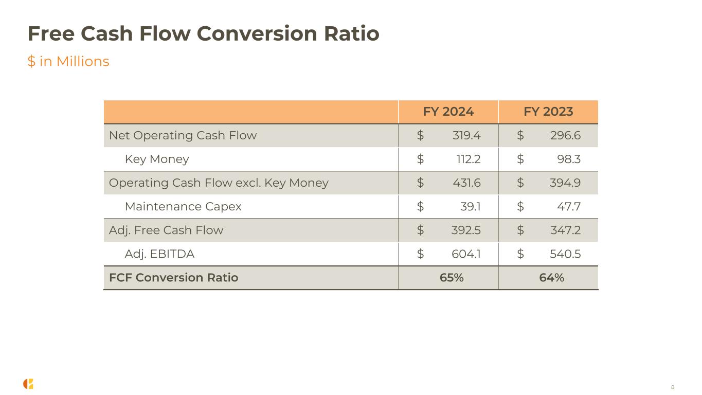 8 $ in Millions Free Cash Flow Conversion Ratio FY 2024 FY 2023 Net Operating Cash Flow $ 319.4 $ 296.6 Key Money $ 112.2 $ 98.3 Operating Cash Flow excl. Key Money $ 431.6 $ 394.9 Maintenance Capex $ 39.1 $ 47.7 Adj. Free Cash Flow $ 392.5 $ 347.2 Adj. EBITDA $ 604.1 $ 540.5 FCF Conversion Ratio 65% 64%