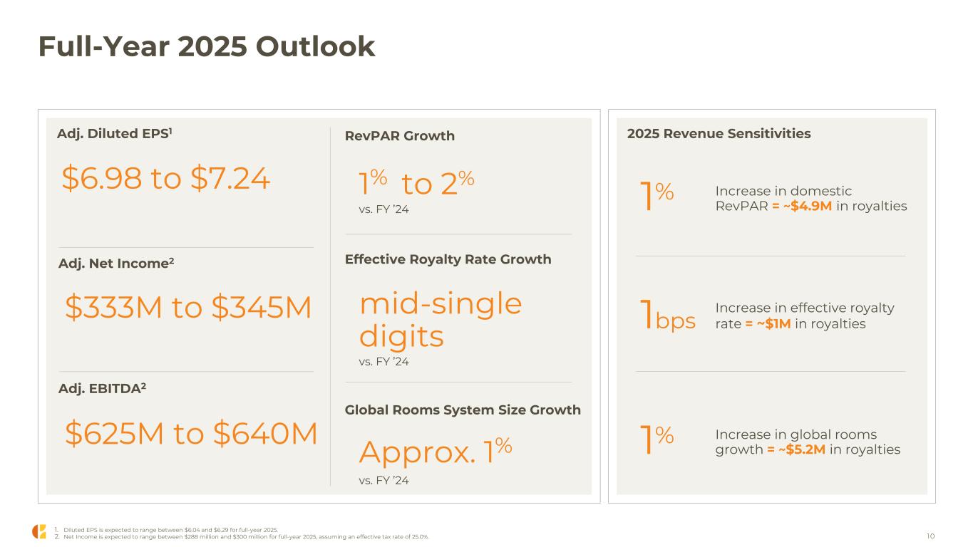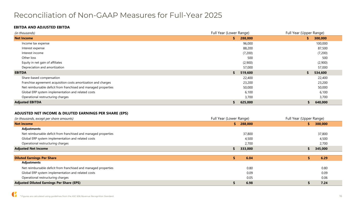 Reconciliation of Non-GAAP Measures for Full-Year 2025 EBITDA AND ADJUSTED EBITDA (in thousands) Full Year (Lower Range) Full Year (Upper Range) Net Income $ 288,000 $ 300,000 Income tax expense 96,000 100,000 Interest expense 88,200 87,500 Interest income (7,200) (7,200) Other loss 500 500 Equity in net gain of affiliates (2,900) (2,900) Depreciation and amortization 57,000 57,000 EBITDA $ 519,600 $ 534,600 Share-based compensation 22,400 22,400 Franchise agreement acquisition costs amortization and charges 23,200 23,200 Net reimbursable deficit from franchised and managed properties 50,000 50,000 Global ERP system implementation and related costs 6,100 6,100 Operational restructuring charges 3,700 3,700 Adjusted EBITDA $ 625,000 $ 640,000 ADJUSTED NET INCOME & DILUTED EARNINGS PER SHARE (EPS) (in thousands, except per share amounts) Full Year (Lower Range) Full Year (Upper Range) Net income $ 288,000 $ 300,000 Adjustments Net reimbursable deficit from franchised and managed properties 37,800 37,800 Global ERP system implementation and related costs 4,500 4,500 Operational restructuring charges 2,700 2,700 Adjusted Net Income $ 333,000 $ 345,000 Diluted Earnings Per Share $ 6.04 $ 6.29 Adjustments Net reimbursable deficit from franchised and managed properties 0.80 0.80 Global ERP system implementation and related costs 0.09 0.09 Operational restructuring charges 0.05 0.06 Adjusted Diluted Earnings Per Share (EPS) $ 6.98 $ 7.24 16* Figures are calculated using guidelines from the ASC 606 Revenue Recognition Standard.