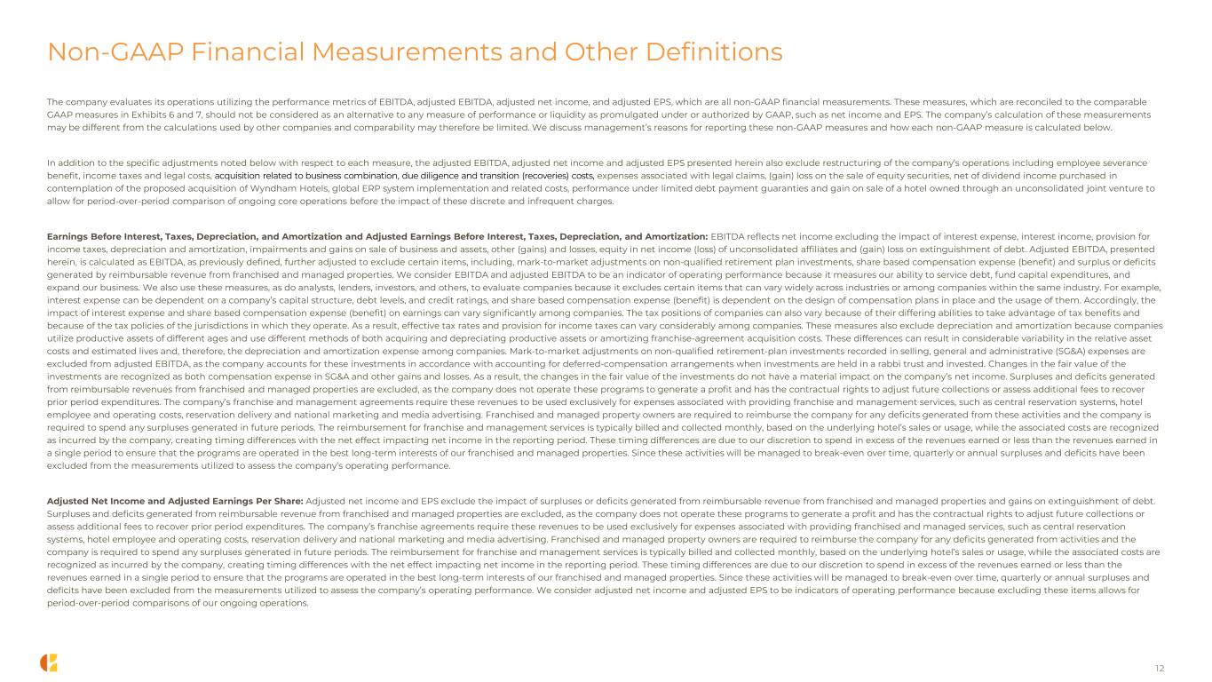 Non-GAAP Financial Measurements and Other Definitions The company evaluates its operations utilizing the performance metrics of EBITDA, adjusted EBITDA, adjusted net income, and adjusted EPS, which are all non-GAAP financial measurements. These measures, which are reconciled to the comparable GAAP measures in Exhibits 6 and 7, should not be considered as an alternative to any measure of performance or liquidity as promulgated under or authorized by GAAP, such as net income and EPS. The company’s calculation of these measurements may be different from the calculations used by other companies and comparability may therefore be limited. We discuss management’s reasons for reporting these non-GAAP measures and how each non-GAAP measure is calculated below. In addition to the specific adjustments noted below with respect to each measure, the adjusted EBITDA, adjusted net income and adjusted EPS presented herein also exclude restructuring of the company’s operations including employee severance benefit, income taxes and legal costs, acquisition related to business combination, due diligence and transition (recoveries) costs, expenses associated with legal claims, (gain) loss on the sale of equity securities, net of dividend income purchased in contemplation of the proposed acquisition of Wyndham Hotels, global ERP system implementation and related costs, performance under limited debt payment guaranties and gain on sale of a hotel owned through an unconsolidated joint venture to allow for period-over-period comparison of ongoing core operations before the impact of these discrete and infrequent charges. Earnings Before Interest, Taxes, Depreciation, and Amortization and Adjusted Earnings Before Interest, Taxes, Depreciation, and Amortization: EBITDA reflects net income excluding the impact of interest expense, interest income, provision for income taxes, depreciation and amortization, impairments and gains on sale of business and assets, other (gains) and losses, equity in net income (loss) of unconsolidated affiliates and (gain) loss on extinguishment of debt. Adjusted EBITDA, presented herein, is calculated as EBITDA, as previously defined, further adjusted to exclude certain items, including, mark-to-market adjustments on non-qualified retirement plan investments, share based compensation expense (benefit) and surplus or deficits generated by reimbursable revenue from franchised and managed properties. We consider EBITDA and adjusted EBITDA to be an indicator of operating performance because it measures our ability to service debt, fund capital expenditures, and expand our business. We also use these measures, as do analysts, lenders, investors, and others, to evaluate companies because it excludes certain items that can vary widely across industries or among companies within the same industry. For example, interest expense can be dependent on a company’s capital structure, debt levels, and credit ratings, and share based compensation expense (benefit) is dependent on the design of compensation plans in place and the usage of them. Accordingly, the impact of interest expense and share based compensation expense (benefit) on earnings can vary significantly among companies. The tax positions of companies can also vary because of their differing abilities to take advantage of tax benefits and because of the tax policies of the jurisdictions in which they operate. As a result, effective tax rates and provision for income taxes can vary considerably among companies. These measures also exclude depreciation and amortization because companies utilize productive assets of different ages and use different methods of both acquiring and depreciating productive assets or amortizing franchise-agreement acquisition costs. These differences can result in considerable variability in the relative asset costs and estimated lives and, therefore, the depreciation and amortization expense among companies. Mark-to-market adjustments on non-qualified retirement-plan investments recorded in selling, general and administrative (SG&A) expenses are excluded from adjusted EBITDA, as the company accounts for these investments in accordance with accounting for deferred-compensation arrangements when investments are held in a rabbi trust and invested. Changes in the fair value of the investments are recognized as both compensation expense in SG&A and other gains and losses. As a result, the changes in the fair value of the investments do not have a material impact on the company’s net income. Surpluses and deficits generated from reimbursable revenues from franchised and managed properties are excluded, as the company does not operate these programs to generate a profit and has the contractual rights to adjust future collections or assess additional fees to recover prior period expenditures. The company’s franchise and management agreements require these revenues to be used exclusively for expenses associated with providing franchise and management services, such as central reservation systems, hotel employee and operating costs, reservation delivery and national marketing and media advertising. Franchised and managed property owners are required to reimburse the company for any deficits generated from these activities and the company is required to spend any surpluses generated in future periods. The reimbursement for franchise and management services is typically billed and collected monthly, based on the underlying hotel’s sales or usage, while the associated costs are recognized as incurred by the company, creating timing differences with the net effect impacting net income in the reporting period. These timing differences are due to our discretion to spend in excess of the revenues earned or less than the revenues earned in a single period to ensure that the programs are operated in the best long-term interests of our franchised and managed properties. Since these activities will be managed to break-ev