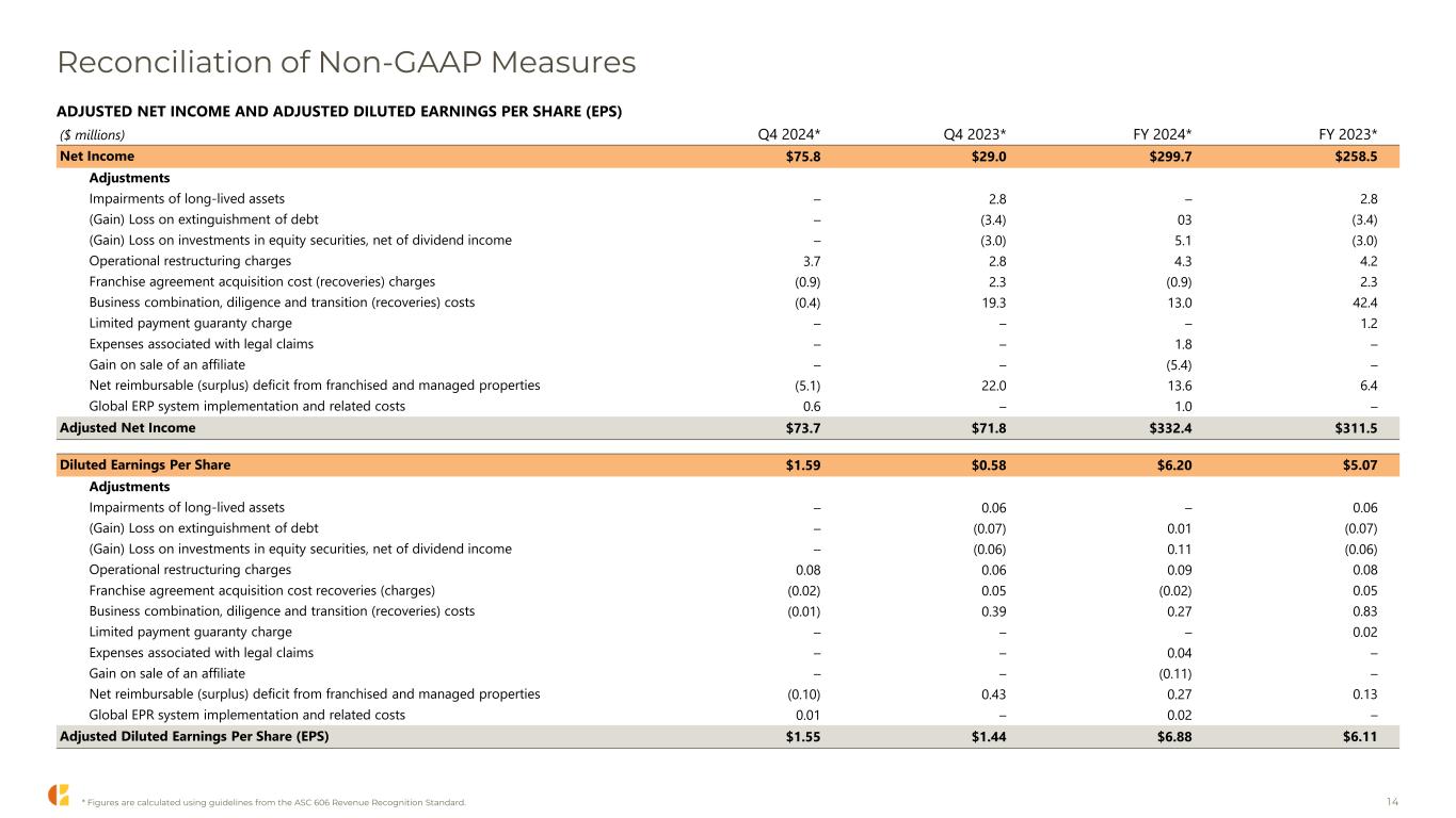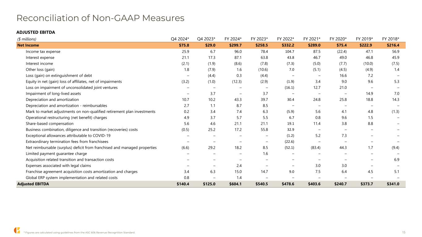Reconciliation of Non-GAAP Measures 15 ADJUSTED EBITDA ($ millions) Q4 2024* Q4 2023* FY 2024* FY 2023* FY 2022* FY 2021* FY 2020* FY 2019* FY 2018* Net Income $75.8 $29.0 $299.7 $258.5 $332.2 $289.0 $75.4 $222.9 $216.4 Income tax expense 25.9 6.7 96.0 78.4 104.7 87.5 (22.4) 47.1 56.9 Interest expense 21.1 17.3 87.1 63.8 43.8 46.7 49.0 46.8 45.9 Interest income (2.1) (1.9) (8.6) (7.8) (7.3) (5.0) (7.7) (10.0) (7.5) Other loss (gain) 1.8 (7.9) 1.6 (10.6) 7.0 (5.1) (4.5) (4.9) 1.4 Loss (gain) on extinguishment of debt – (4.4) 0.3 (4.4) – – 16.6 7.2 – Equity in net (gain) loss of affiliates, net of impairments (3.2) (1.0) (12.3) (2.9) (1.9) 3.4 9.0 9.6 5.3 Loss on impairment of unconsolidated joint ventures – – – – (16.1) 12.7 21.0 – – Impairment of long-lived assets – 3.7 – 3.7 – – – 14.9 7.0 Depreciation and amortization 10.7 10.2 43.3 39.7 30.4 24.8 25.8 18.8 14.3 Depreciation and amortization - reimbursables 2.7 1.1 8.7 8.5 – – – – – Mark to market adjustments on non-qualified retirement plan investments 0.2 3.4 7.4 6.3 (5.9) 5.6 4.1 4.8 (1.3) Operational restructuring (net benefit) charges 4.9 3.7 5.7 5.5 6.7 0.8 9.6 1.5 – Share-based compensation 5.6 4.6 21.1 21.1 19.1 11.4 3.8 8.8 – Business combination, diligence and transition (recoveries) costs (0.5) 25.2 17.2 55.8 32.9 – – – – Exceptional allowances attributable to COVID-19 – – – – (1.2) 5.2 7.3 – – Extraordinary termination fees from franchisees – – – – (22.6) – – – – Net reimbursable (surplus) deficit from franchised and managed properties (6.6) 29.2 18.2 8.5 (52.1) (83.4) 44.3 1.7 (9.4) Limited payment guarantee charge – – – 1.6 – – – – – Acquisition related transition and transaction costs – – – – – – – – 6.9 Expenses associated with legal claims – – 2.4 – – 3.0 3.0 – – Franchise agreement acquisition costs amortization and charges 3.4 6.3 15.0 14.7 9.0 7.5 6.4 4.5 5.1 Global ERP system implementation and related costs 0.8 – 1.4 – – – – – – Adjusted EBITDA $140.4 $125.0 $604.1 $540.5 $478.6 $403.6 $240.7 $373.7 $341.0 * Figures are calculated using guidelines from the ASC 606 Revenue Recognition Standard.