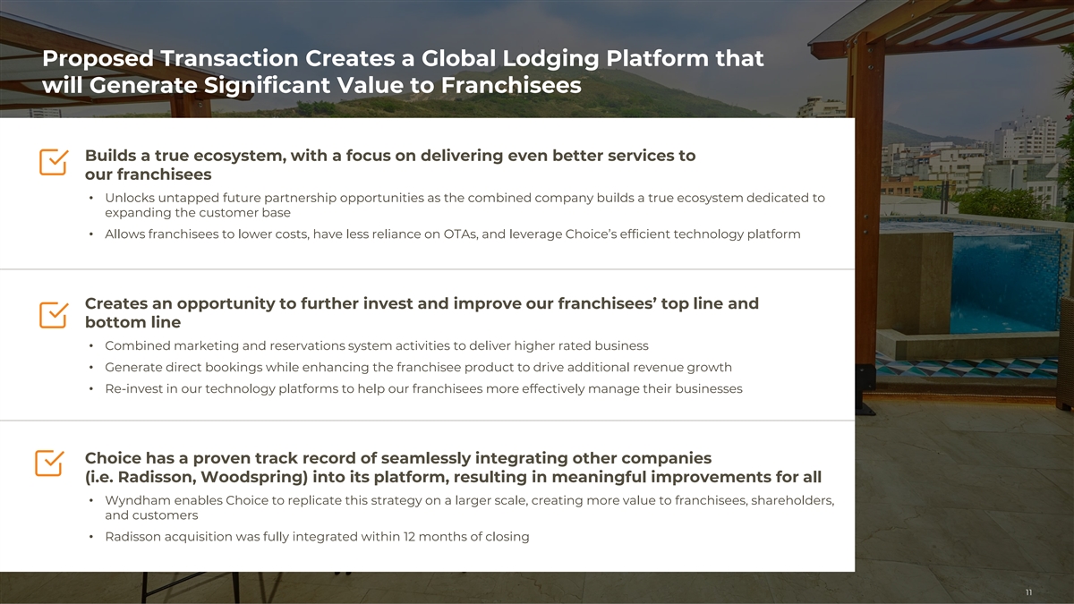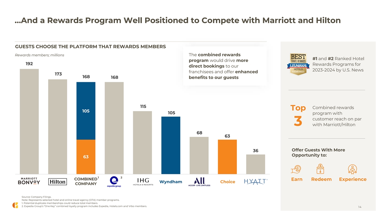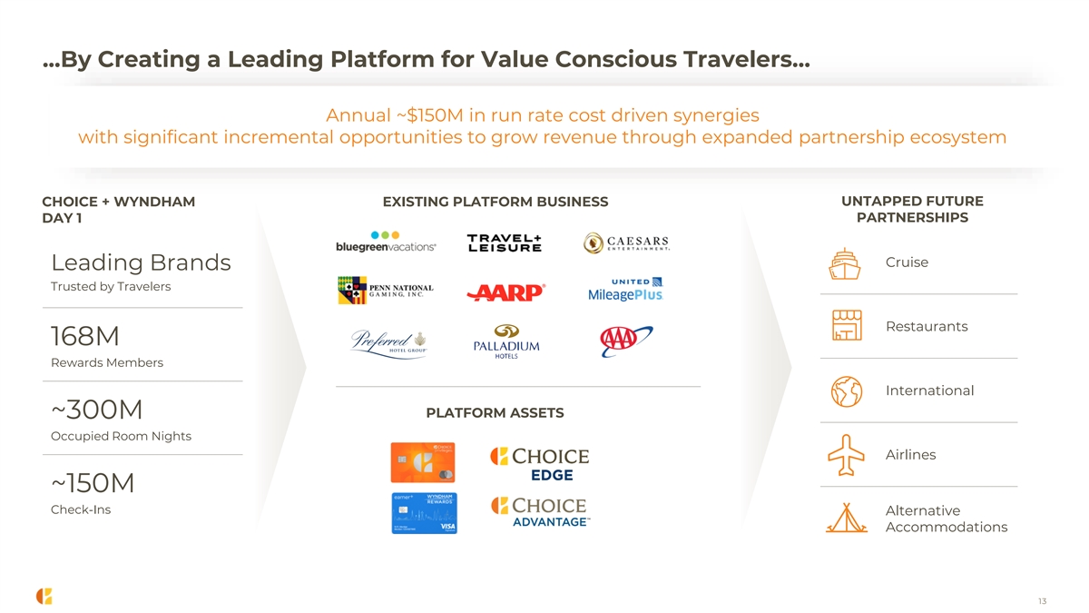 ...By Creating a Leading Platform for Value Conscious Travelers… Annual ~$150M in run rate cost driven synergies with significant incremental opportunities to grow revenue through expanded partnership ecosystem UNTAPPED FUTURE CHOICE + WYNDHAM EXISTING PLATFORM BUSINESS DAY 1 PARTNERSHIPS Cruise Leading Brands Trusted by Travelers Restaurants 168M Rewards Members International PLATFORM ASSETS ~300M Occupied Room Nights Airlines ~150M Check-Ins Alternative Accommodations 13