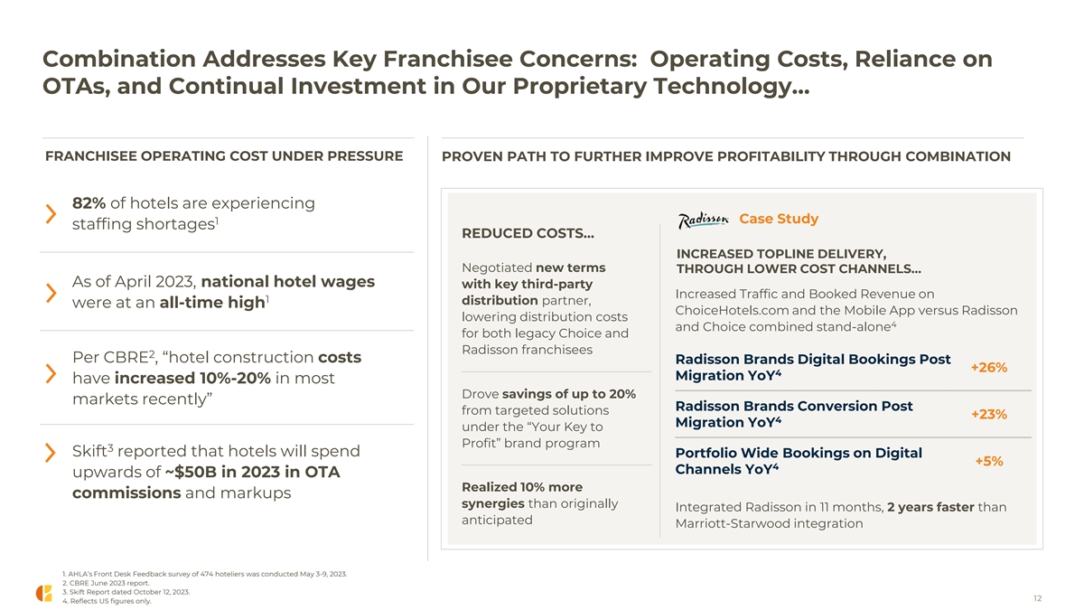 Proposed Transaction Creates a Global Lodging Platform that will Generate Significant Value to Franchisees Builds a true ecosystem, with a focus on delivering even better services to our franchisees • Unlocks untapped future partnership opportunities as the combined company builds a true ecosystem dedicated to expanding the customer base • Allows franchisees to lower costs, have less reliance on OTAs, and leverage Choice’s efficient technology platform - Creates an opportunity to further invest and improve our franchisees’ top line and bottom line • Combined marketing and reservations system activities to deliver higher rated business • Generate direct bookings while enhancing the franchisee product to drive additional revenue growth • Re-invest in our technology platforms to help our franchisees more effectively manage their businesses Choice has a proven track record of seamlessly integrating other companies (i.e. Radisson, Woodspring) into its platform, resulting in meaningful improvements for all • Wyndham enables Choice to replicate this strategy on a larger scale, creating more value to franchisees, shareholders, and customers • Radisson acquisition was fully integrated within 12 months of closing 11