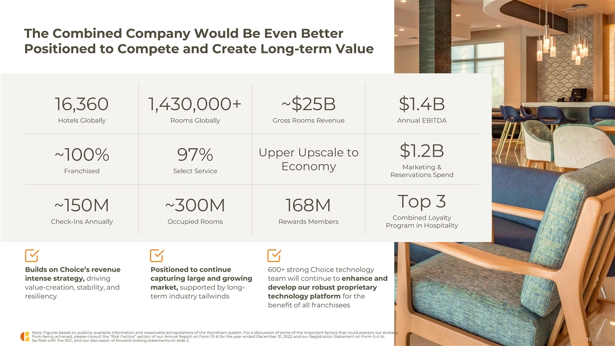 The Combined Company Would Be Even Better Positioned to Compete and Create Long-term Value 16,360 1,430,000+ ~$25B $1.4B Hotels Globally Rooms Globally Gross Rooms Revenue Annual EBITDA Upper Upscale to $1.2B ~100% 97% Marketing & Economy Franchised Select Service Reservations Spend Top 3 ~150M ~300M 168M Combined Loyalty Check-Ins Annually Occupied Rooms Rewards Members Program in Hospitality Builds on Choice’s revenue Positioned to continue 600+ strong Choice technology intense strategy, driving capturing large and growing team will continue to enhance and value-creation, stability, and market, supported by long- develop our robust proprietary resiliency term industry tailwinds technology platform for the benefit of all franchisees Note: Figures based on publicly available information and reasonable extrapolations of the Wyndham system. For a discussion of some of the important factors that could prevent our strategy from being achieved, please consult the “Risk Factors” section of our Annual Report on Form 10-K for the year ended December 31, 2022 and our Registration Statement on Form S-4 to 15 15 be filed with the SEC, and our discussion of forward-looking statements on slide 2.