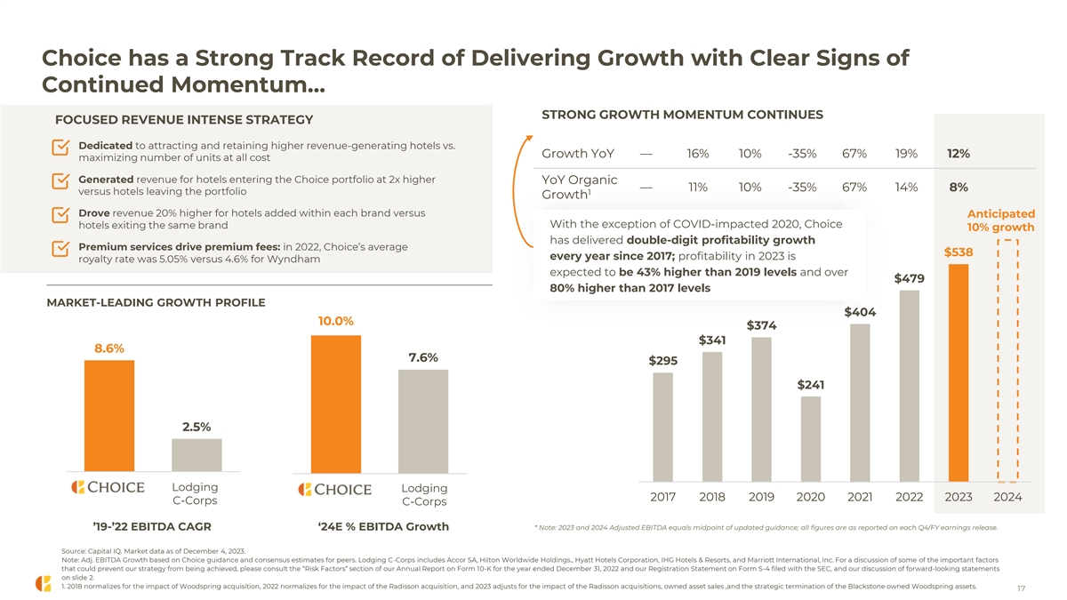 Choice has a Strong Track Record of Delivering Growth with Clear Signs of Continued Momentum… STRONG GROWTH MOMENTUM CONTINUES FOCUSED REVENUE INTENSE STRATEGY Dedicated to attracting and retaining higher revenue-generating hotels vs. Growth YoY — 16% 10% -35% 67% 19% 12% maximizing number of units at all cost Generated revenue for hotels entering the Choice portfolio at 2x higher YoY Organic — 11% 10% -35% 67% 14% 8% versus hotels leaving the portfolio 1 Growth Drove revenue 20% higher for hotels added within each brand versus Anticipated With the exception of COVID-impacted 2020, Choice hotels exiting the same brand 10% growth has delivered double-digit profitability growth Premium services drive premium fees: in 2022, Choice’s average $538 every year since 2017; profitability in 2023 is royalty rate was 5.05% versus 4.6% for Wyndham expected to be 43% higher than 2019 levels and over $479 80% higher than 2017 levels MARKET-LEADING GROWTH PROFILE $404 10.0% $374 $341 8.6% 7.6% $295 $241 2.5% Lodging Lodging 2017 2018 2019 2020 2021 2022 2023 2024 C-Corps C-Corps * Note: 2023 and 2024 Adjusted EBITDA equals midpoint of updated guidance; all figures are as reported on each Q4/FY earnings release. ’19-’22 EBITDA CAGR ‘24E % EBITDA Growth Source: Capital IQ. Market data as of December 4, 2023. Note: Adj. EBITDA Growth based on Choice guidance and consensus estimates for peers. Lodging C-Corps includes Accor SA, Hilton Worldwide Holdings., Hyatt Hotels Corporation, IHG Hotels & Resorts, and Marriott International, Inc. For a discussion of some of the important factors that could prevent our strategy from being achieved, please consult the “Risk Factors” section of our Annual Report on Form 10-K for the year ended December 31, 2022 and our Registration Statement on Form S-4 filed with the SEC, and our discussion of forward-looking statements on slide 2. 1. 2018 normalizes for the impact of Woodspring acquisition, 2022 normalizes for the impact of the Radisson acquisition, and 2023 adjusts for the impact of the Radisson acquisitions, owned asset sales ,and the strategic termination of the Blackstone owned Woodspring assets. 17
