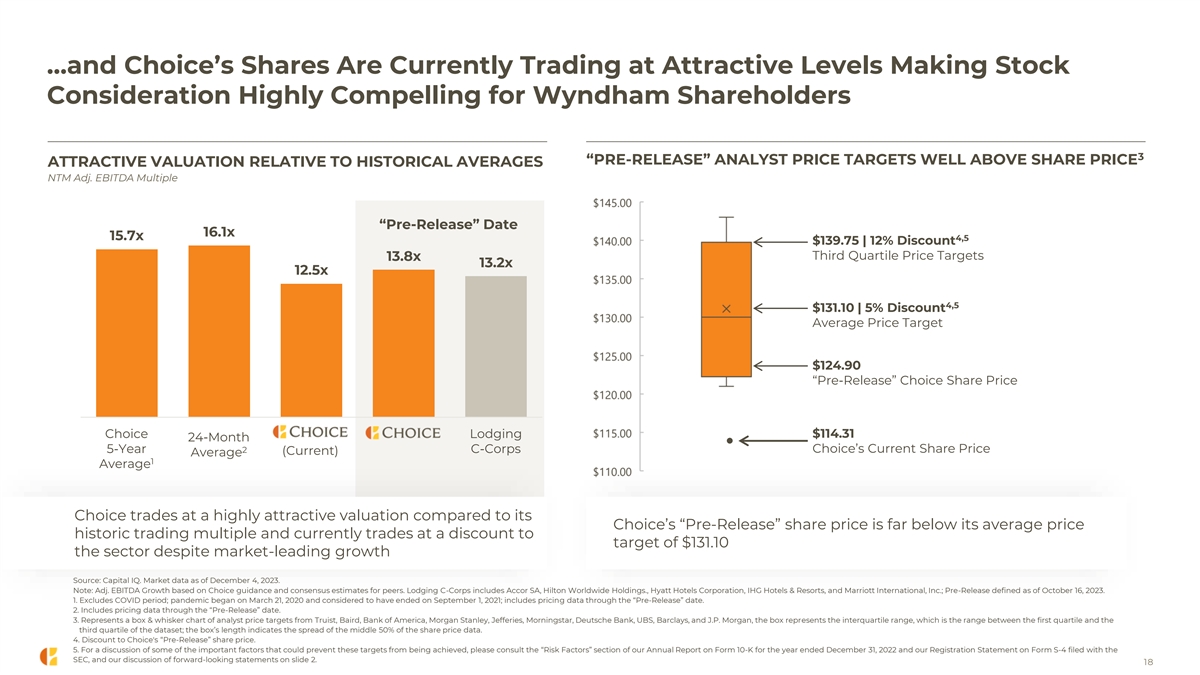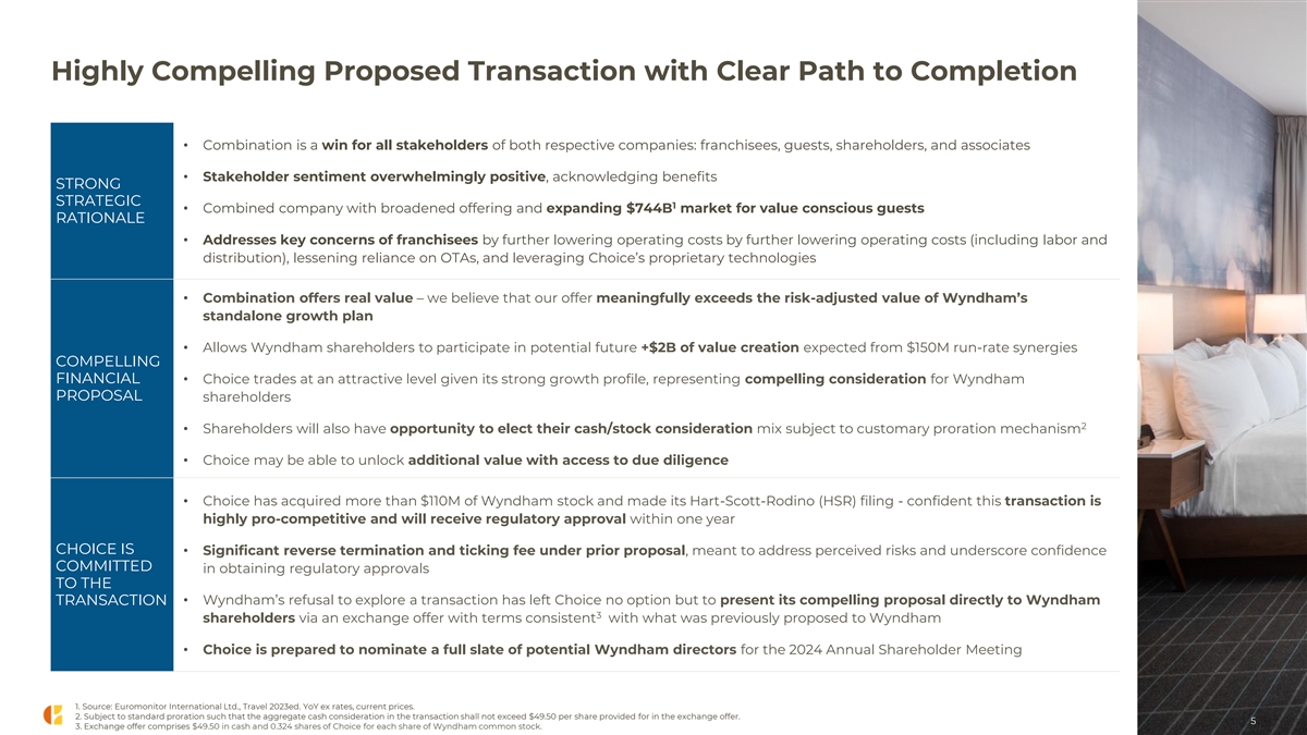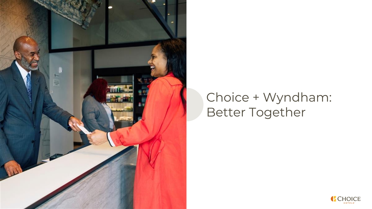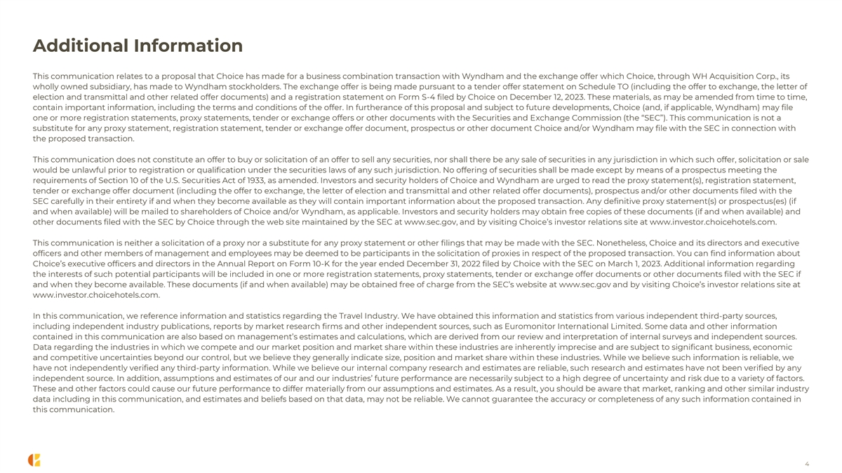Additional Information This communication relates to a proposal that Choice has made for a business combination transaction with Wyndham and the exchange offer which Choice, through WH Acquisition Corp., its wholly owned subsidiary, has made to Wyndham stockholders. The exchange offer is being made pursuant to a tender offer statement on Schedule TO (including the offer to exchange, the letter of election and transmittal and other related offer documents) and a registration statement on Form S-4 filed by Choice on December 12, 2023. These materials, as may be amended from time to time, contain important information, including the terms and conditions of the offer. In furtherance of this proposal and subject to future developments, Choice (and, if applicable, Wyndham) may file one or more registration statements, proxy statements, tender or exchange offers or other documents with the Securities and Exchange Commission (the “SEC”). This communication is not a substitute for any proxy statement, registration statement, tender or exchange offer document, prospectus or other document Choice and/or Wyndham may file with the SEC in connection with the proposed transaction. This communication does not constitute an offer to buy or solicitation of an offer to sell any securities, nor shall there be any sale of securities in any jurisdiction in which such offer, solicitation or sale would be unlawful prior to registration or qualification under the securities laws of any such jurisdiction. No offering of securities shall be made except by means of a prospectus meeting the requirements of Section 10 of the U.S. Securities Act of 1933, as amended. Investors and security holders of Choice and Wyndham are urged to read the proxy statement(s), registration statement, tender or exchange offer document (including the offer to exchange, the letter of election and transmittal and other related offer documents), prospectus and/or other documents filed with the SEC carefully in their entirety if and when they become available as they will contain important information about the proposed transaction. Any definitive proxy statement(s) or prospectus(es) (if and when available) will be mailed to shareholders of Choice and/or Wyndham, as applicable. Investors and security holders may obtain free copies of these documents (if and when available) and other documents filed with the SEC by Choice through the web site maintained by the SEC at www.sec.gov, and by visiting Choice’s investor relations site at www.investor.choicehotels.com. This communication is neither a solicitation of a proxy nor a substitute for any proxy statement or other filings that may be made with the SEC. Nonetheless, Choice and its directors and executive officers and other members of management and employees may be deemed to be participants in the solicitation of proxies in respect of the proposed transaction. You can find information about Choice’s executive officers and directors in the Annual Report on Form 10-K for the year ended December 31, 2022 filed by Choice with the SEC on March 1, 2023. Additional information regarding the interests of such potential participants will be included in one or more registration statements, proxy statements, tender or exchange offer documents or other documents filed with the SEC if and when they become available. These documents (if and when available) may be obtained free of charge from the SEC’s website at www.sec.gov and by visiting Choice’s investor relations site at www.investor.choicehotels.com. In this communication, we reference information and statistics regarding the Travel Industry. We have obtained this information and statistics from various independent third-party sources, including independent industry publications, reports by market research firms and other independent sources, such as Euromonitor International Limited. Some data and other information contained in this communication are also based on management’s estimates and calculations, which are derived from our review and interpretation of internal surveys and independent sources. Data regarding the industries in which we compete and our market position and market share within these industries are inherently imprecise and are subject to significant business, economic and competitive uncertainties beyond our control, but we believe they generally indicate size, position and market share within these industries. While we believe such information is reliable, we have not independently verified any third-party information. While we believe our internal company research and estimates are reliable, such research and estimates have not been verified by any independent source. In addition, assumptions and estimates of our and our industries’ future performance are necessarily subject to a high degree of uncertainty and risk due to a variety of factors. These and other factors could cause our future performance to differ materially from our assumptions and estimates. As a result, you should be aware that market, ranking and other similar industry data including in this communication, and estimates and beliefs based on that data, may not be reliable. We cannot guarantee the accuracy or completeness of any such information contained in this communication. 4