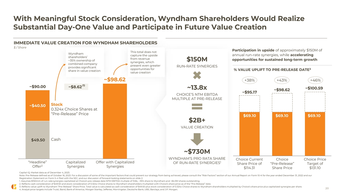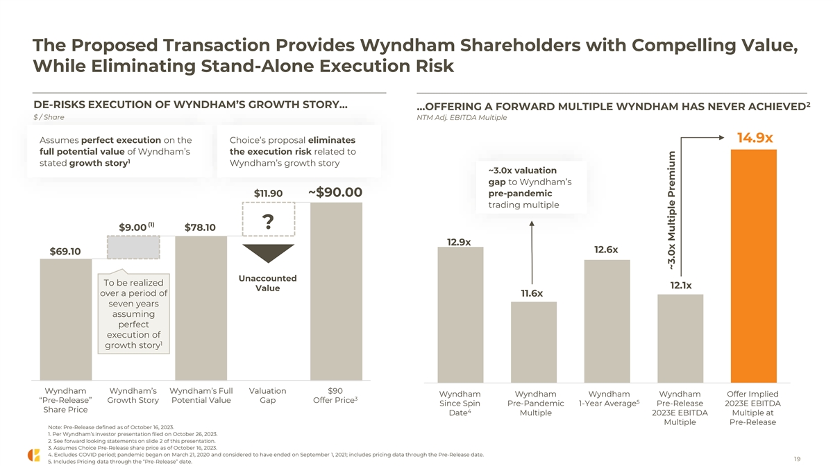 …and Choice’s Shares Are Currently Trading at Attractive Levels Making Stock Consideration Highly Compelling for Wyndham Shareholders 3 “PRE-RELEASE” ANALYST PRICE TARGETS WELL ABOVE SHARE PRICE ATTRACTIVE VALUATION RELATIVE TO HISTORICAL AVERAGES NTM Adj. EBITDA Multiple “Pre-Release” Date 16.1x 15.7x 4,5 $139.75 | 12% Discount Third Quartile Price Targets 13.8x 13.2x 12.5x 4,5 $131.10 | 5% Discount Average Price Target $124.90 “Pre-Release” Choice Share Price $114.31 Choice Lodging 24-Month 2 Choice’s Current Share Price 5-Year C-Corps (Current) Average 1 Average Choice trades at a highly attractive valuation compared to its Choice’s “Pre-Release” share price is far below its average price historic trading multiple and currently trades at a discount to target of $131.10 the sector despite market-leading growth Source: Capital IQ. Market data as of December 4, 2023. Note: Adj. EBITDA Growth based on Choice guidance and consensus estimates for peers. Lodging C-Corps includes Accor SA, Hilton Worldwide Holdings., Hyatt Hotels Corporation, IHG Hotels & Resorts, and Marriott International, Inc.; Pre-Release defined as of October 16, 2023. 1. Excludes COVID period; pandemic began on March 21, 2020 and considered to have ended on September 1, 2021; includes pricing data through the “Pre-Release” date. 2. Includes pricing data through the “Pre-Release” date. 3. Represents a box & whisker chart of analyst price targets from Truist, Baird, Bank of America, Morgan Stanley, Jefferies, Morningstar, Deutsche Bank, UBS, Barclays, and J.P. Morgan, the box represents the interquartile range, which is the range between the first quartile and the third quartile of the dataset; the box’s length indicates the spread of the middle 50% of the share price data. 4. Discount to Choice's “Pre-Release” share price. 5. For a discussion of some of the important factors that could prevent these targets from being achieved, please consult the “Risk Factors” section of our Annual Report on Form 10-K for the year ended December 31, 2022 and our Registration Statement on Form S-4 filed with the SEC, and our discussion of forward-looking statements on slide 2. 18