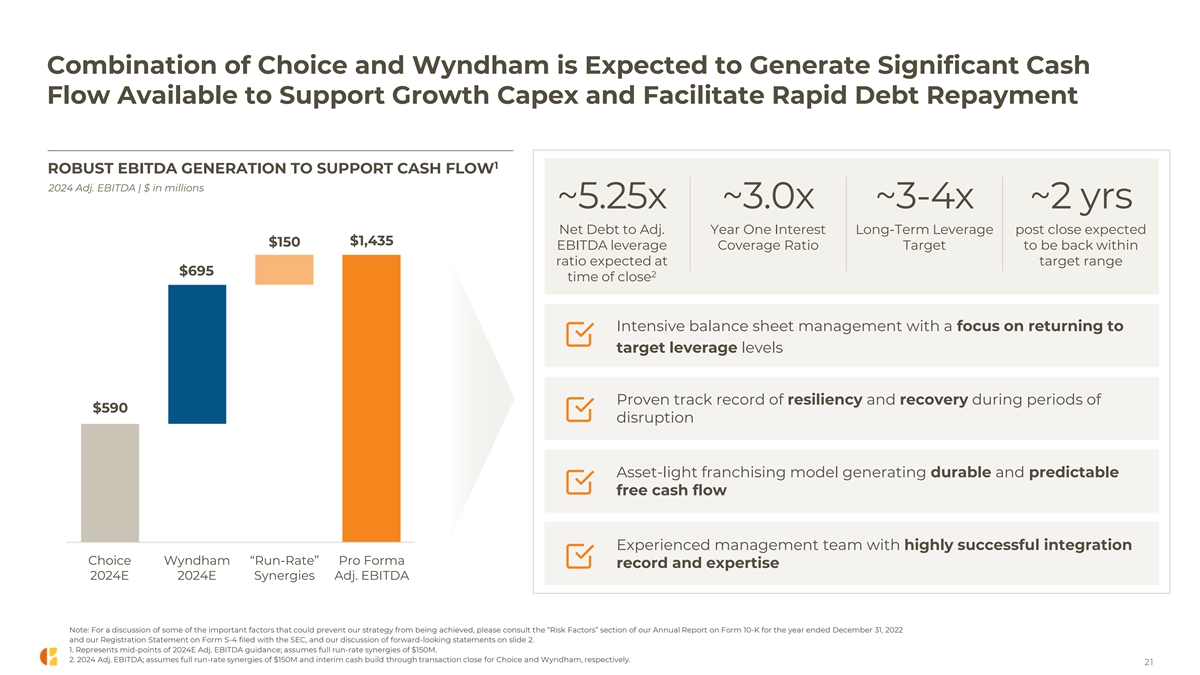 With Meaningful Stock Consideration, Wyndham Shareholders Would Realize Substantial Day-One Value and Participate in Future Value Creation IMMEDIATE VALUE CREATION FOR WYNDHAM SHAREHOLDERS $ / Share Participation in upside of approximately $150M of This total does not Wyndham annual run-rate synergies, while accelerating capture the upside shareholders’ from revenue opportunities for sustained long-term growth ~35% ownership of $150M synergies, which combined company present even greater RUN-RATE SYNERGIES provides significant opportunities for 3 % VALUE UPLIFT TO PRE-RELEASE DATE share in value creation value creation ~$98.62 +38% +43% +46% (1) ~$90.00 ~$8.62 ~13.8x ~$100.59 ~$98.62 ~$95.17 CHOICE’S NTM EBITDA MULTIPLE AT PRE-RELEASE Stock ~$40.50 0.324x Choice Shares at “Pre-Release” Price $69.10 $69.10 $69.10 $2B+ VALUE CREATION Cash $49.50 ~$730M WYNDHAM’S PRO RATA SHARE Choice Current Choice Choice Price 1 “Headline” Capitalized Offer with Capitalized OF RUN-RATE SYNERGIES Share Price of “Pre-Release” Target of 2 Offer Synergies Synergies $114.31 Share Price $131.10 Capital IQ. Market data as of December 4, 2023. Note: Pre-Release defined as of October 16, 2023. For a discussion of some of the important factors that could prevent our strategy from being achieved, please consult the “Risk Factors” section of our Annual Report on Form 10-K for the year ended December 31, 2022 and our Registration Statement on Form S-4 filed with the SEC, and our discussion of forward-looking statements on slide 2. 1. Assumes $150mm of run-rate synergies capitalized at Choice’s pre-release date NTM EBITDA multiple of 13.8x, ~35% share to Wyndham and ~84.9M shares outstanding. 2. Reflects cash consideration of $49.50 and stock consideration of 0.324x Choice shares to Wyndham shareholders multiplied with Choice’s share price as of the “Pre-Release” date. 3. Reflects value uplift to Wyndham “Pre-Release” Share Price. Total value is calculated as cash consideration of $49.50 plus stock consideration of 0.324x Choice shares to Wyndham shareholders multiplied by Choice’s share price plus capitalized synergies per share. 20 4. Analyst price targets include Truist, Baird, Bank of America, Morgan Stanley, Jefferies, Morningstar, Deutsche Bank, UBS, Barclays, and J.P. Morgan.
