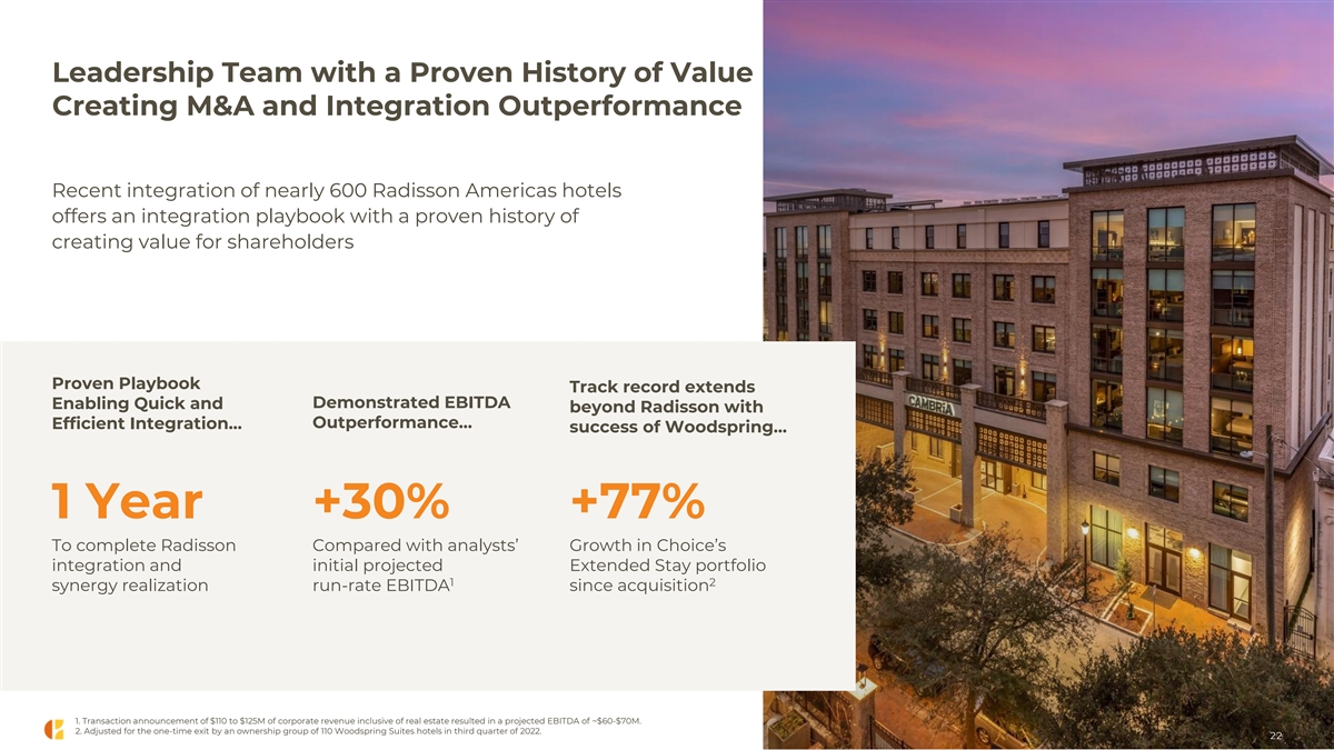 Combination of Choice and Wyndham is Expected to Generate Significant Cash Flow Available to Support Growth Capex and Facilitate Rapid Debt Repayment 1 ROBUST EBITDA GENERATION TO SUPPORT CASH FLOW 2024 Adj. EBITDA | $ in millions ~5.25x ~3.0x ~3-4x ~2 yrs Net Debt to Adj. Year One Interest Long-Term Leverage post close expected $1,435 $150 EBITDA leverage Coverage Ratio Target to be back within ratio expected at target range $695 2 time of close Intensive balance sheet management with a focus on returning to target leverage levels Proven track record of resiliency and recovery during periods of $590 disruption Asset-light franchising model generating durable and predictable free cash flow Experienced management team with highly successful integration Choice Wyndham “Run-Rate” Pro Forma record and expertise 2024E 2024E Synergies Adj. EBITDA Note: For a discussion of some of the important factors that could prevent our strategy from being achieved, please consult the “Risk Factors” section of our Annual Report on Form 10-K for the year ended December 31, 2022 and our Registration Statement on Form S-4 filed with the SEC, and our discussion of forward-looking statements on slide 2. 1. Represents mid-points of 2024E Adj. EBITDA guidance; assumes full run-rate synergies of $150M. 2. 2024 Adj. EBITDA; assumes full run-rate synergies of $150M and interim cash build through transaction close for Choice and Wyndham, respectively. 21