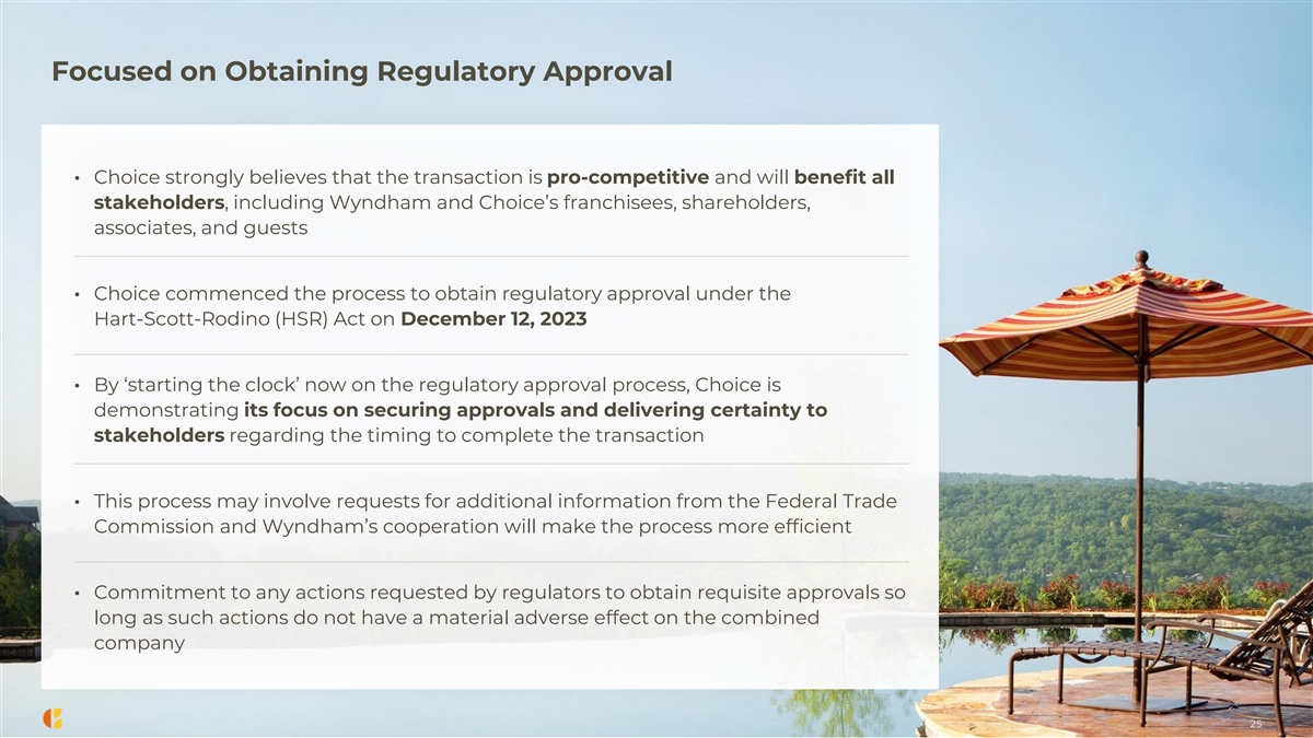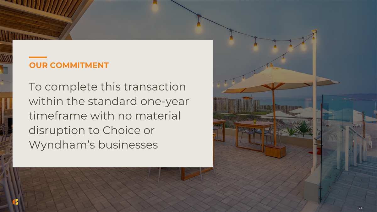 OUR COMMITMENT To complete this transaction within the standard one-year timeframe with no material disruption to Choice or Wyndham’s businesses 24