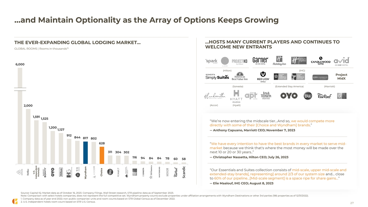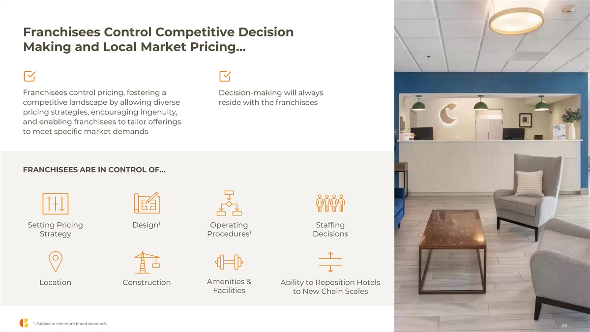 Franchisees Control Competitive Decision Making and Local Market Pricing… Franchisees control pricing, fostering a Decision-making will always competitive landscape by allowing diverse reside with the franchisees pricing strategies, encouraging ingenuity, and enabling franchisees to tailor offerings to meet specific market demands FRANCHISEES ARE IN CONTROL OF… 1 Setting Pricing Design Operating Staffing 1 Strategy Procedures Decisions Amenities & Location Construction Ability to Reposition Hotels Facilities to New Chain Scales 1. Subject to minimum brand standards. 26 26