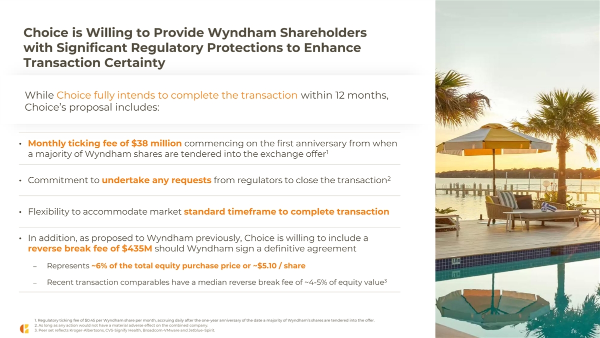 Focused on Obtaining Regulatory Approval • Choice strongly believes that the transaction is pro-competitive and will benefit all stakeholders, including Wyndham and Choice’s franchisees, shareholders, associates, and guests • Choice commenced the process to obtain regulatory approval under the Hart-Scott-Rodino (HSR) Act on December 12, 2023 • By ‘starting the clock’ now on the regulatory approval process, Choice is demonstrating its focus on securing approvals and delivering certainty to stakeholders regarding the timing to complete the transaction • This process may involve requests for additional information from the Federal Trade Commission and Wyndham’s cooperation will make the process more efficient • Commitment to any actions requested by regulators to obtain requisite approvals so long as such actions do not have a material adverse effect on the combined company 25