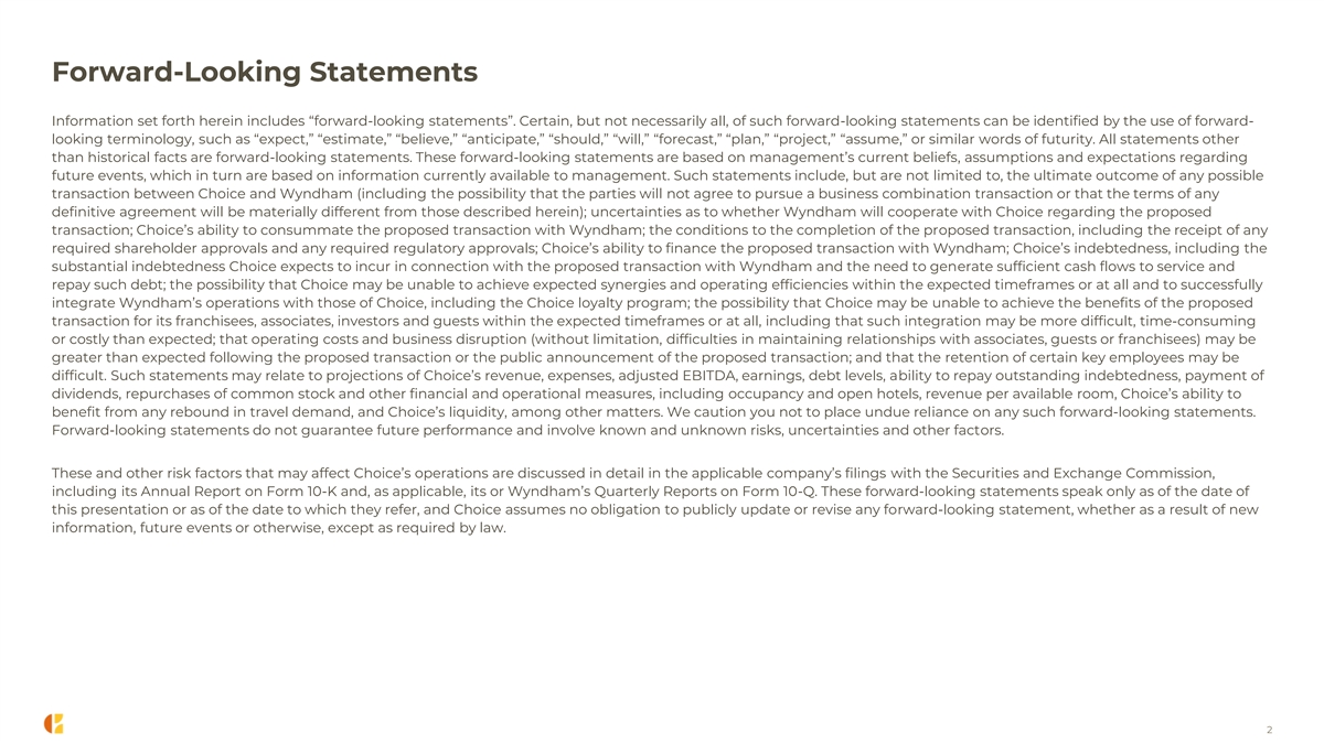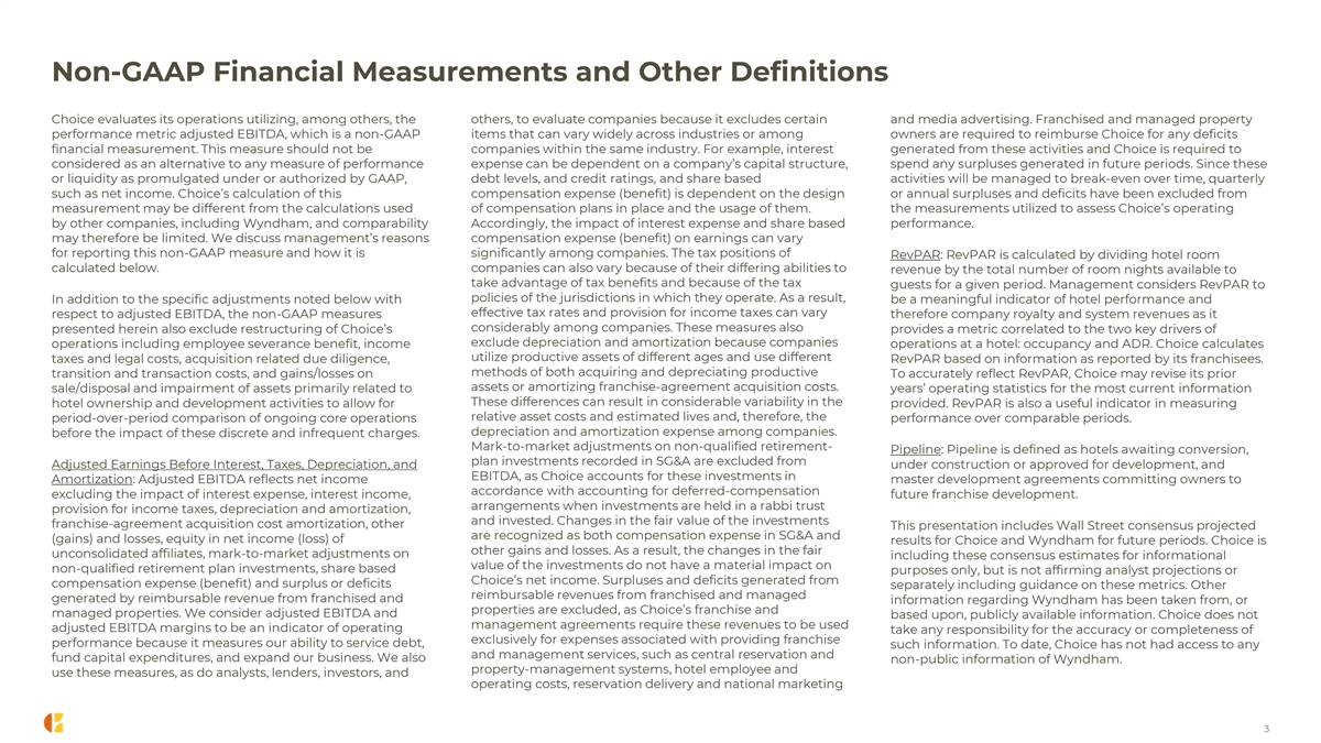 Forward-Looking Statements Information set forth herein includes “forward-looking statements”. Certain, but not necessarily all, of such forward-looking statements can be identified by the use of forward- looking terminology, such as “expect,” “estimate,” “believe,” “anticipate,” “should,” “will,” “forecast,” “plan,” “project,” “assume,” or similar words of futurity. All statements other than historical facts are forward-looking statements. These forward-looking statements are based on management’s current beliefs, assumptions and expectations regarding future events, which in turn are based on information currently available to management. Such statements include, but are not limited to, the ultimate outcome of any possible transaction between Choice and Wyndham (including the possibility that the parties will not agree to pursue a business combination transaction or that the terms of any definitive agreement will be materially different from those described herein); uncertainties as to whether Wyndham will cooperate with Choice regarding the proposed transaction; Choice’s ability to consummate the proposed transaction with Wyndham; the conditions to the completion of the proposed transaction, including the receipt of any required shareholder approvals and any required regulatory approvals; Choice’s ability to finance the proposed transaction with Wyndham; Choice’s indebtedness, including the substantial indebtedness Choice expects to incur in connection with the proposed transaction with Wyndham and the need to generate sufficient cash flows to service and repay such debt; the possibility that Choice may be unable to achieve expected synergies and operating efficiencies within the expected timeframes or at all and to successfully integrate Wyndham’s operations with those of Choice, including the Choice loyalty program; the possibility that Choice may be unable to achieve the benefits of the proposed transaction for its franchisees, associates, investors and guests within the expected timeframes or at all, including that such integration may be more difficult, time-consuming or costly than expected; that operating costs and business disruption (without limitation, difficulties in maintaining relationships with associates, guests or franchisees) may be greater than expected following the proposed transaction or the public announcement of the proposed transaction; and that the retention of certain key employees may be difficult. Such statements may relate to projections of Choice’s revenue, expenses, adjusted EBITDA, earnings, debt levels, ability to repay outstanding indebtedness, payment of dividends, repurchases of common stock and other financial and operational measures, including occupancy and open hotels, revenue per available room, Choice’s ability to benefit from any rebound in travel demand, and Choice’s liquidity, among other matters. We caution you not to place undue reliance on any such forward-looking statements. Forward-looking statements do not guarantee future performance and involve known and unknown risks, uncertainties and other factors. These and other risk factors that may affect Choice’s operations are discussed in detail in the applicable company’s filings with the Securities and Exchange Commission, including its Annual Report on Form 10-K and, as applicable, its or Wyndham’s Quarterly Reports on Form 10-Q. These forward-looking statements speak only as of the date of this presentation or as of the date to which they refer, and Choice assumes no obligation to publicly update or revise any forward-looking statement, whether as a result of new information, future events or otherwise, except as required by law. 2