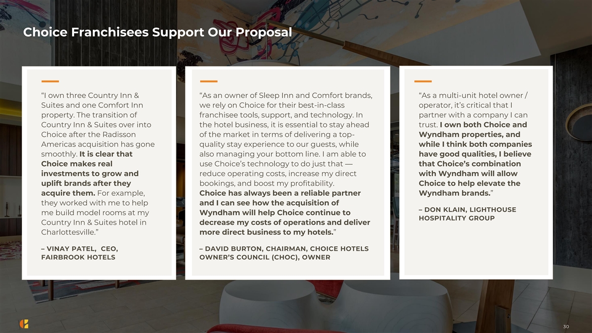 Choice Franchisees Support Our Proposal “I own three Country Inn & “As an owner of Sleep Inn and Comfort brands, “As a multi-unit hotel owner / Suites and one Comfort Inn we rely on Choice for their best-in-class operator, it’s critical that I property. The transition of franchisee tools, support, and technology. In partner with a company I can Country Inn & Suites over into the hotel business, it is essential to stay ahead trust. I own both Choice and Choice after the Radisson of the market in terms of delivering a top- Wyndham properties, and Americas acquisition has gone quality stay experience to our guests, while while I think both companies smoothly. It is clear that also managing your bottom line. I am able to have good qualities, I believe Choice makes real use Choice’s technology to do just that — that Choice’s combination investments to grow and reduce operating costs, increase my direct with Wyndham will allow uplift brands after they bookings, and boost my profitability. Choice to help elevate the acquire them. For example, Choice has always been a reliable partner Wyndham brands.” they worked with me to help and I can see how the acquisition of – DON KLAIN, LIGHTHOUSE me build model rooms at my Wyndham will help Choice continue to HOSPITALITY GROUP Country Inn & Suites hotel in decrease my costs of operations and deliver Charlottesville.” more direct business to my hotels.” – VINAY PATEL, CEO, – DAVID BURTON, CHAIRMAN, CHOICE HOTELS FAIRBROOK HOTELS OWNER’S COUNCIL (CHOC), OWNER 30