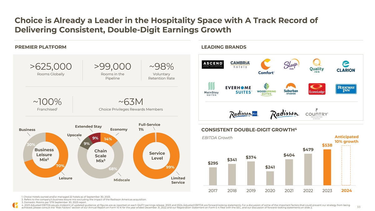 Combined Company Has An Enhanced Ability to Expand Within a Massive Total Addressable Market Choice’s expanded ecosystem and network is better positioned to fulfill long term lodging growth drivers SUPPORTED BY STRONG MACRO AND INDUSTRY TRENDS LARGE TOTAL ADDRESSABLE MARKET… Retirements — 1 in every 5 Americans are expected to be over 65 by 2030 Global Lodging 2028 $744B Rising Wages — The average American salary was 8% higher in February 2023 compared to a year ago +$720B …And Growing Global Lodging 2022 $411B Remote Work — More guests are extending weekend leisure trips to include “shoulder days” (Thursday/Sunday) +$387B US Lodging Road Trips — Two-thirds of all Americans are planned to $133B take a road trip in 2023 Large Addressable Market… +$108B Rebuilding — Industry experts estimate that investments + WH associated with the Infrastructure Investment and Jobs $25B Acts will generate between 50-100M room nights over the next decade $12B Source: Euromonitor International Ltd., Travel 2023ed. YoY ex rates, current prices. 32 Note: Total addressable market reflects upscale, mid-market and budget hotels.