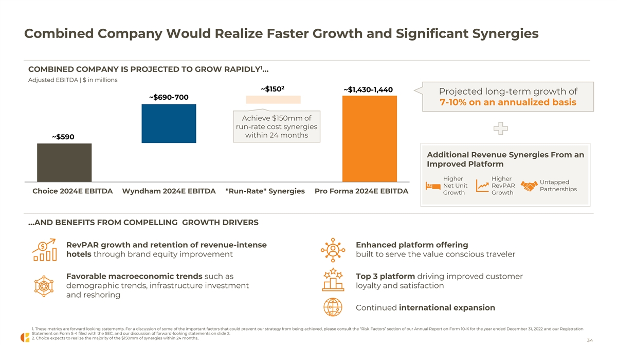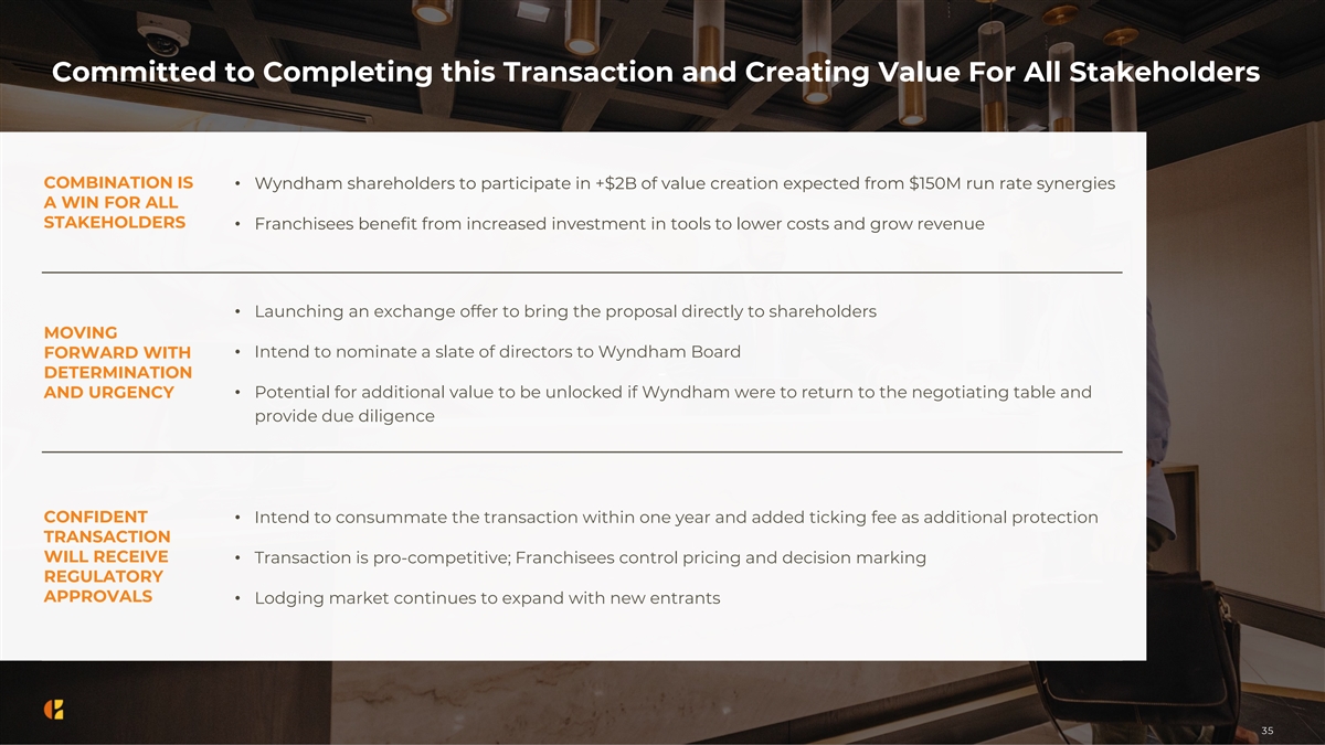Combined Company Would Realize Faster Growth and Significant Synergies 1 COMBINED COMPANY IS PROJECTED TO GROW RAPIDLY … Adjusted EBITDA | $ in millions 2 ~$150 ~$1,430-1,440 Projected long-term growth of ~$690-700 7-10% on an annualized basis Achieve $150mm of run-rate cost synergies within 24 months ~$590 Additional Revenue Synergies From an Improved Platform Higher Higher Untapped Net Unit RevPAR Partnerships Choice 2024E EBITDA Wyndham 2024E EBITDA Run-Rate Synergies Pro Forma 2024E EBITDA Growth Growth …AND BENEFITS FROM COMPELLING GROWTH DRIVERS RevPAR growth and retention of revenue-intense Enhanced platform offering hotels through brand equity improvement built to serve the value conscious traveler Favorable macroeconomic trends such as Top 3 platform driving improved customer demographic trends, infrastructure investment loyalty and satisfaction and reshoring Continued international expansion 1. These metrics are forward looking statements. For a discussion of some of the important factors that could prevent our strategy from being achieved, please consult the “Risk Factors” section of our Annual Report on Form 10-K for the year ended December 31, 2022 and our Registration Statement on Form S-4 filed with the SEC, and our discussion of forward-looking statements on slide 2. 2. Choice expects to realize the majority of the $150mm of synergies within 24 months.. 34