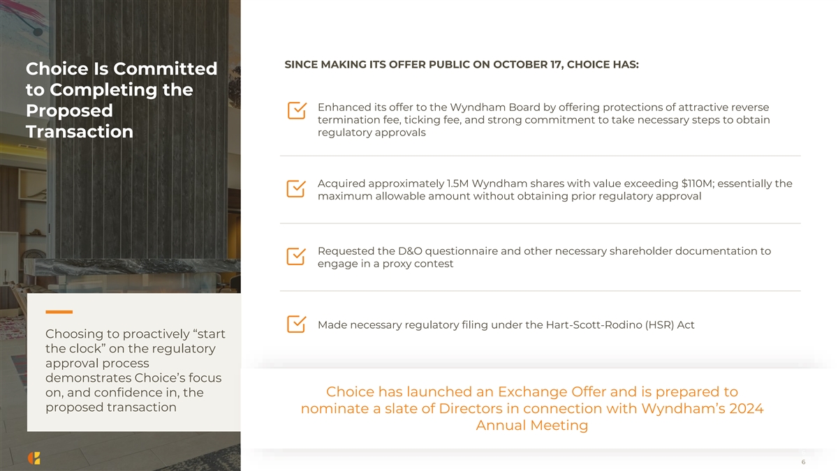 Highly Compelling Proposed Transaction with Clear Path to Completion • Combination is a win for all stakeholders of both respective companies: franchisees, guests, shareholders, and associates • Stakeholder sentiment overwhelmingly positive, acknowledging benefits STRONG STRATEGIC 1 • Combined company with broadened offering and expanding $744B market for value conscious guests RATIONALE • Addresses key concerns of franchisees by further lowering operating costs by further lowering operating costs (including labor and distribution), lessening reliance on OTAs, and leveraging Choice’s proprietary technologies • Combination offers real value – we believe that our offer meaningfully exceeds the risk-adjusted value of Wyndham’s standalone growth plan • Allows Wyndham shareholders to participate in potential future +$2B of value creation expected from $150M run-rate synergies COMPELLING FINANCIAL • Choice trades at an attractive level given its strong growth profile, representing compelling consideration for Wyndham PROPOSAL shareholders 2 • Shareholders will also have opportunity to elect their cash/stock consideration mix subject to customary proration mechanism • Choice may be able to unlock additional value with access to due diligence • Choice has acquired more than $110M of Wyndham stock and made its Hart-Scott-Rodino (HSR) filing - confident this transaction is highly pro-competitive and will receive regulatory approval within one year CHOICE IS • Significant reverse termination and ticking fee under prior proposal, meant to address perceived risks and underscore confidence COMMITTED in obtaining regulatory approvals TO THE • Wyndham’s refusal to explore a transaction has left Choice no option but to present its compelling proposal directly to Wyndham TRANSACTION 3 shareholders via an exchange offer with terms consistent with what was previously proposed to Wyndham • Choice is prepared to nominate a full slate of potential Wyndham directors for the 2024 Annual Shareholder Meeting 1. Source: Euromonitor International Ltd., Travel 2023ed. YoY ex rates, current prices. 2. Subject to standard proration such that the aggregate cash consideration in the transaction shall not exceed $49.50 per share provided for in the exchange offer. 5 3. Exchange offer comprises $49.50 in cash and 0.324 shares of Choice for each share of Wyndham common stock.